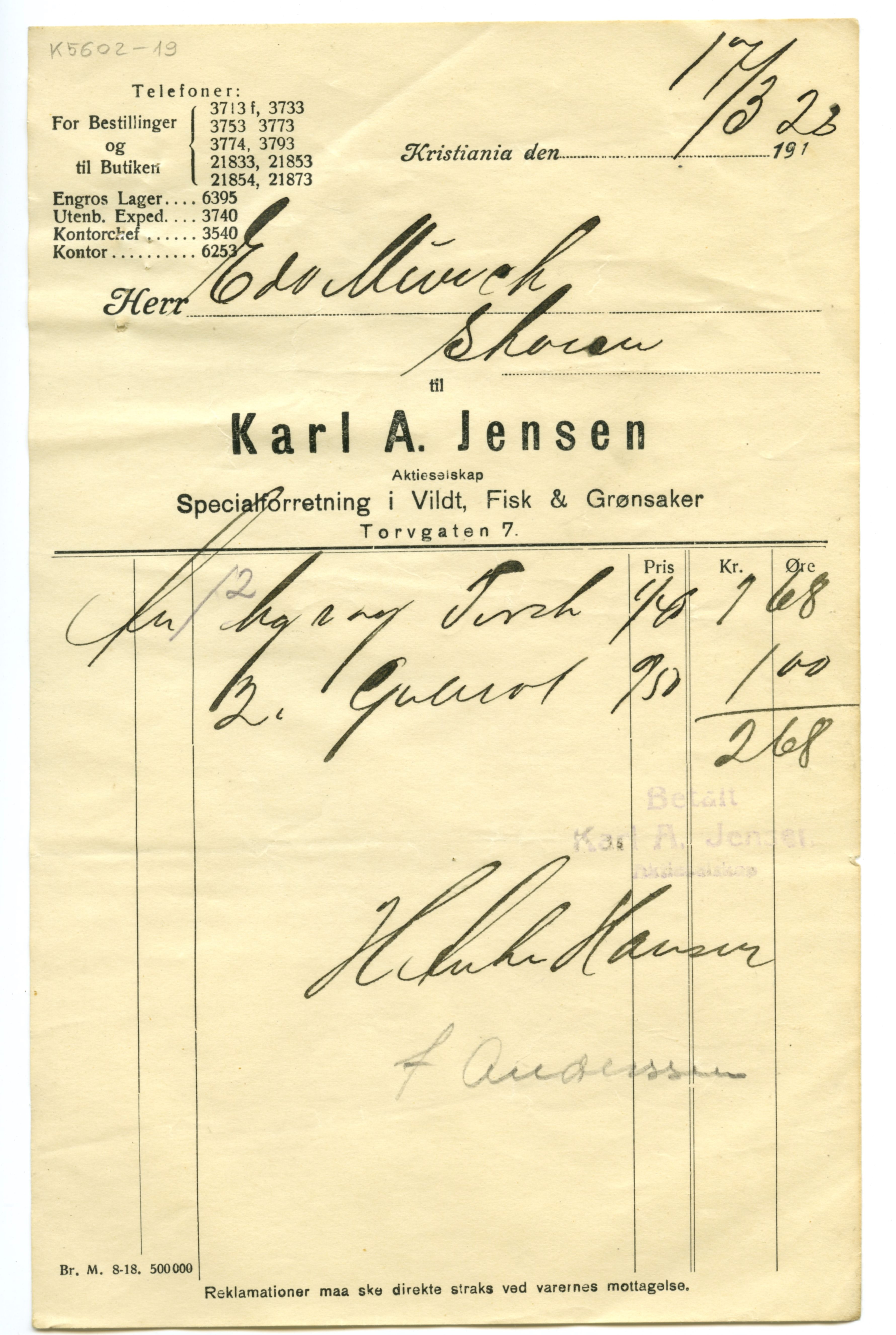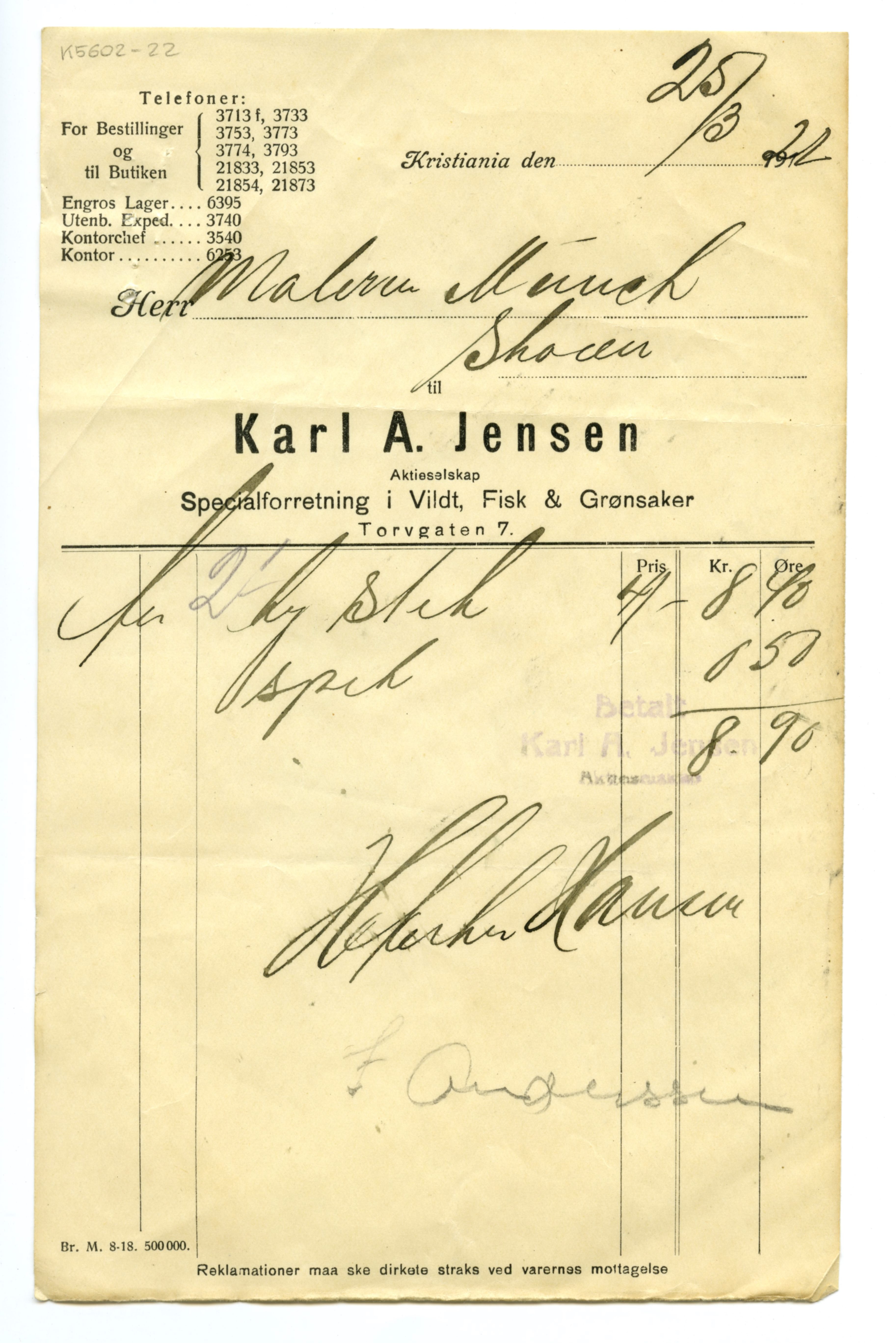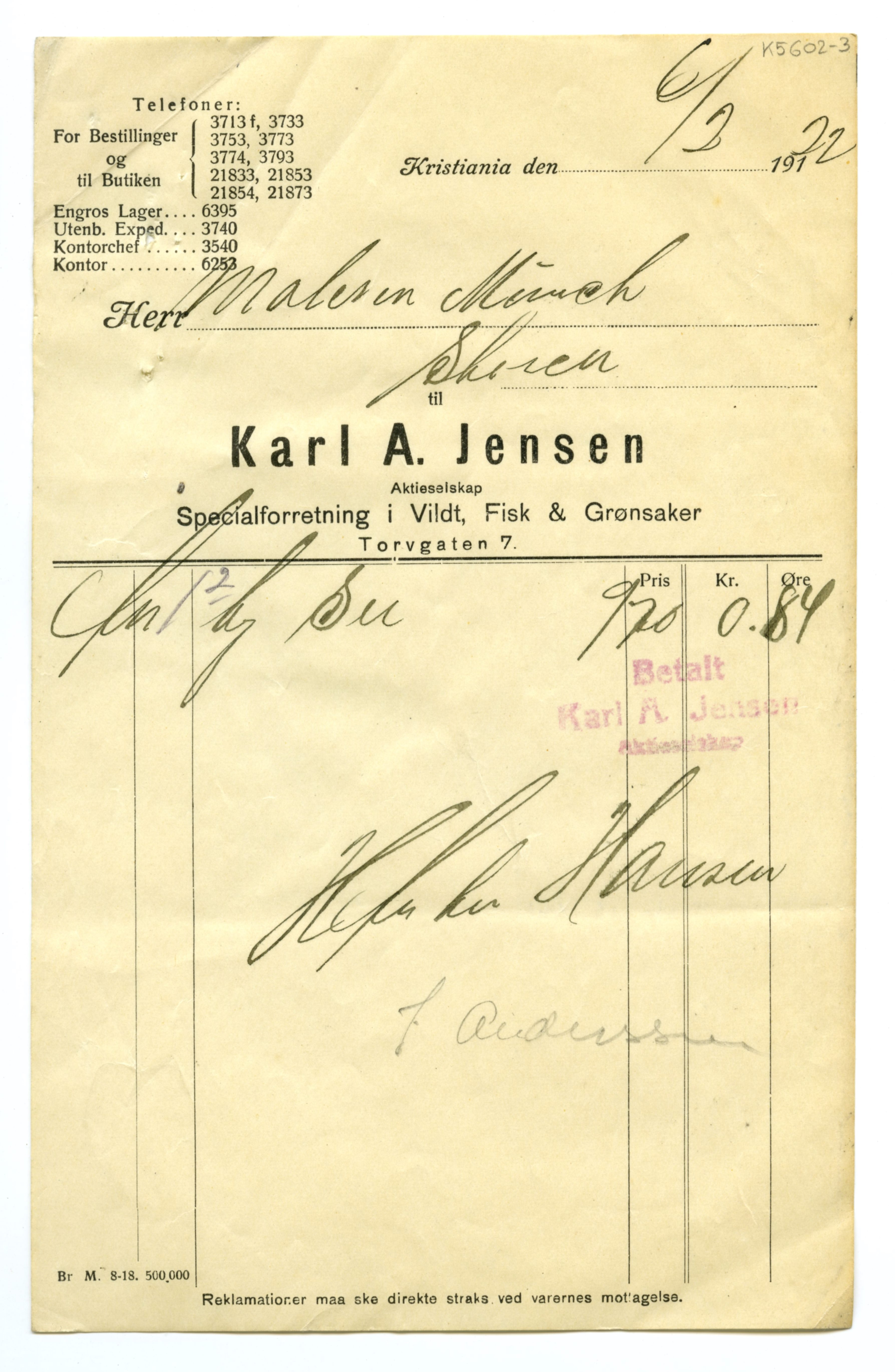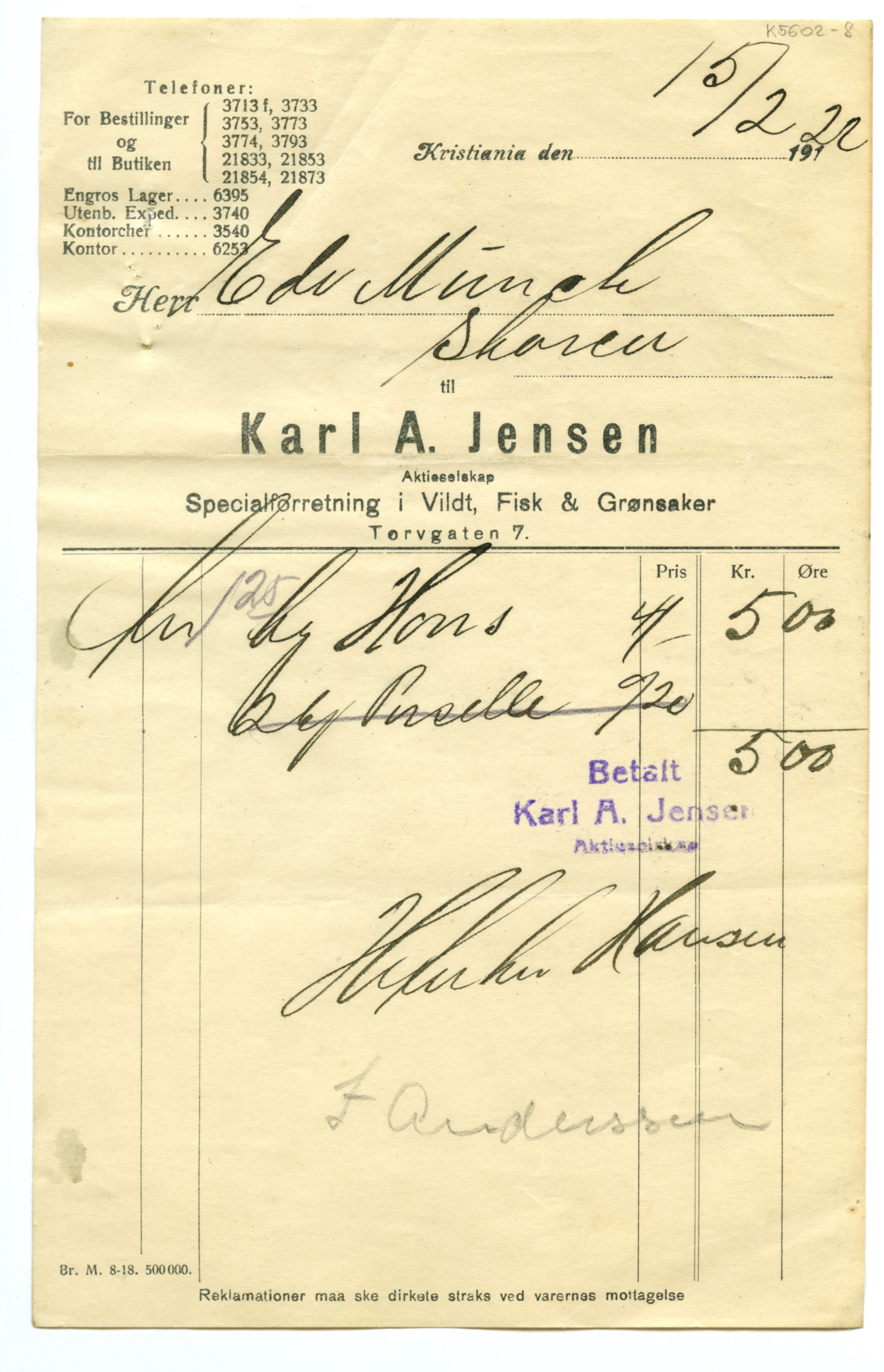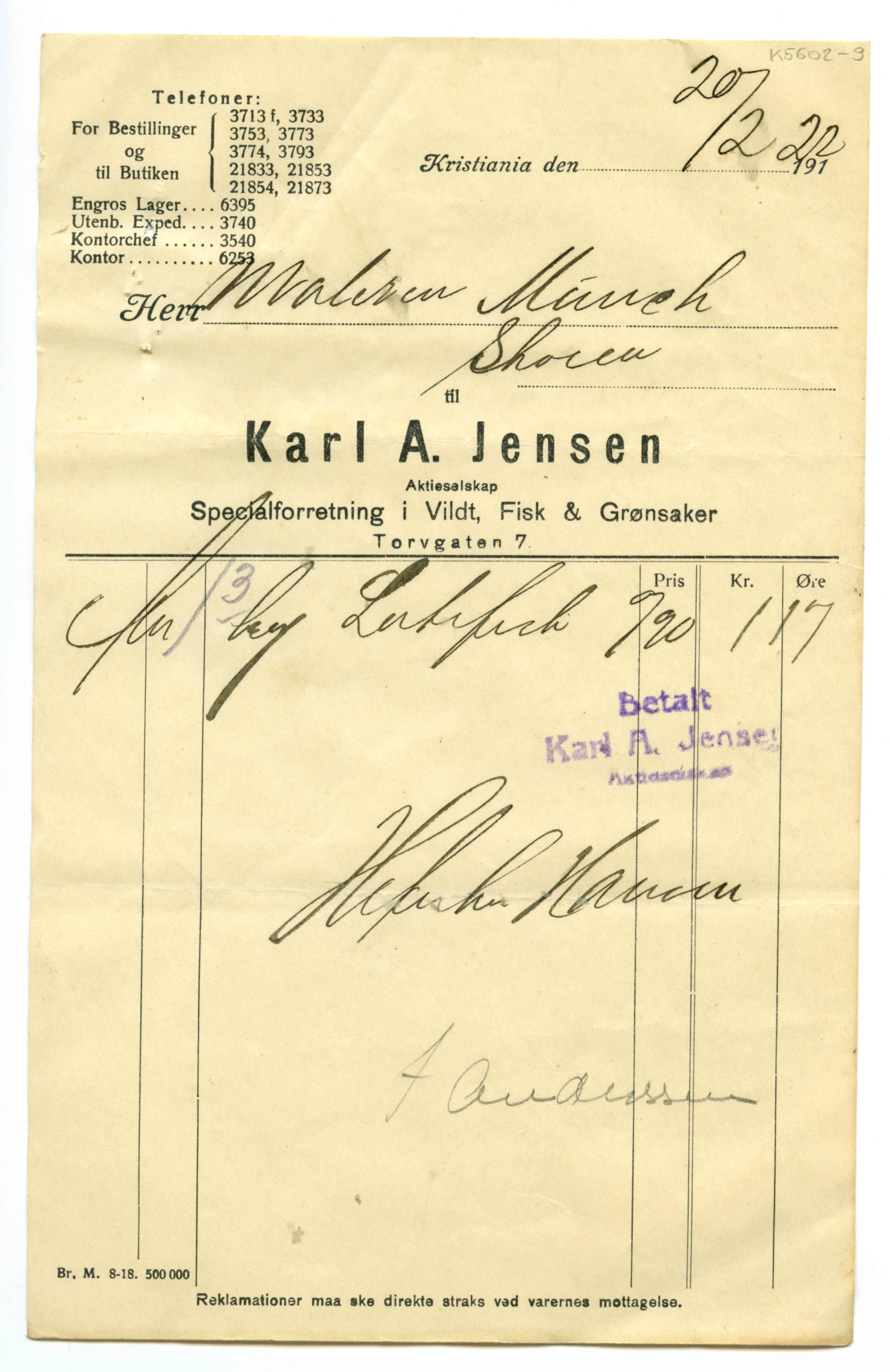 MM K 5602, Munchmuseet. Datert 02.02.1922. Brev fra Fisk & Grønsaker Karl A. Jensen Aktieselskap Specialforretning i Vildt.