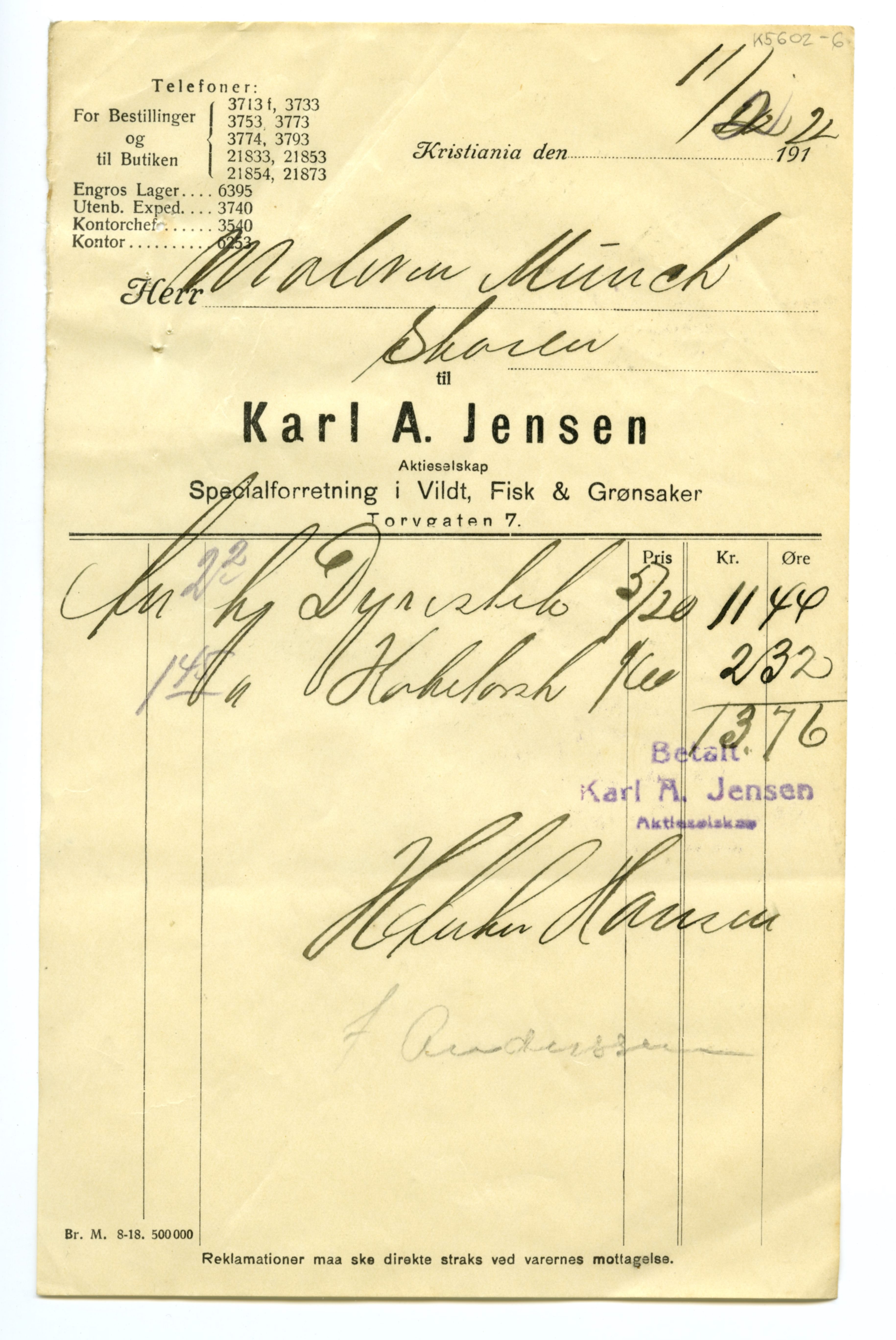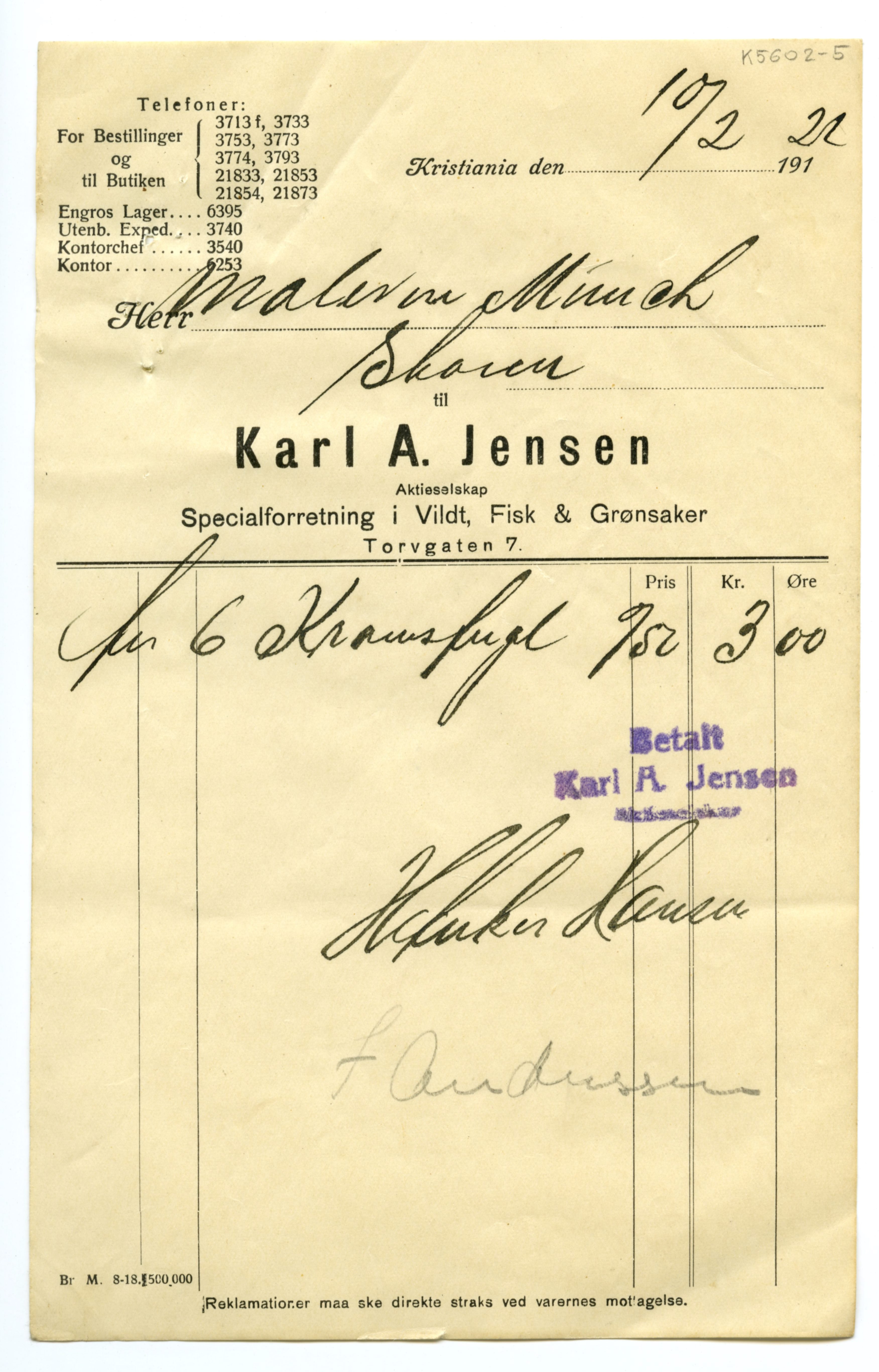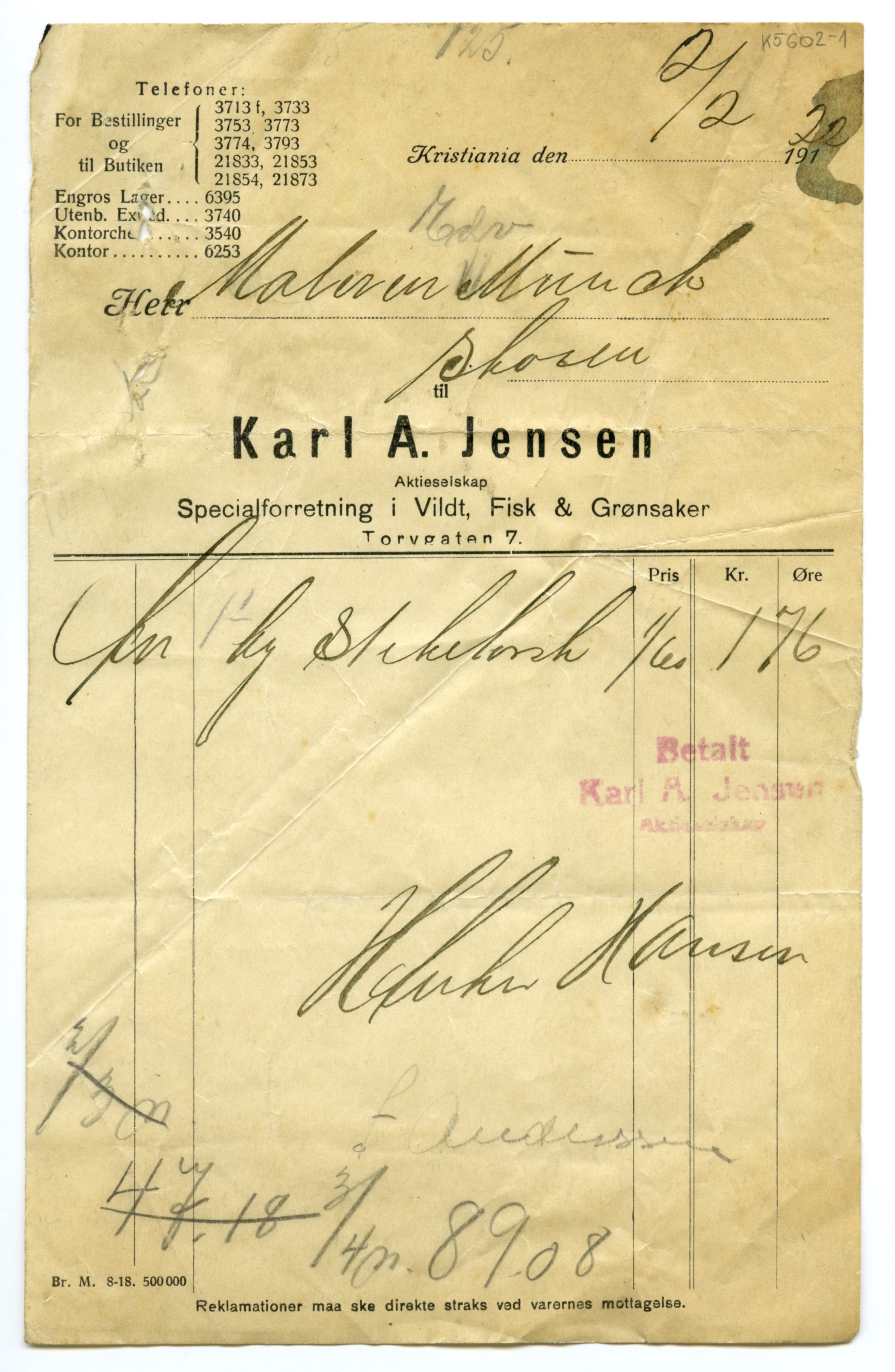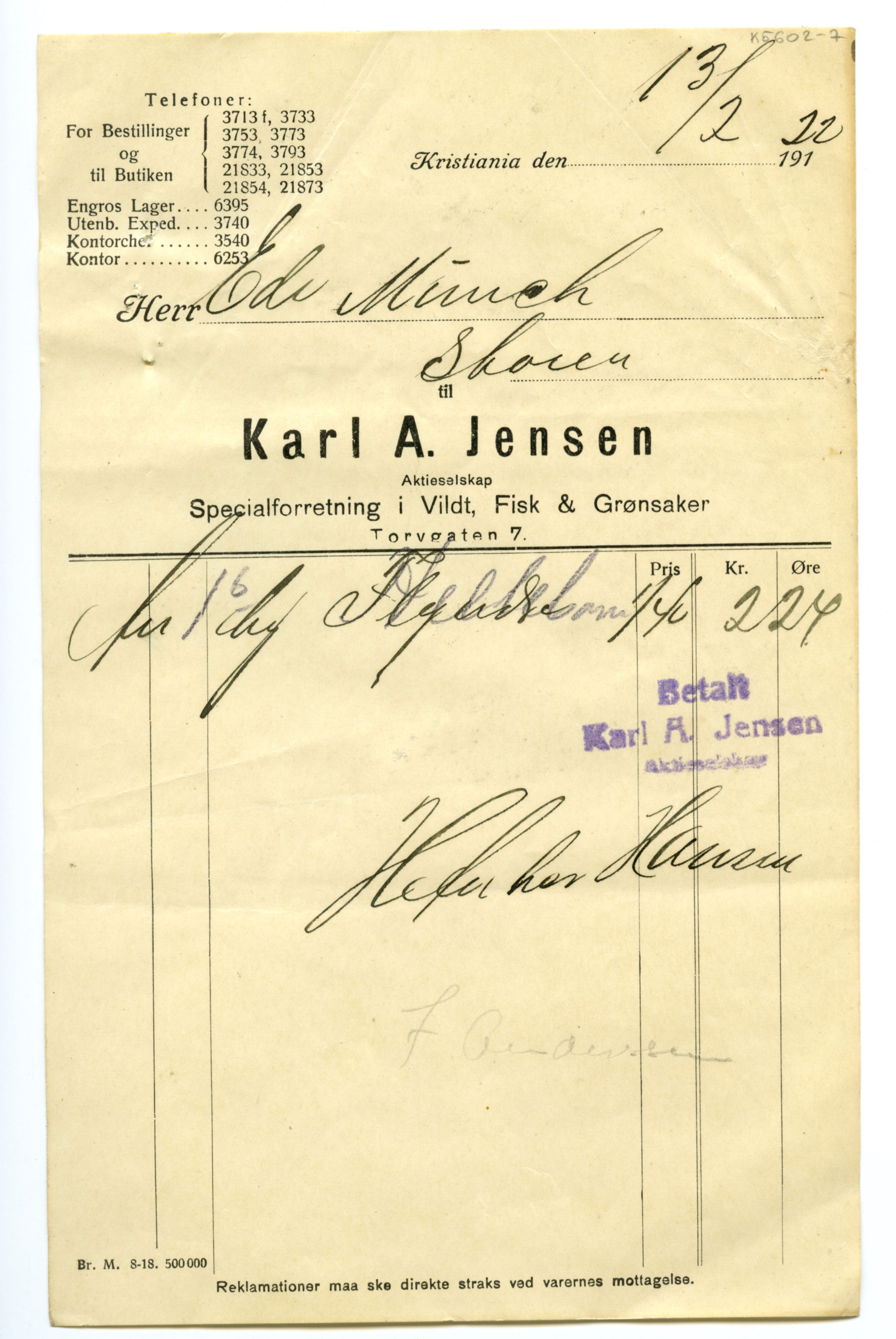 MM K 5602, Munchmuseet. Datert 02.02.1922. Brev fra Fisk & Grønsaker Karl A. Jensen Aktieselskap Specialforretning i Vildt.