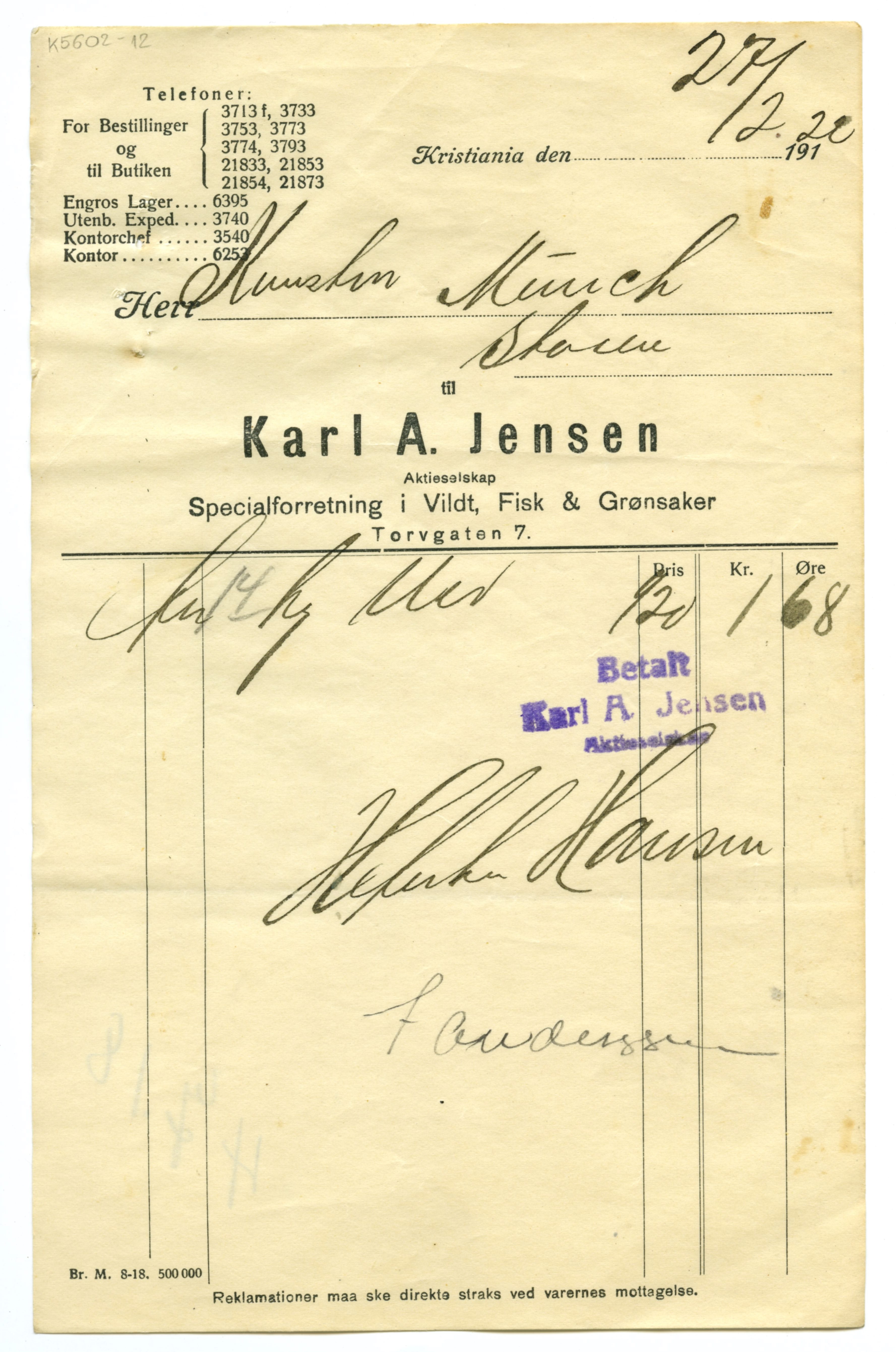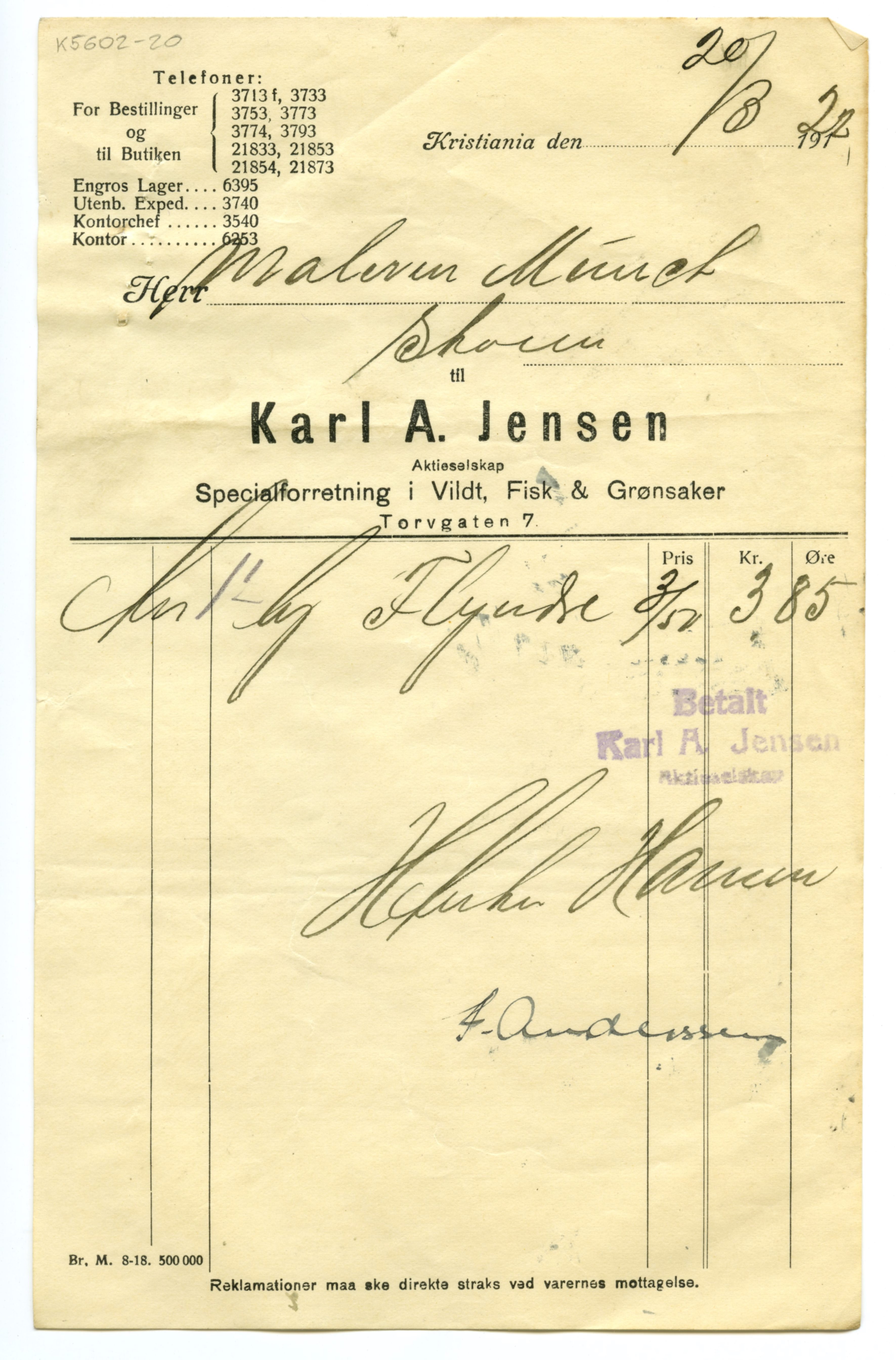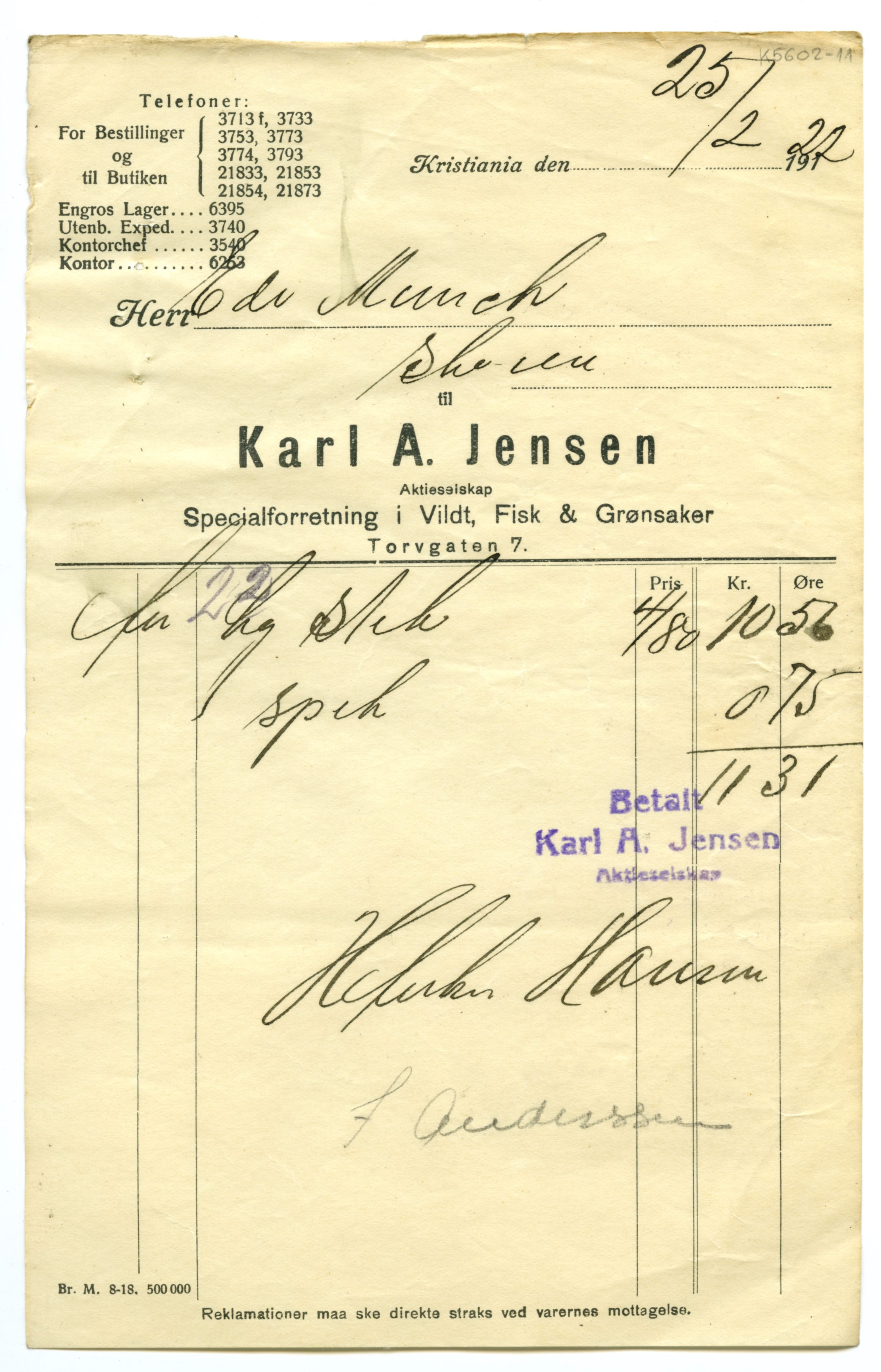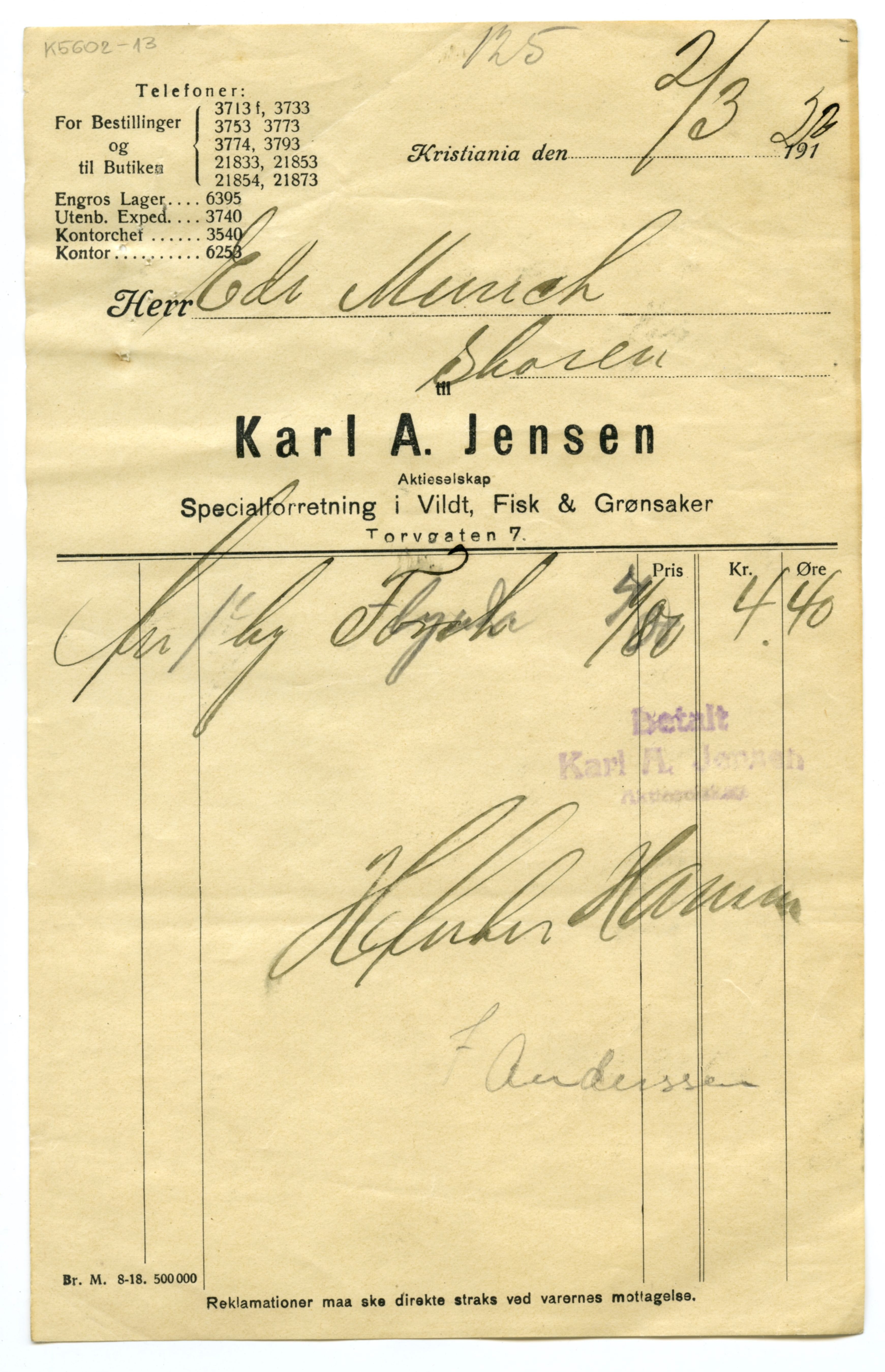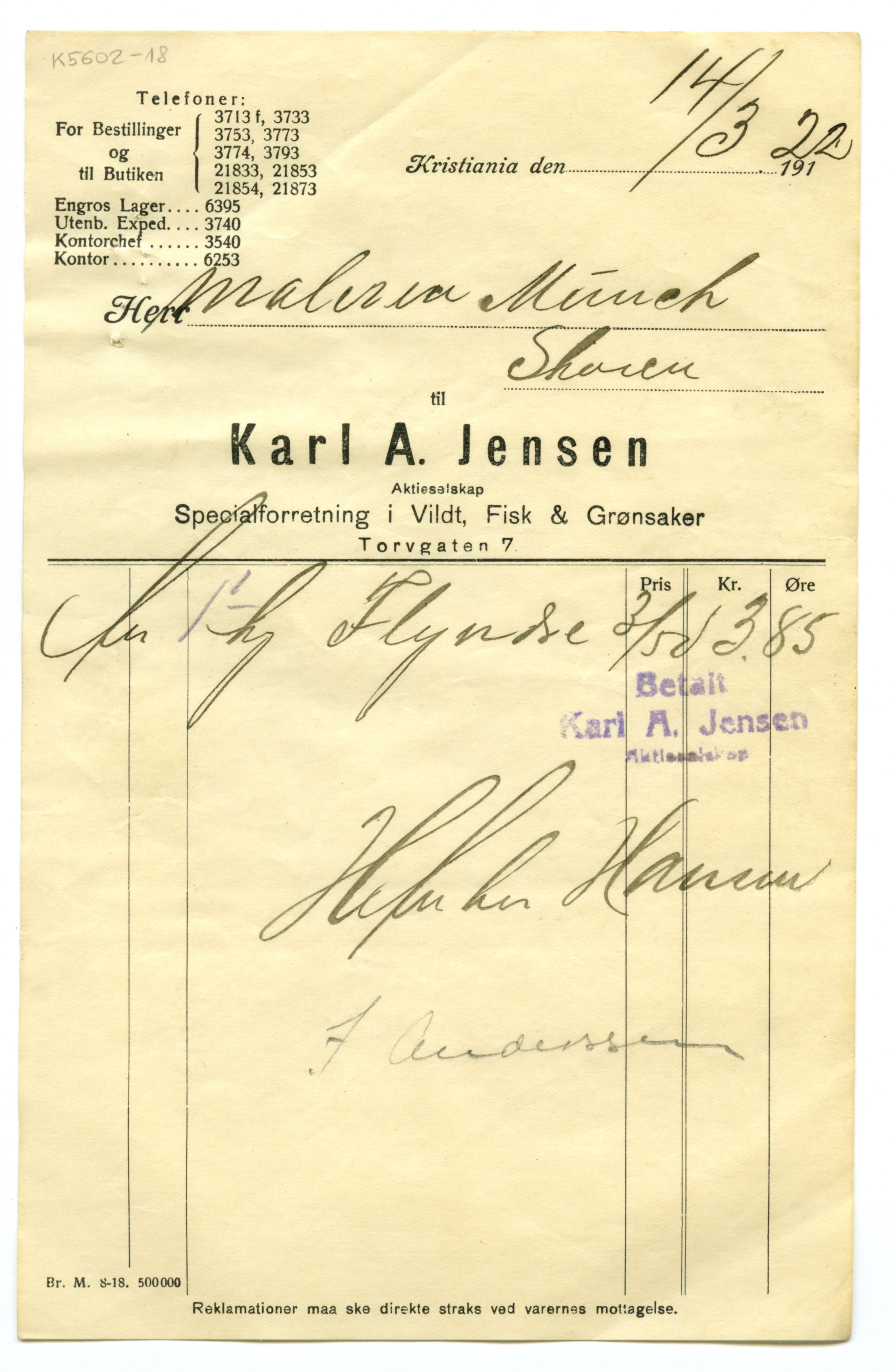 MM K 5602, Munchmuseet. Datert 02.02.1922. Brev fra Fisk & Grønsaker Karl A. Jensen Aktieselskap Specialforretning i Vildt.