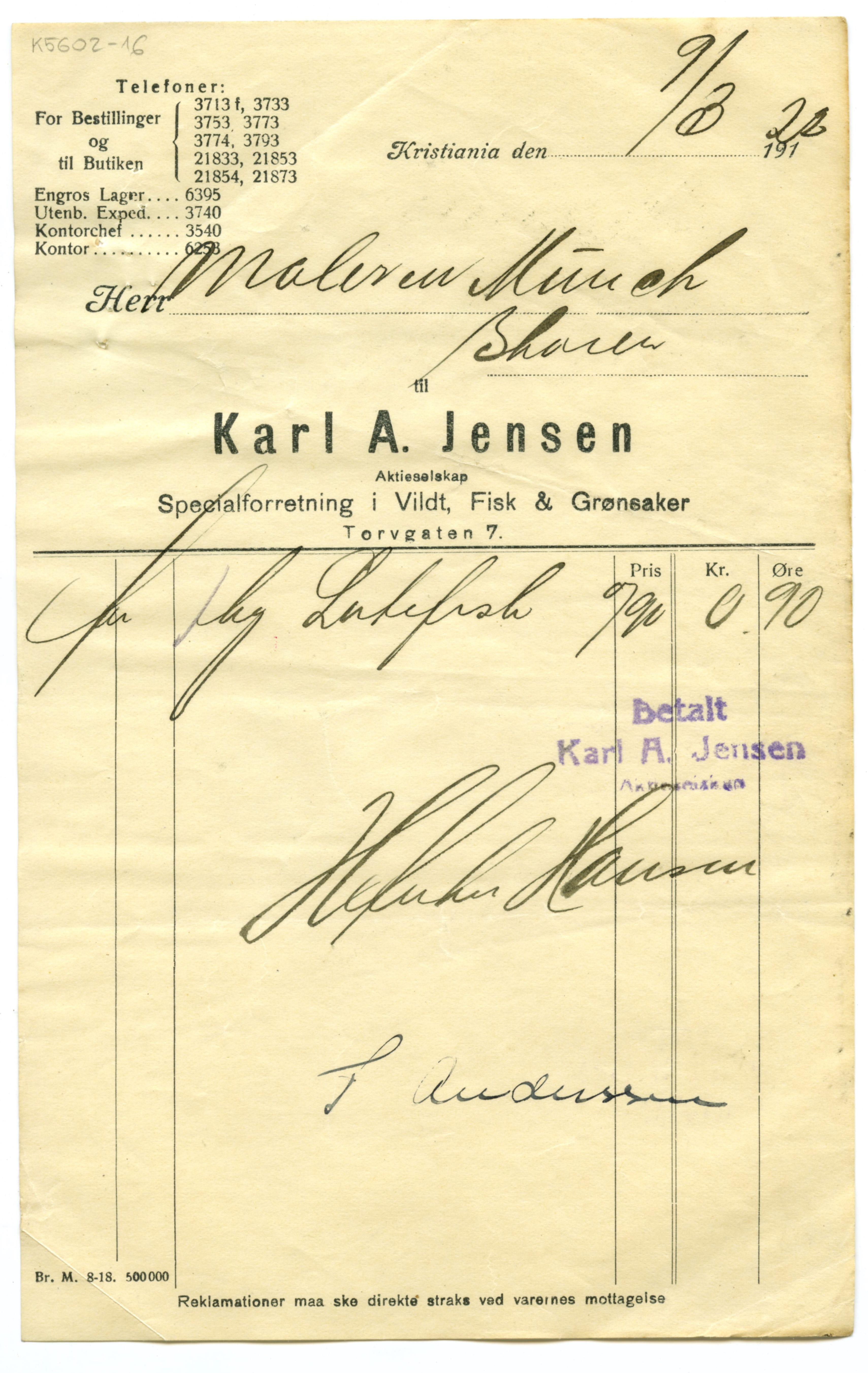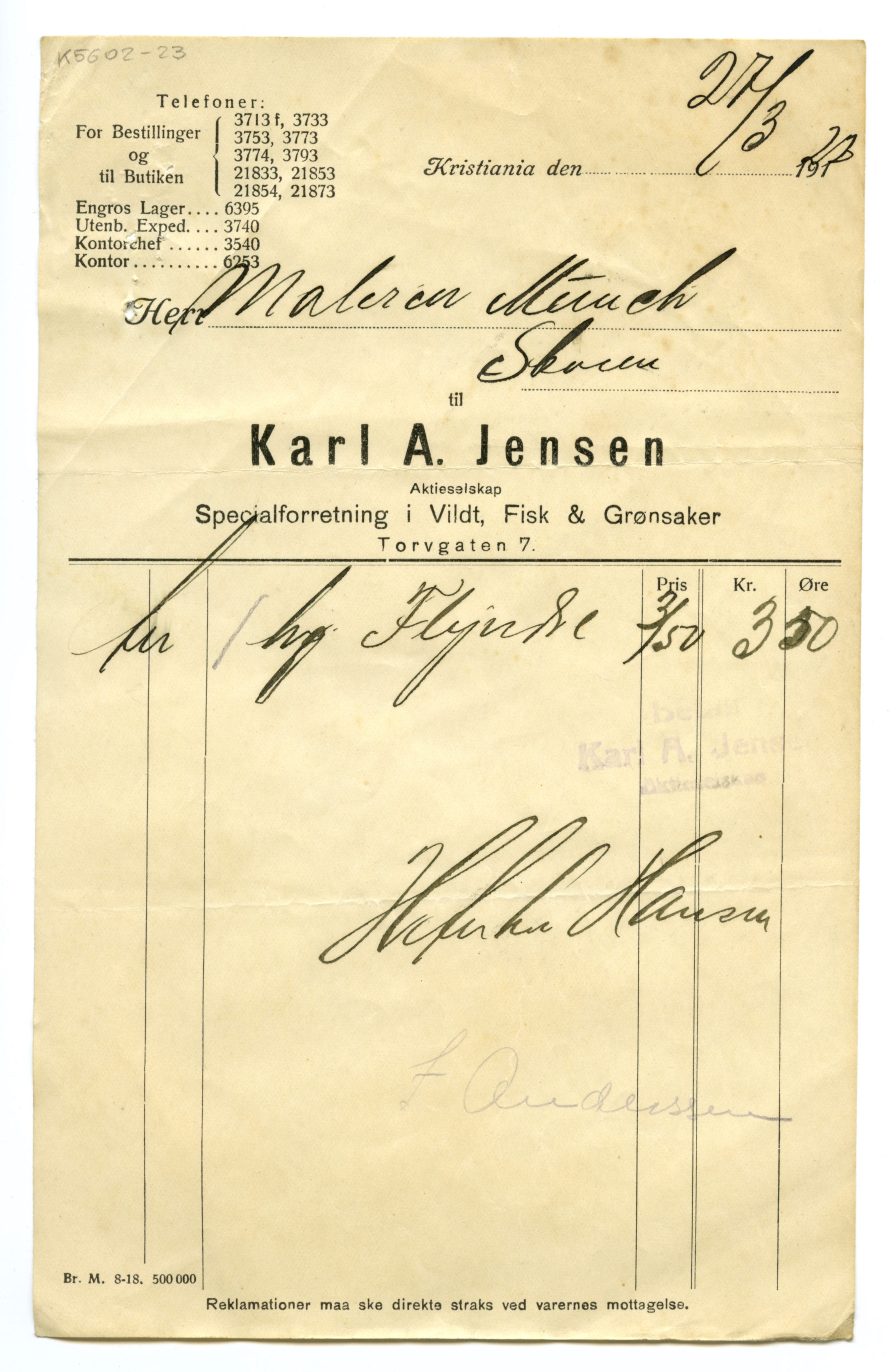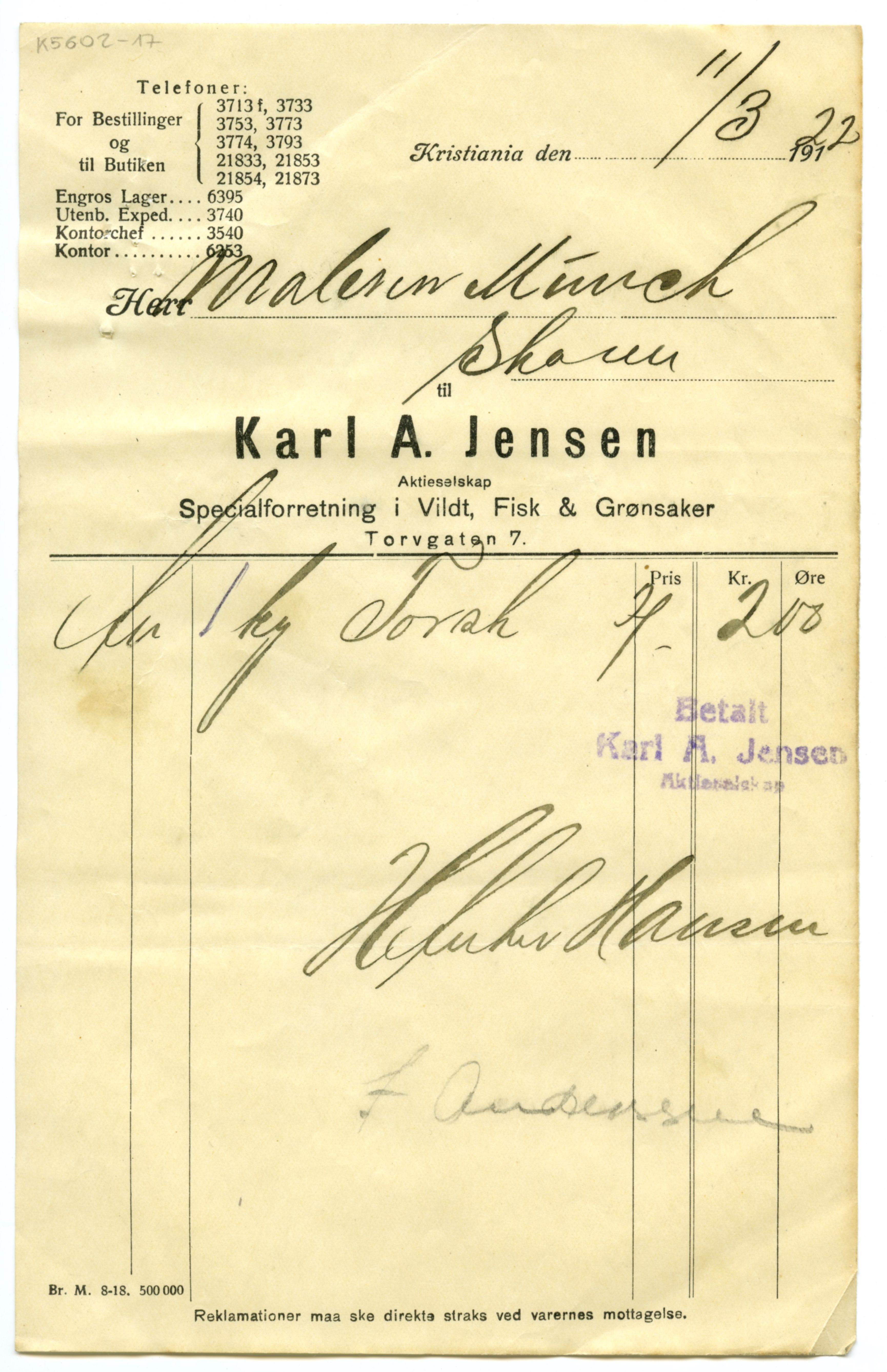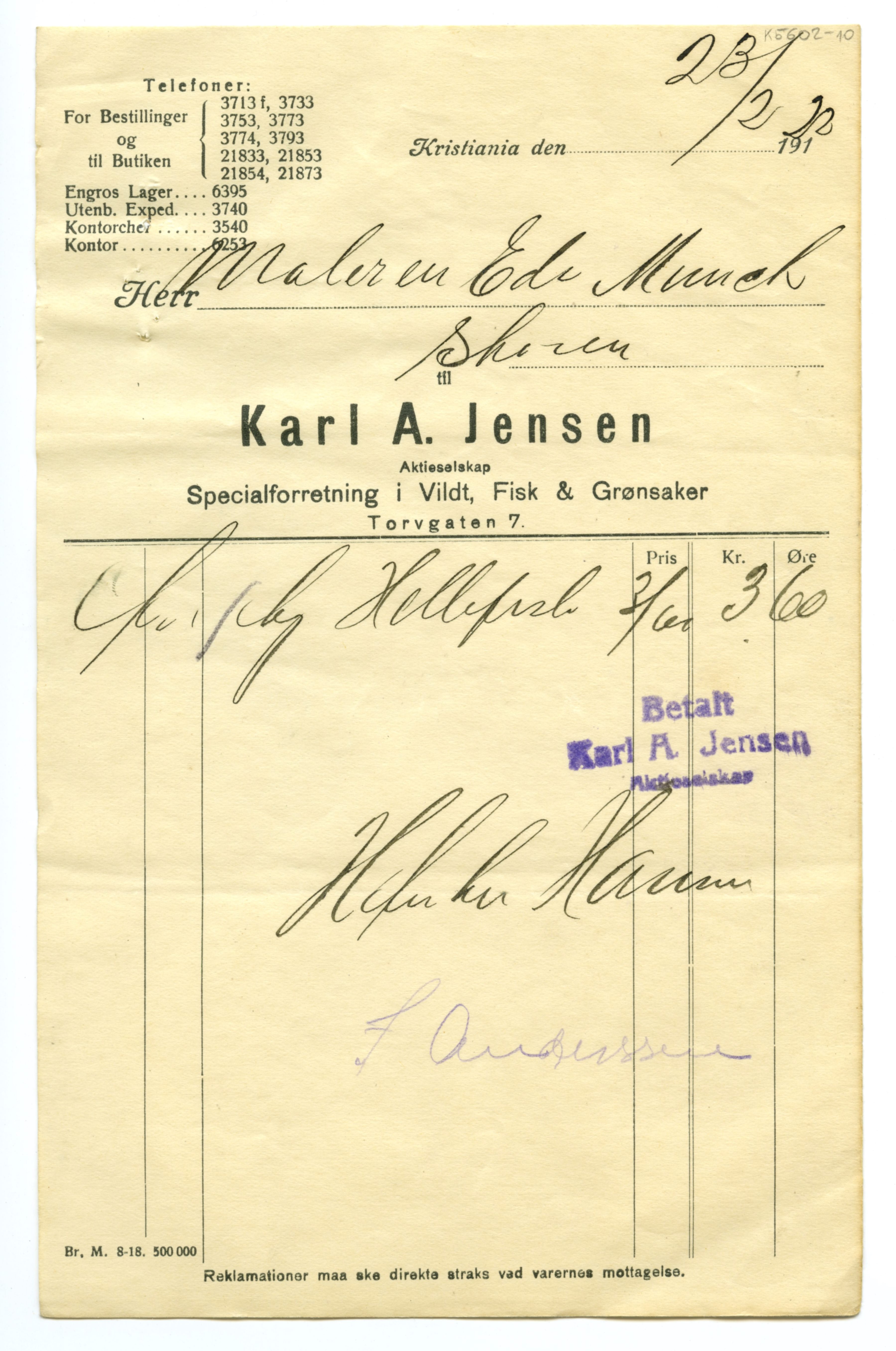 MM K 5602, Munchmuseet. Datert 02.02.1922. Brev fra Fisk & Grønsaker Karl A. Jensen Aktieselskap Specialforretning i Vildt.