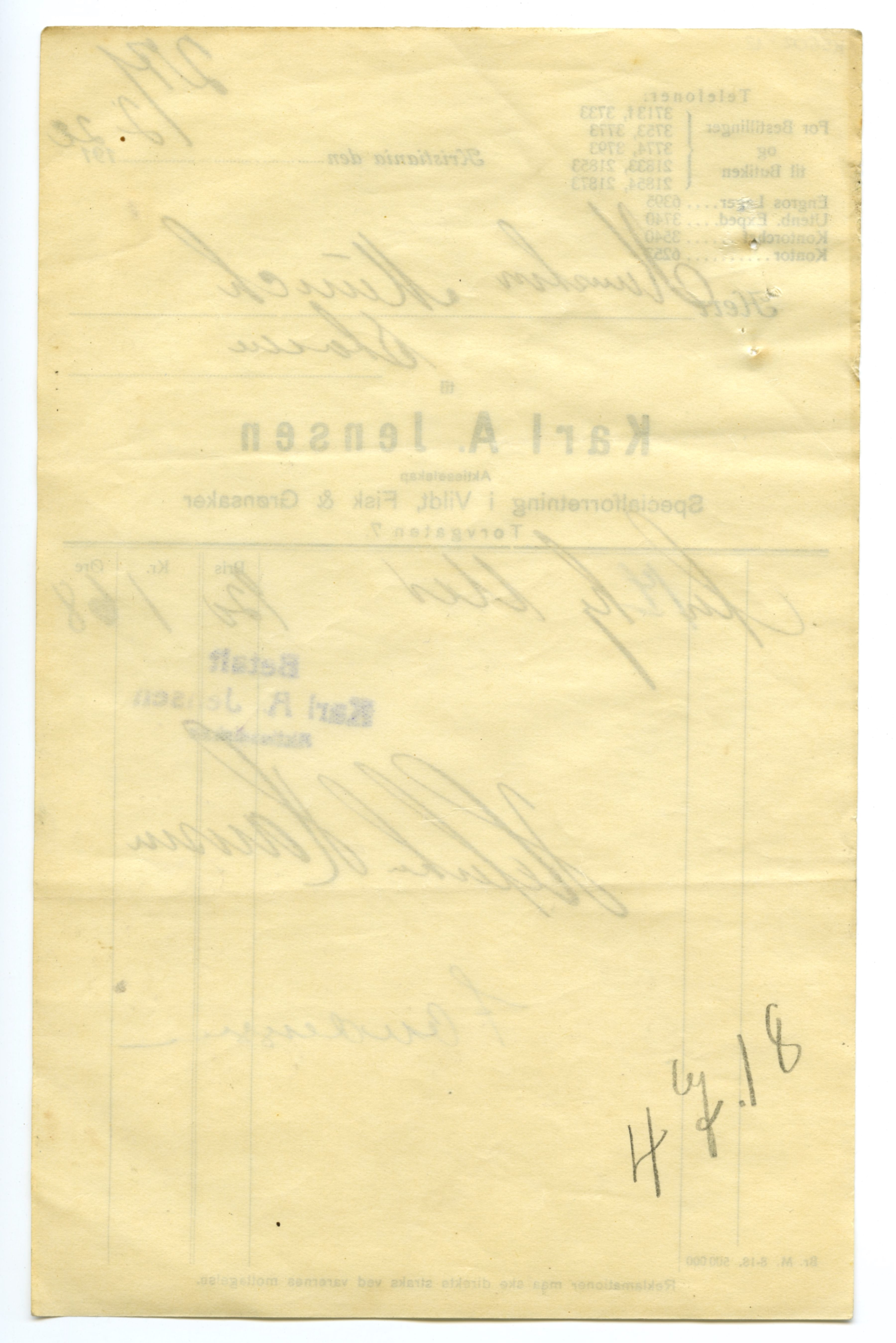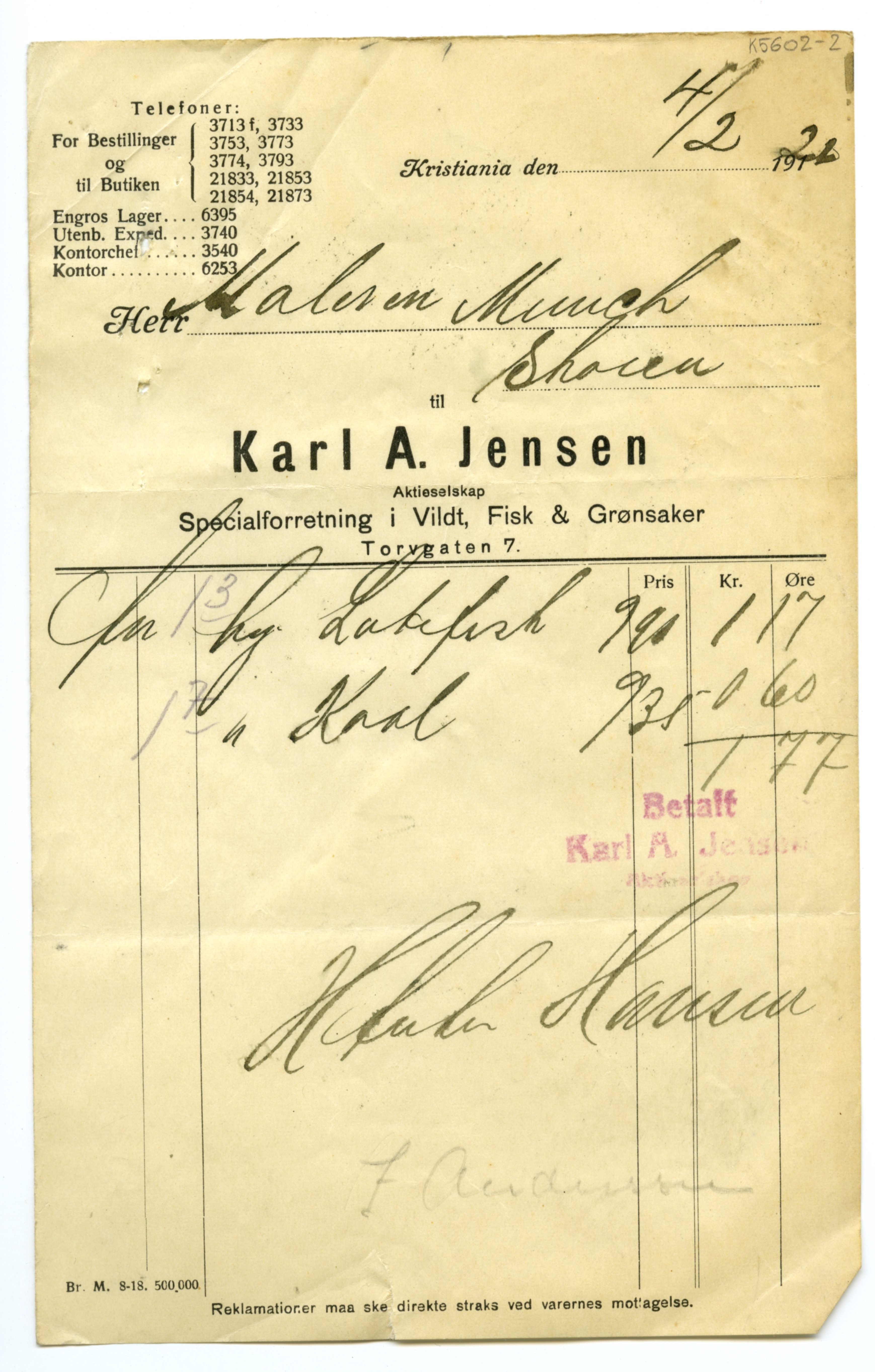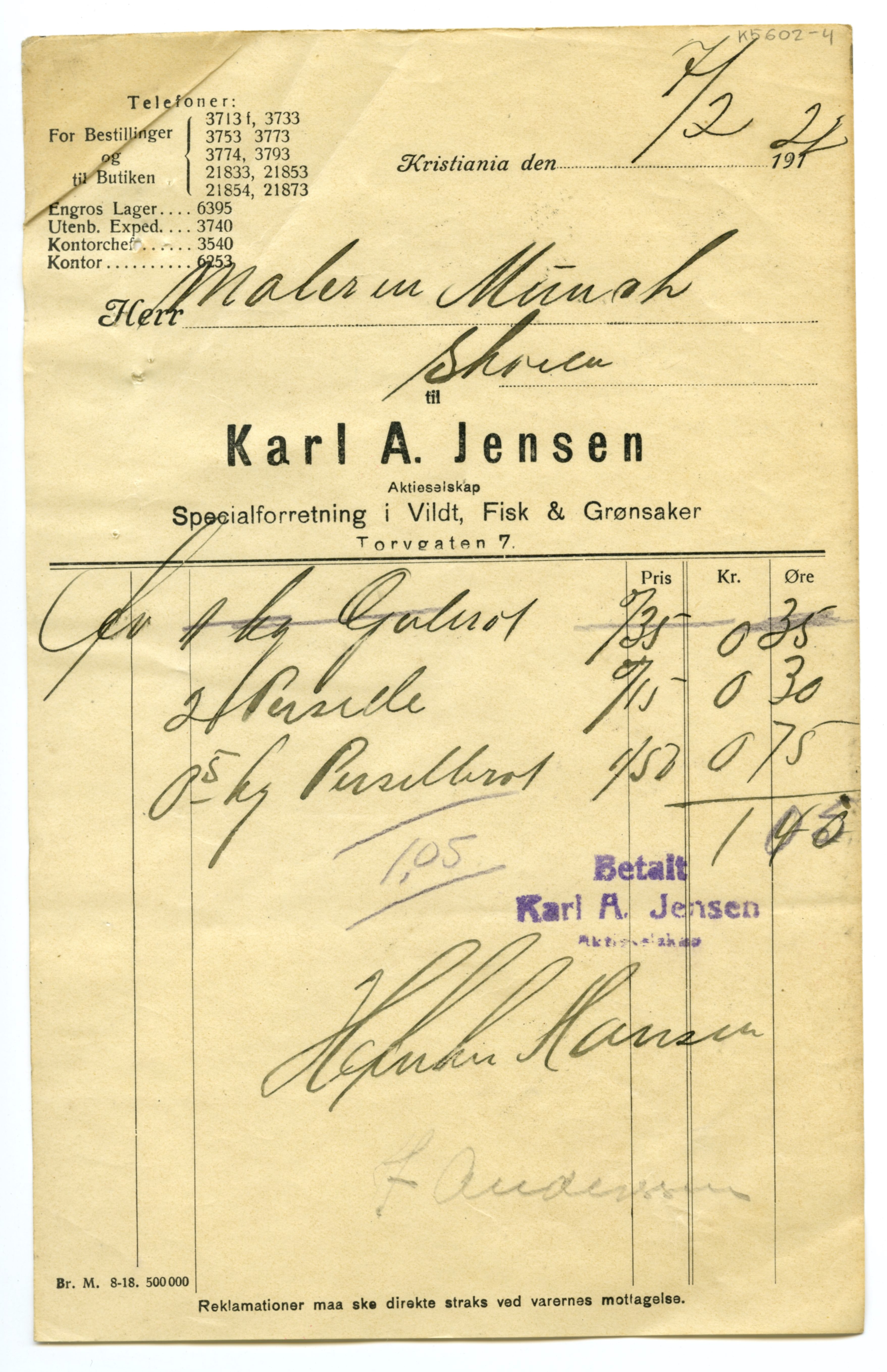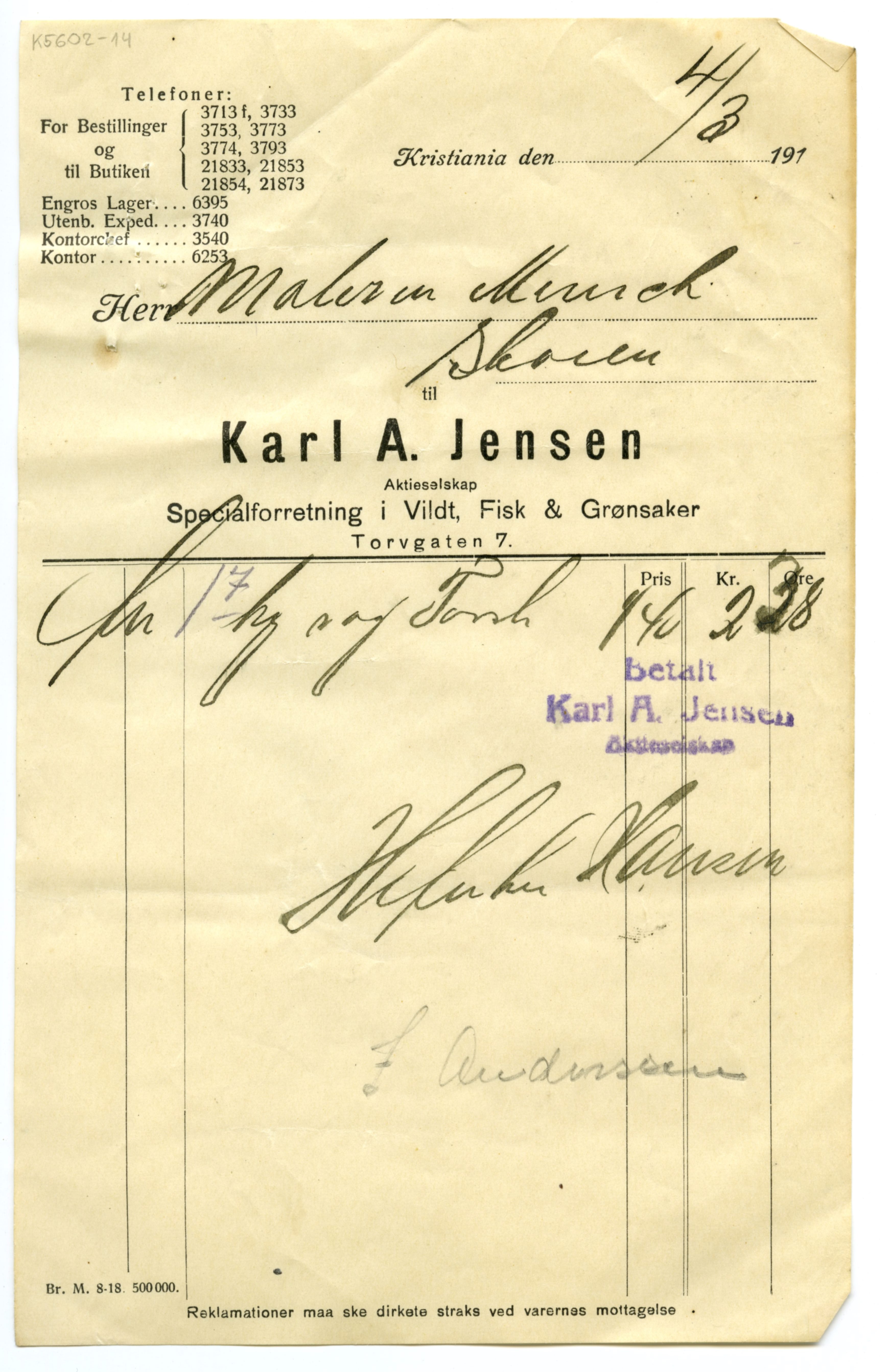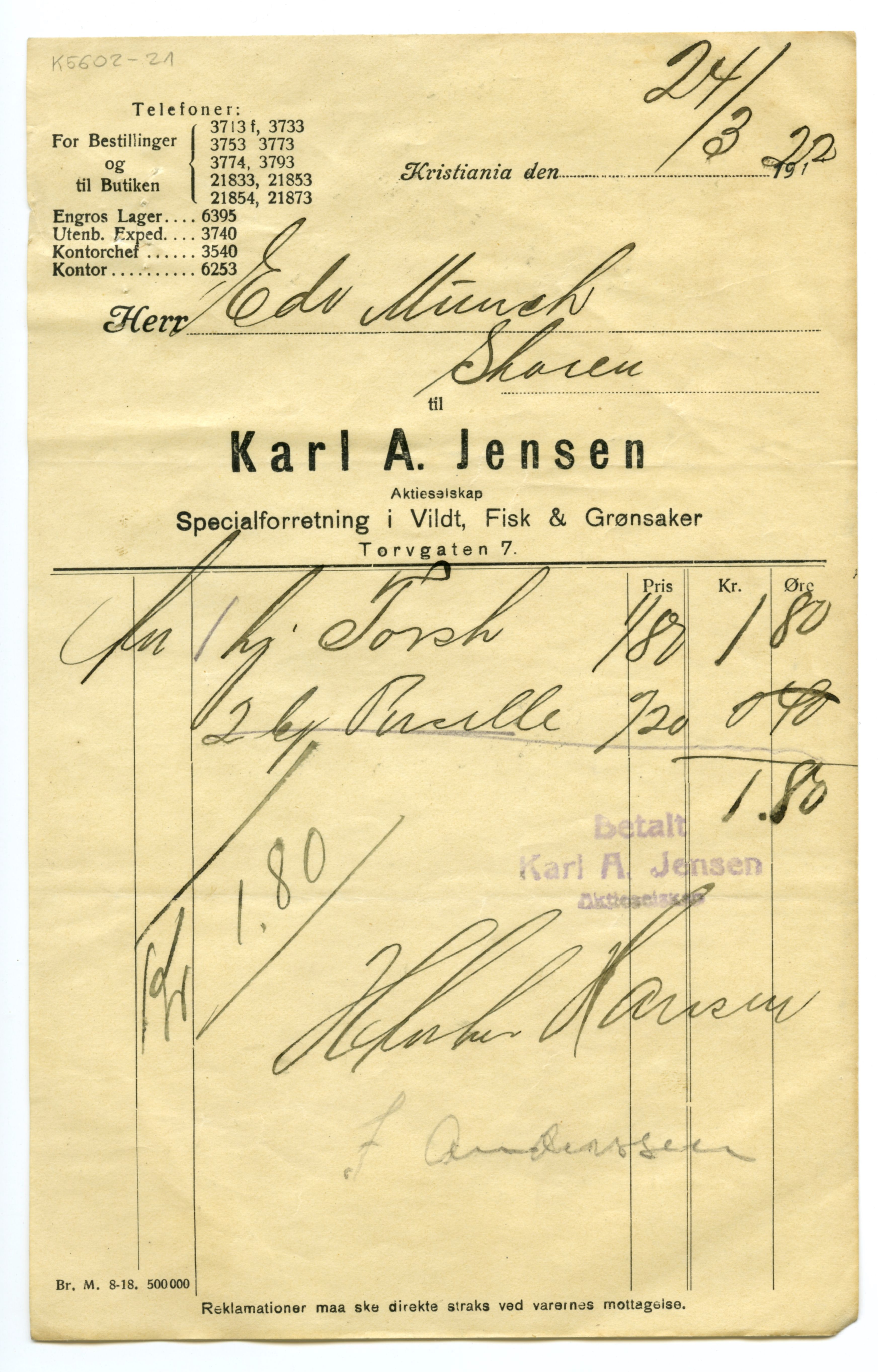 MM K 5602, Munchmuseet. Datert 02.02.1922. Brev fra Fisk & Grønsaker Karl A. Jensen Aktieselskap Specialforretning i Vildt.