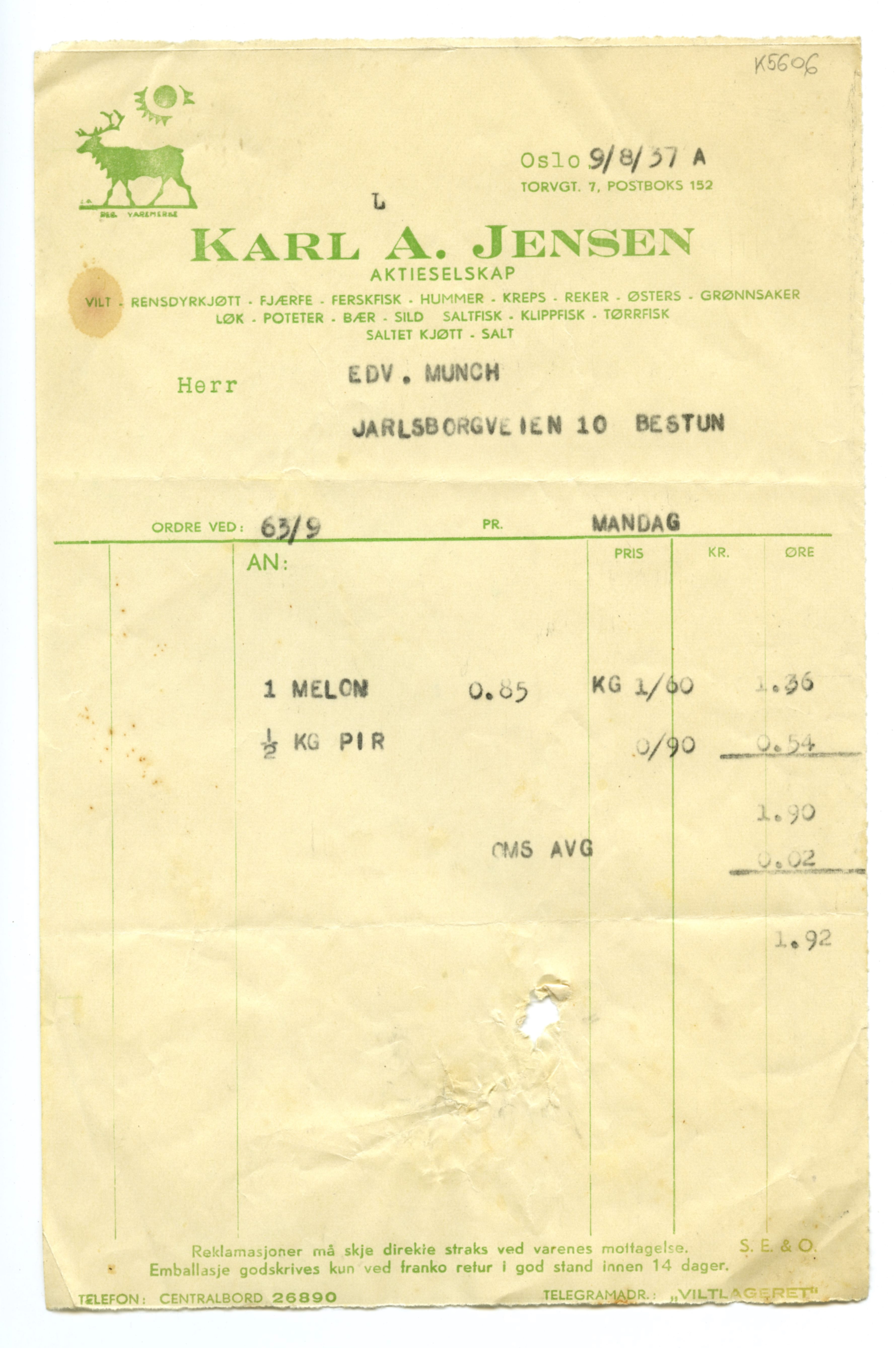 MM K 5606, Munchmuseet. Datert 09.08.1937. Brev fra Karl A. Jensen Aktieselskap.