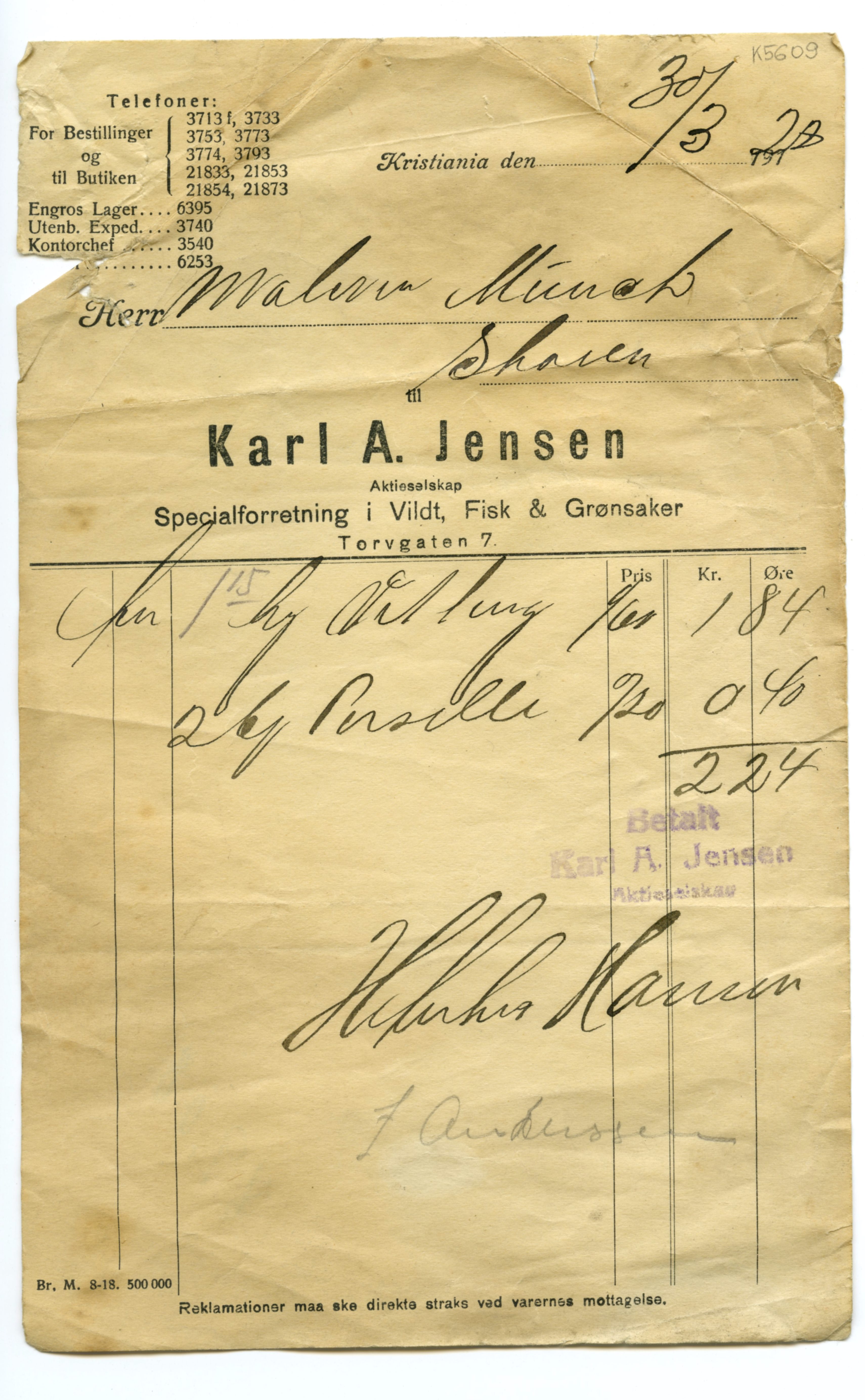 MM K 5609, Munchmuseet. Datert 30.03.1928. Brev fra Fisk & Grønsaker Karl A. Jensen Aktieselskap Specialforretning i Vildt.