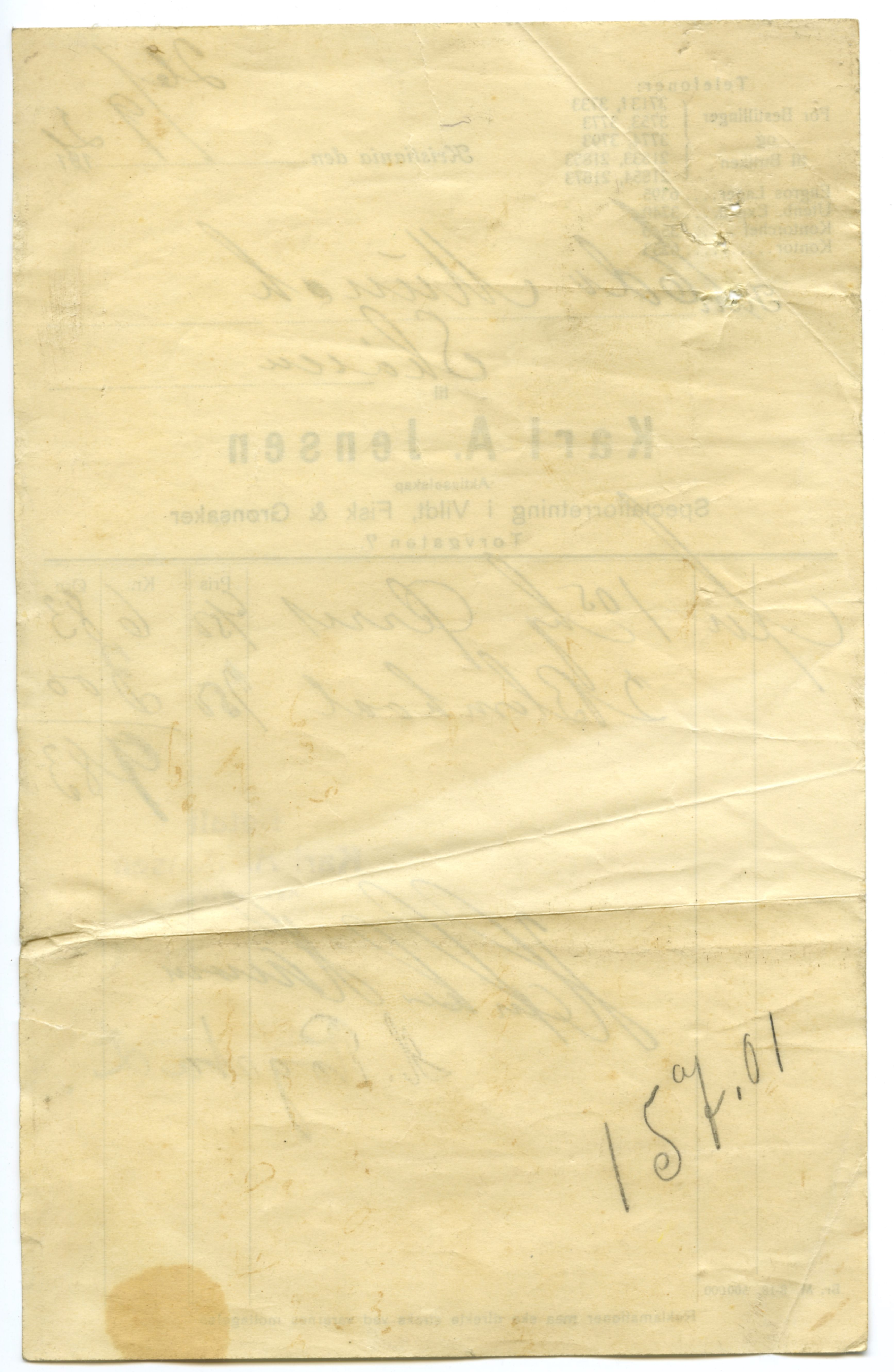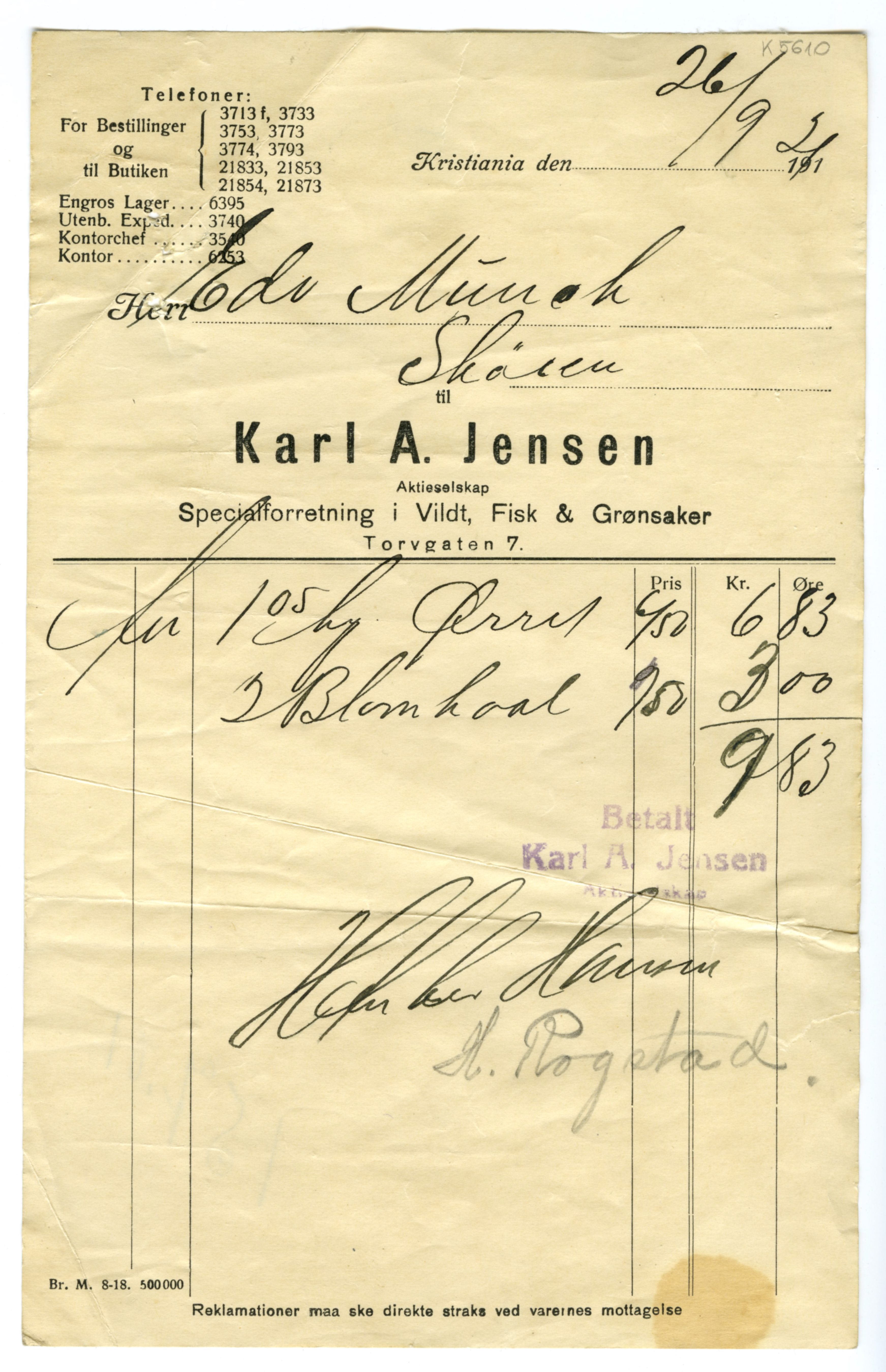 MM K 5610, Munchmuseet. Datert 26.09.1921. Brev fra Fisk & Grønsaker Karl A. Jensen Aktieselskap Specialforretning i Vildt.