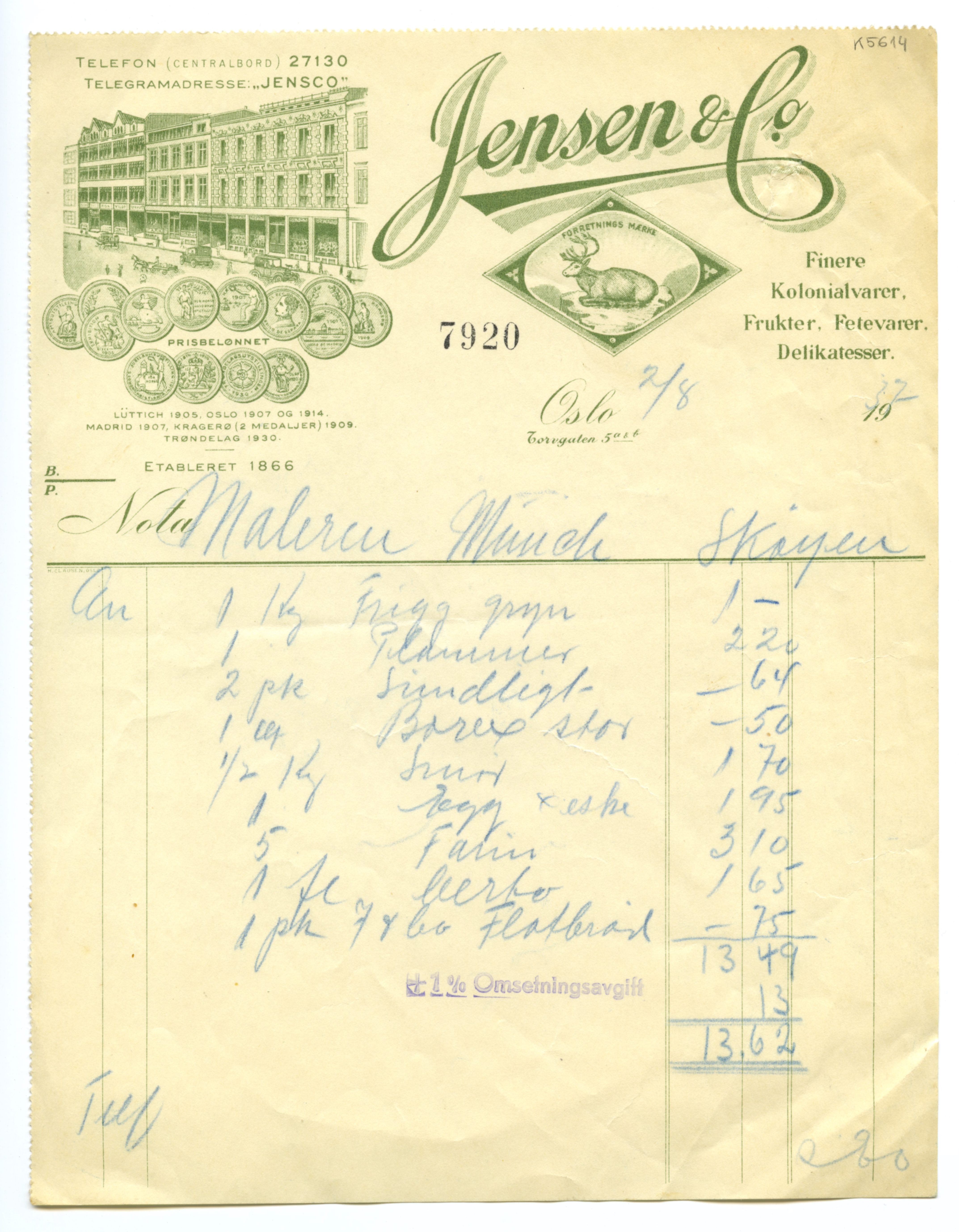 MM K 5614, Munchmuseet. Datert 02.08.1937. Brev fra konserves- & frugt Jensen & Co Fetevarer. Delikatesser.