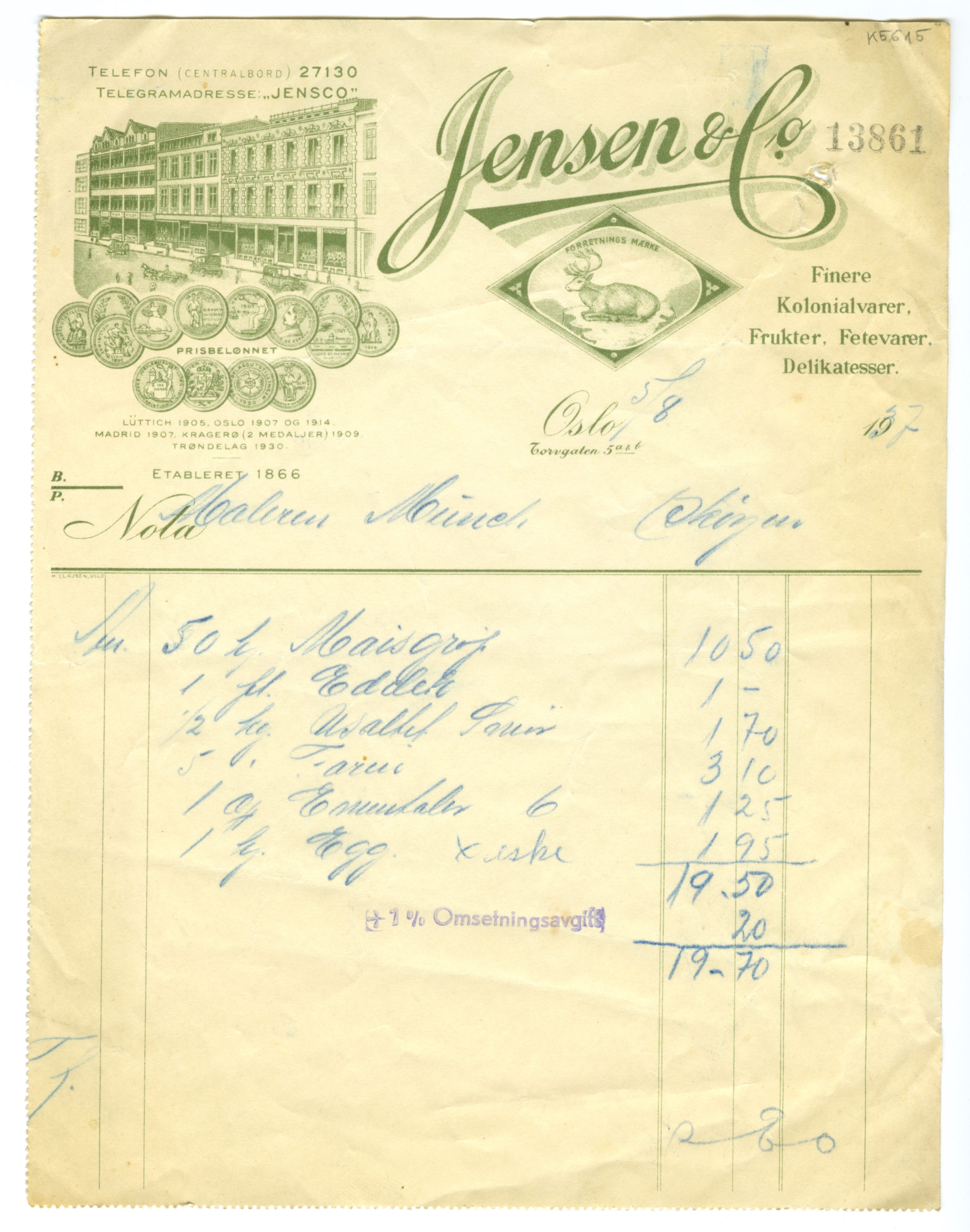 MM K 5615, Munchmuseet. Datert 05.08.1937. Brev fra konserves- & frugt Jensen & Co Fetevarer. Delikatesser.