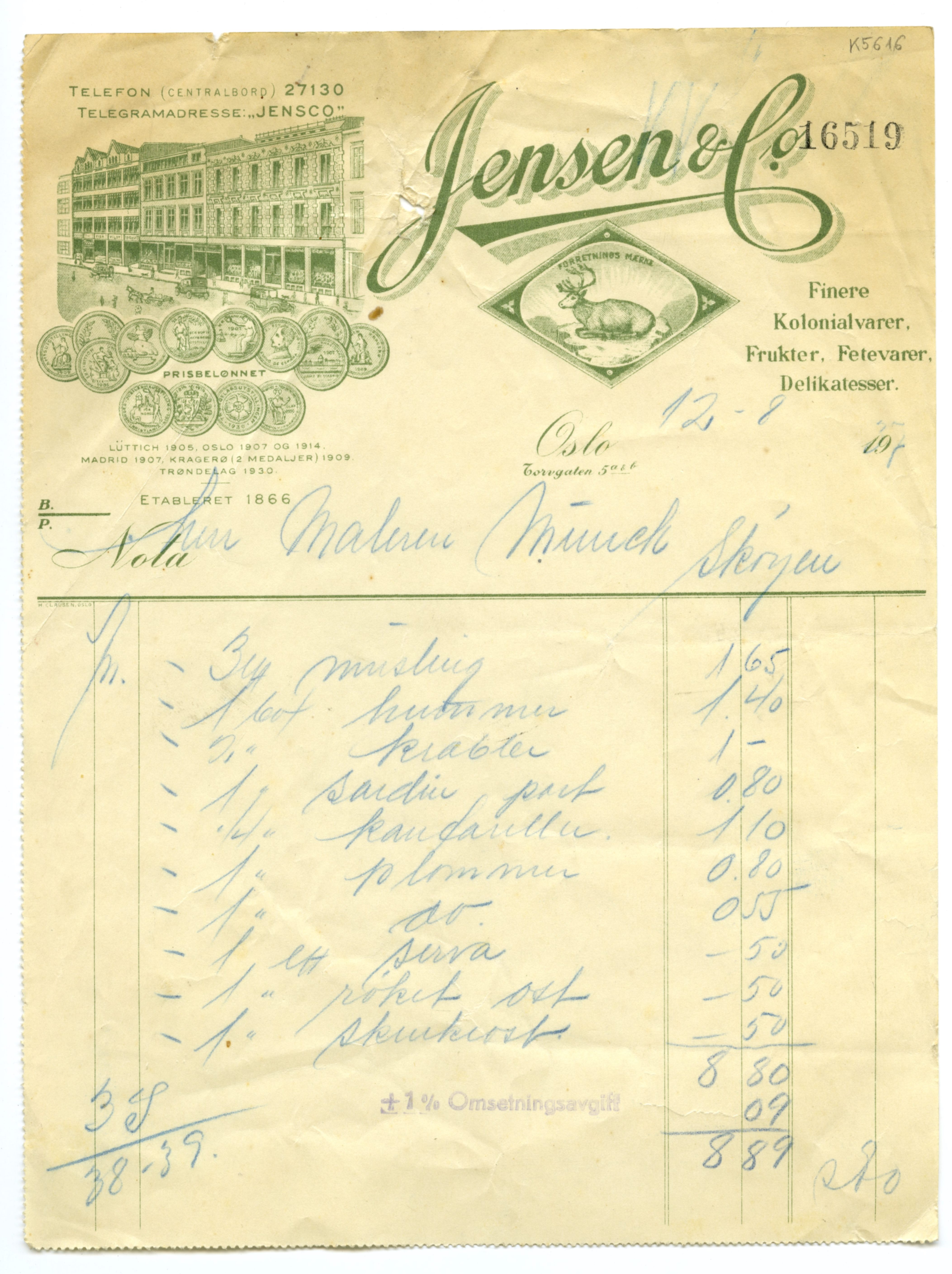 MM K 5616, Munchmuseet. Datert 12.08.1937. Brev fra konserves- & frugt Jensen & Co Fetevarer. Delikatesser.