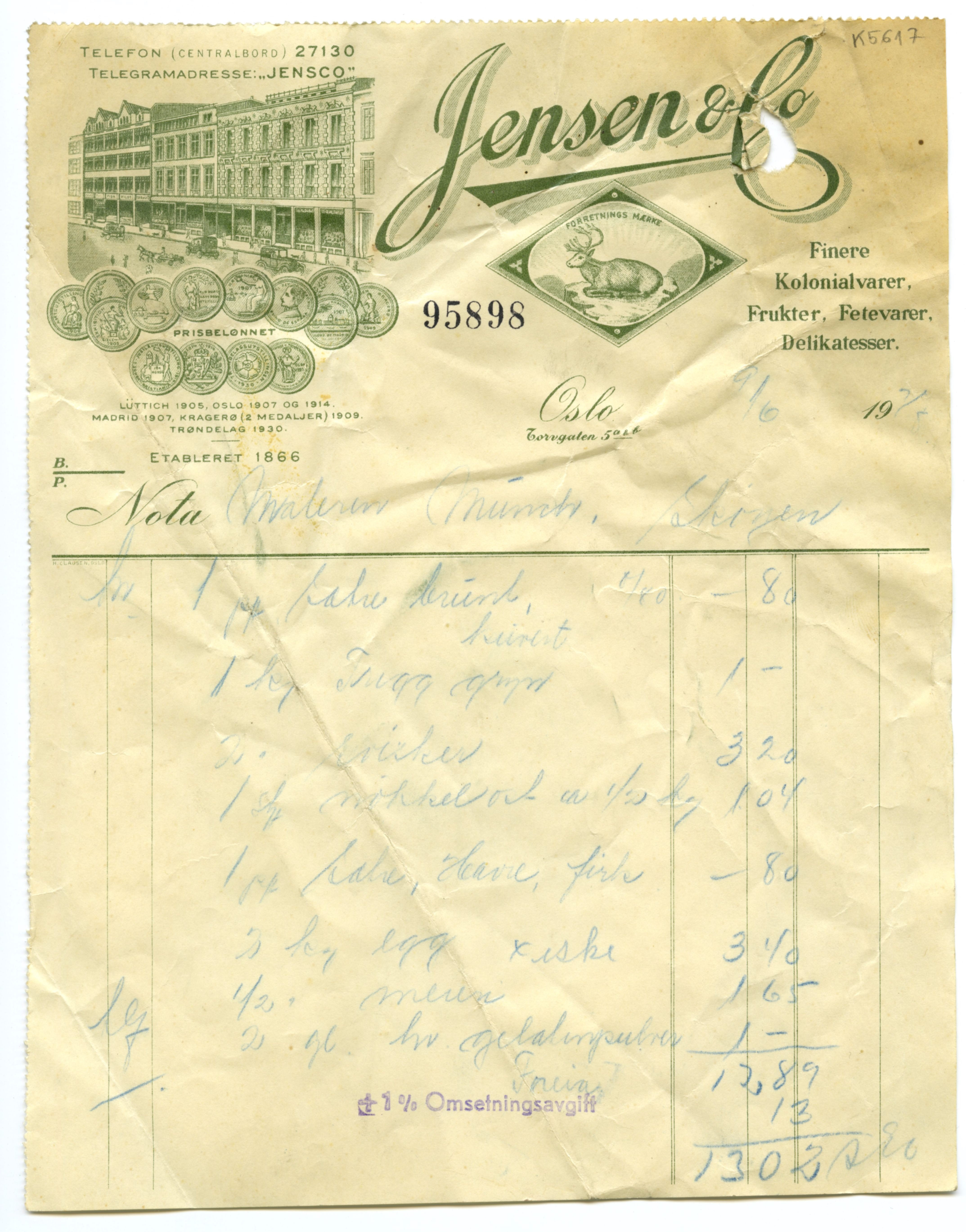 MM K 5617, Munchmuseet. Datert 09.06.1937. Brev fra konserves- & frugt Jensen & Co Fetevarer. Delikatesser.