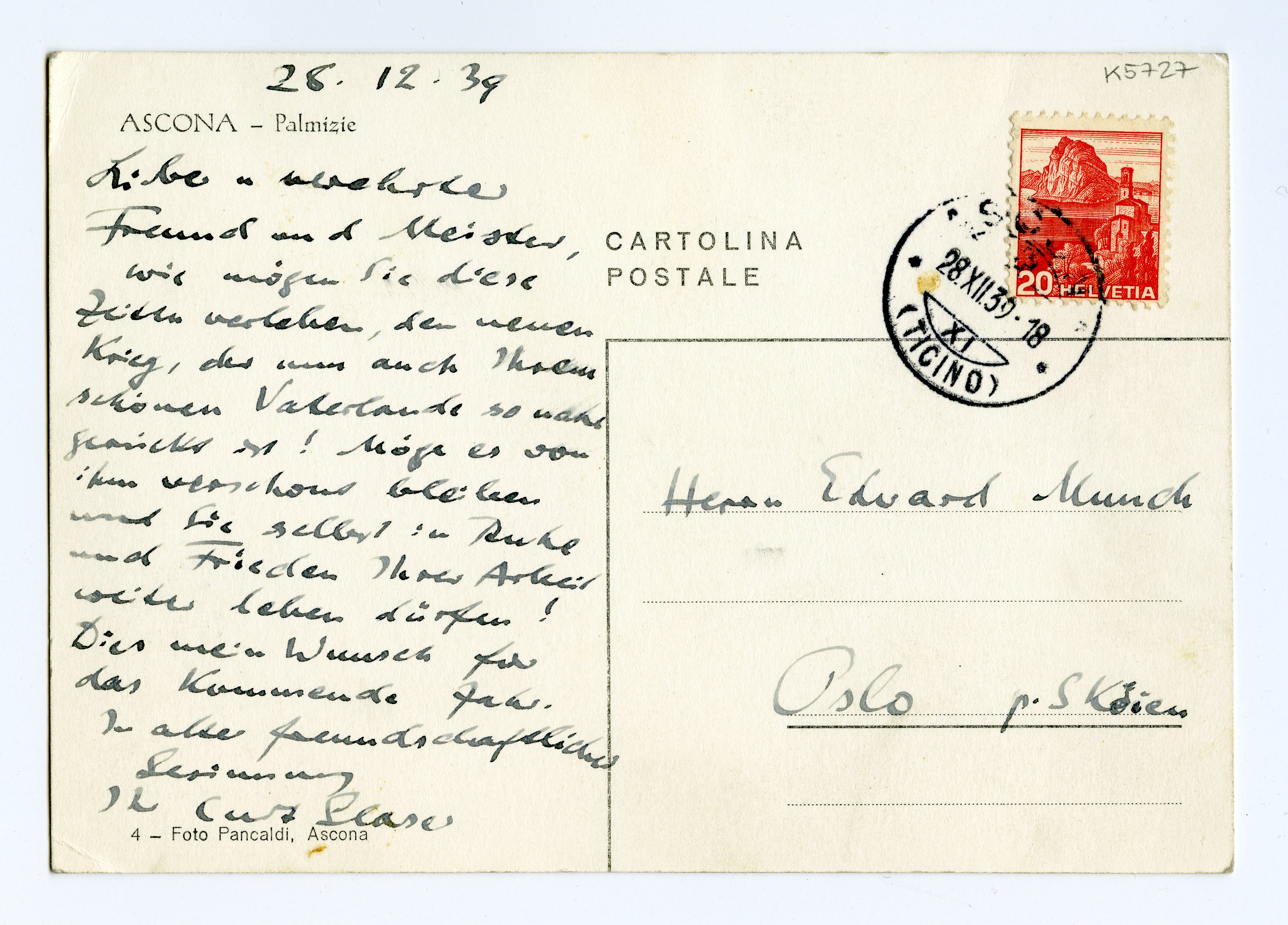 MM K 5727, Munchmuseet. Datert 28.12.1939. Brev fra Curt Glaser.