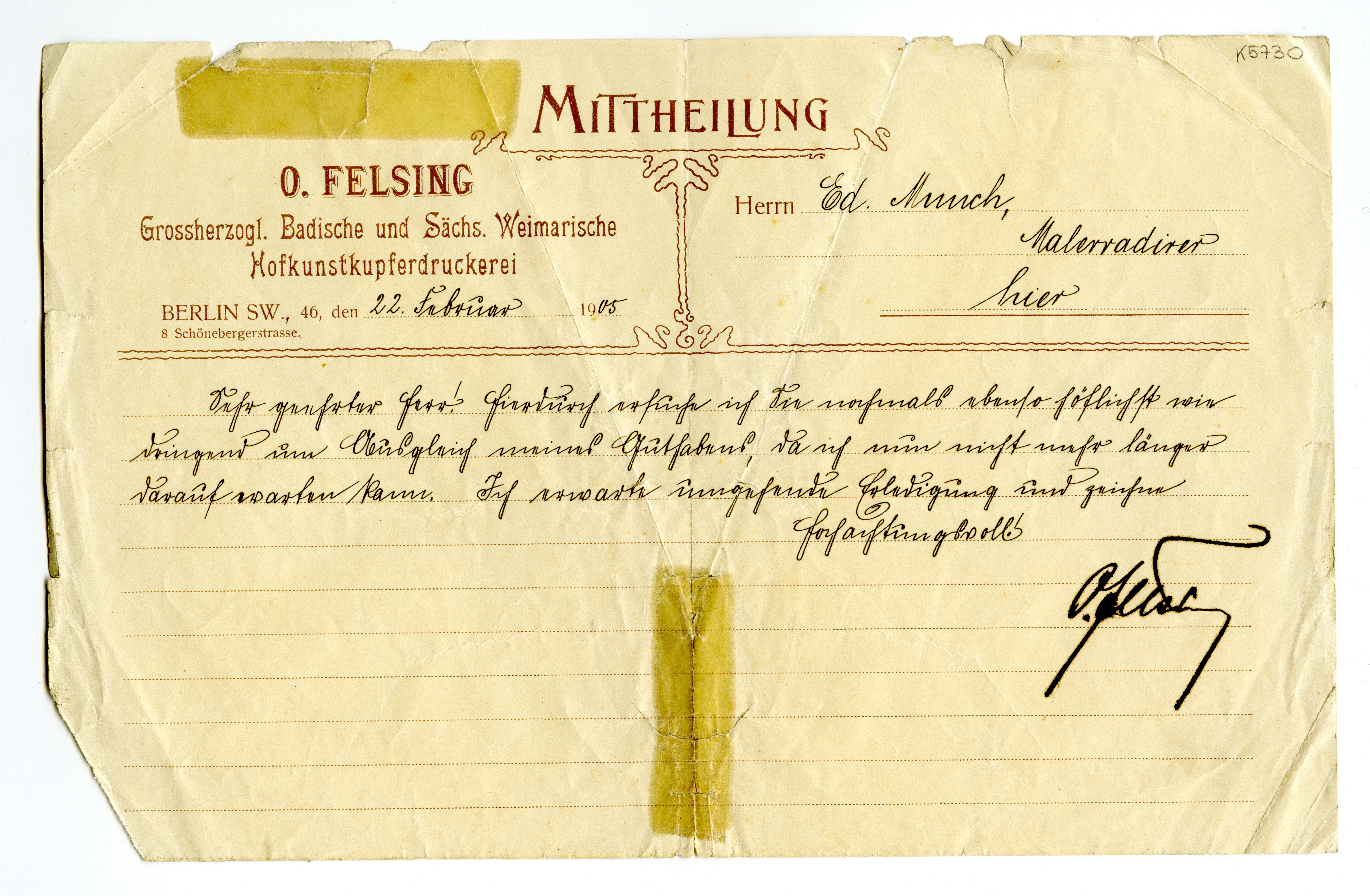 MM K 5730, Munchmuseet. Datert 22.02.1905. Brev fra Wilhelm Felsing, Hof-Kunstkupferdruckerei O. Felsing.
