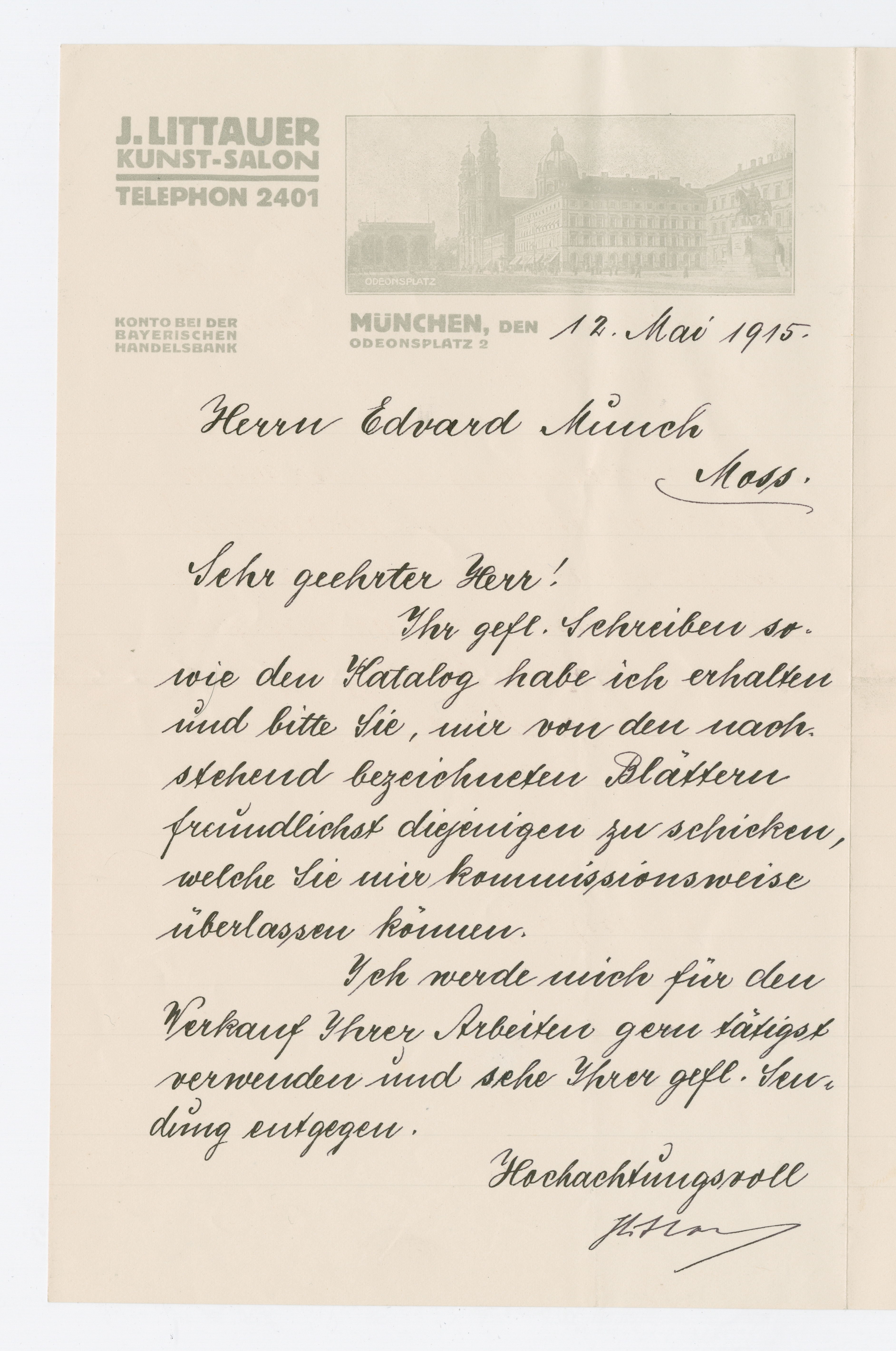 MM K 5740, Munchmuseet. Datert 12.05.1915. Brev fra J. Littauer, J. Littauer Kunst-salon.
