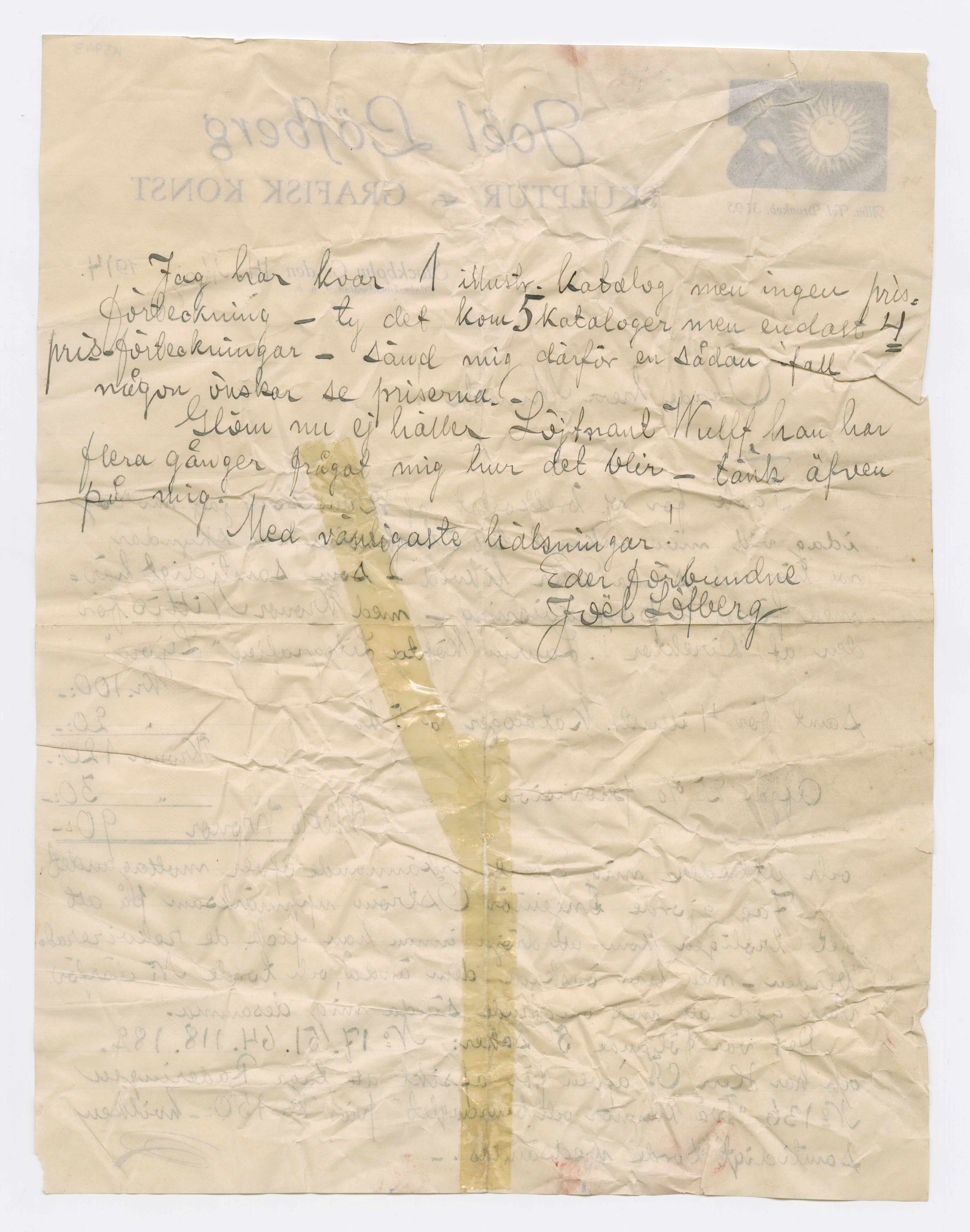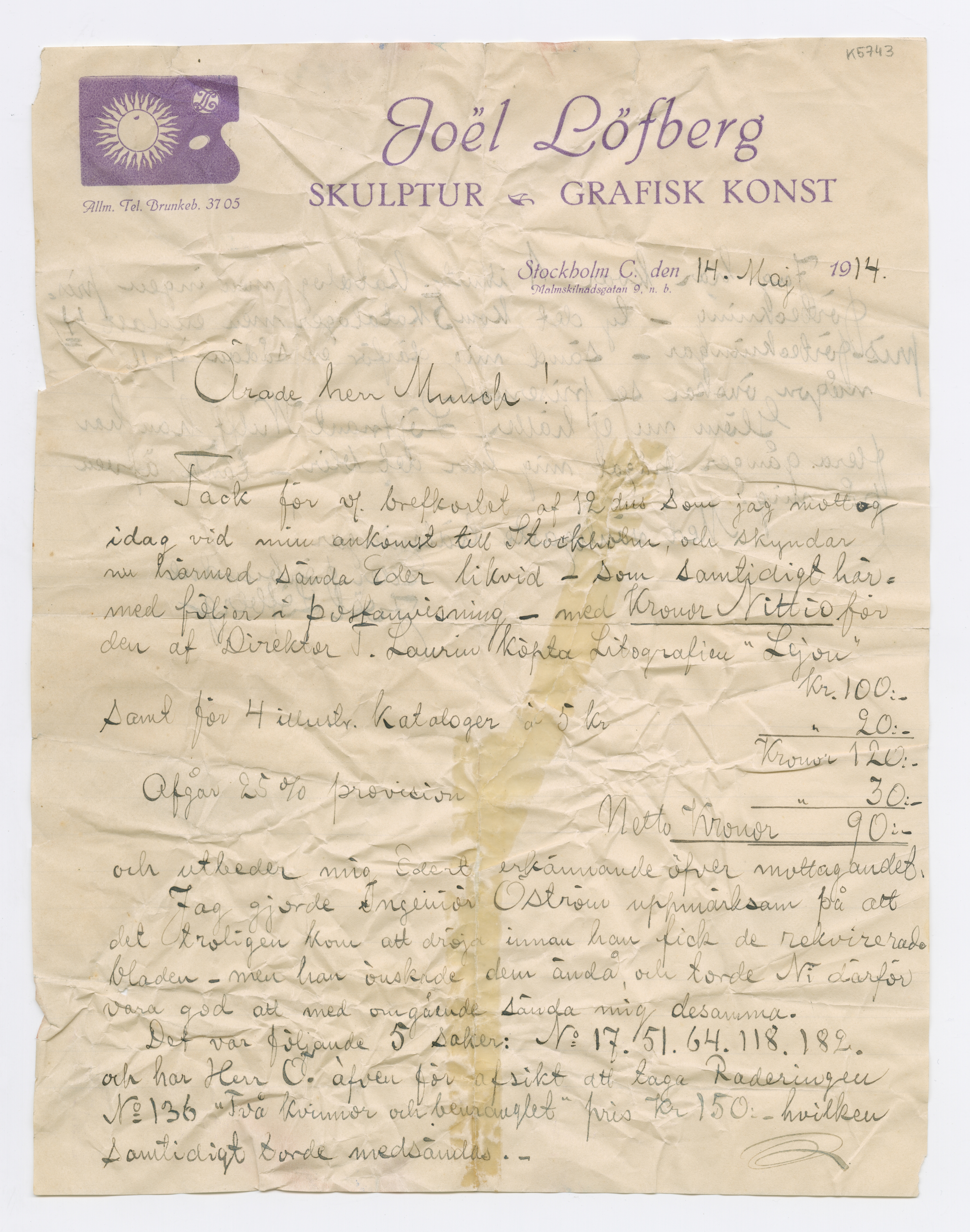 MM K 5743, Munchmuseet. Datert 14.05.1914. Brev fra Joël Löfberg, Jöel Löfberg Skulptur Grafisk Konst.
