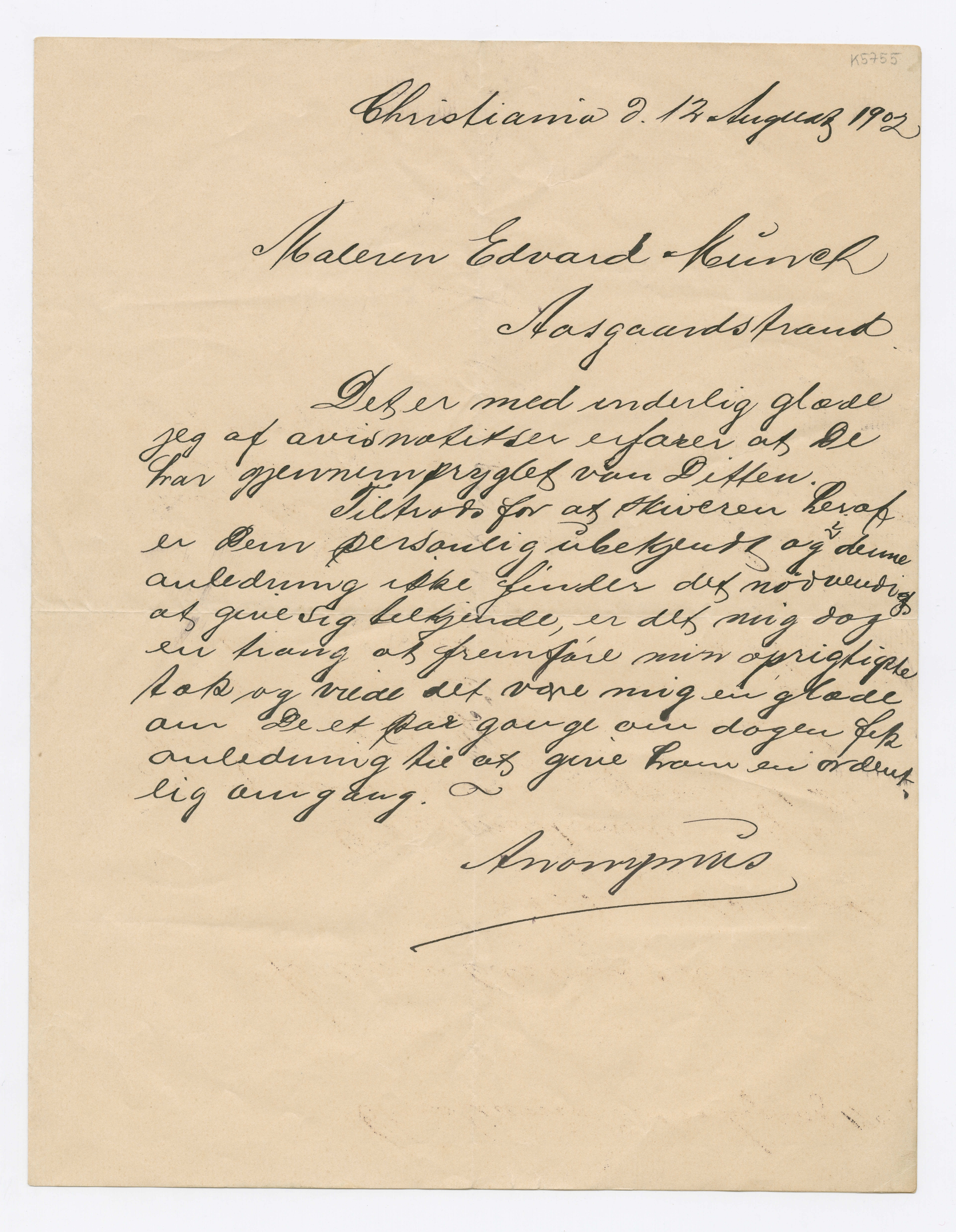 MM K 5755, Munchmuseet. Datert 12.08.1902. Brev fra Anonymous.
