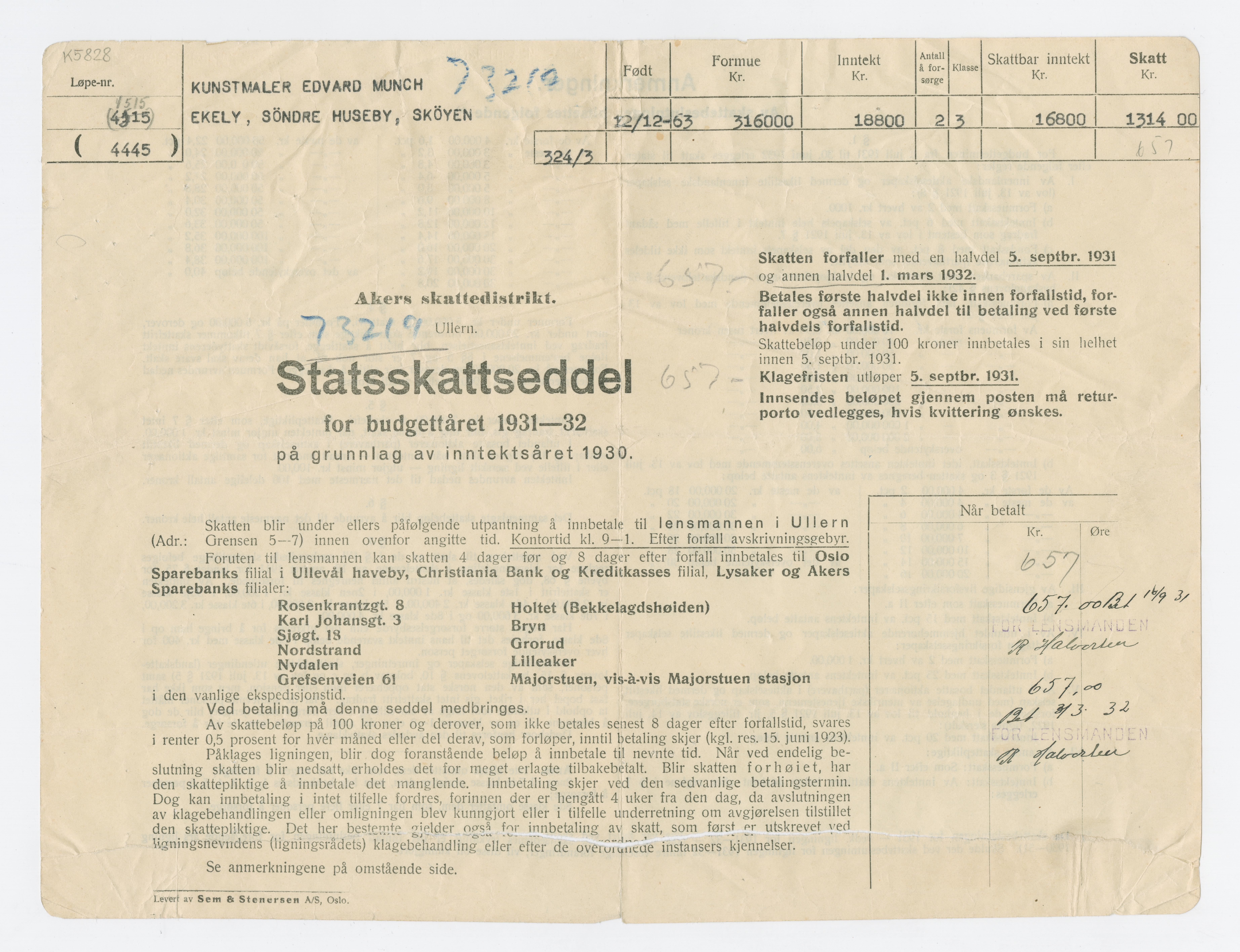 MM K 5828, Munchmuseet. Datert 1931–1932. Brev fra Akers skattedistrikt.