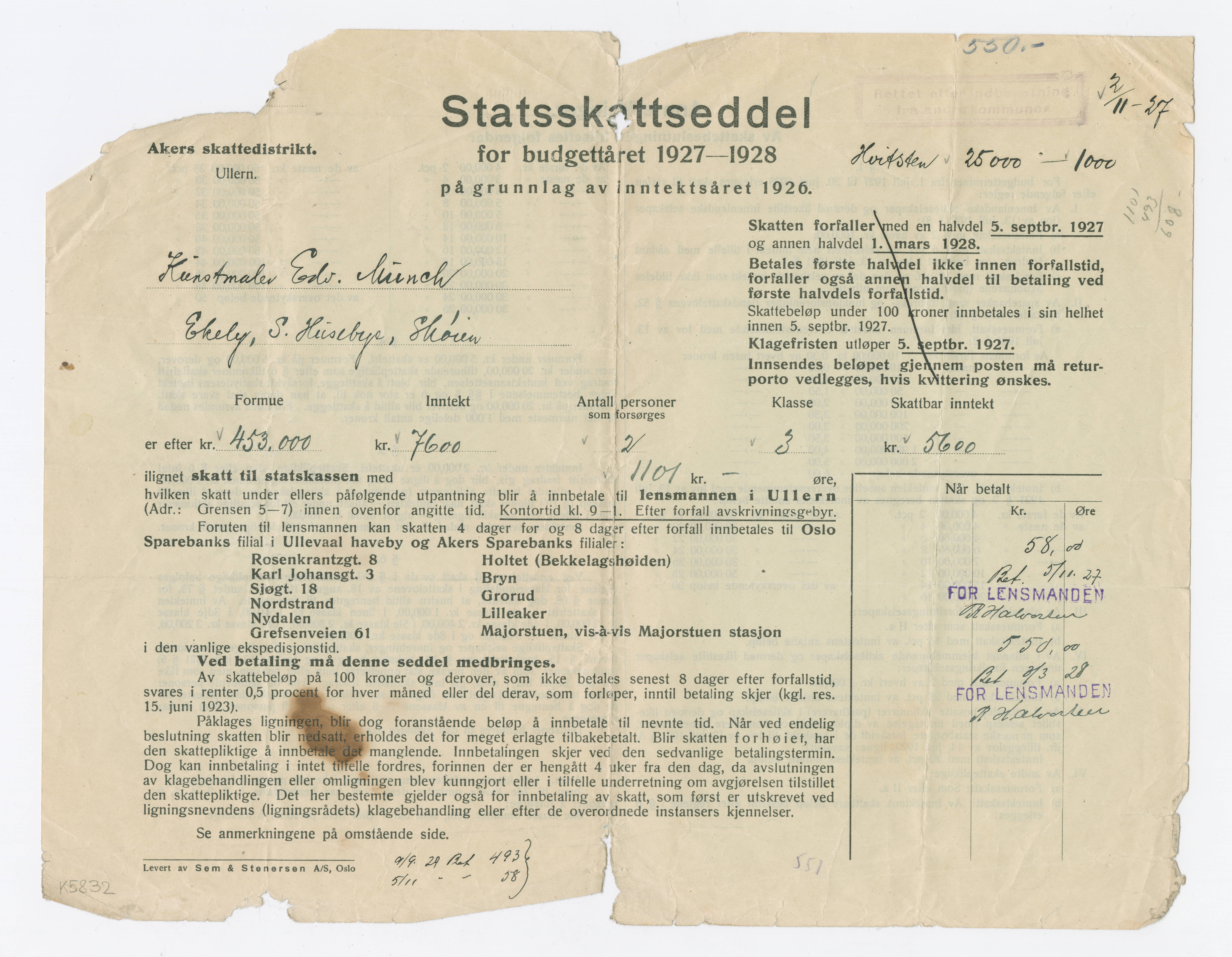 MM K 5832, Munchmuseet. Datert 1927–1928. Brev fra Akers skattedistrikt.