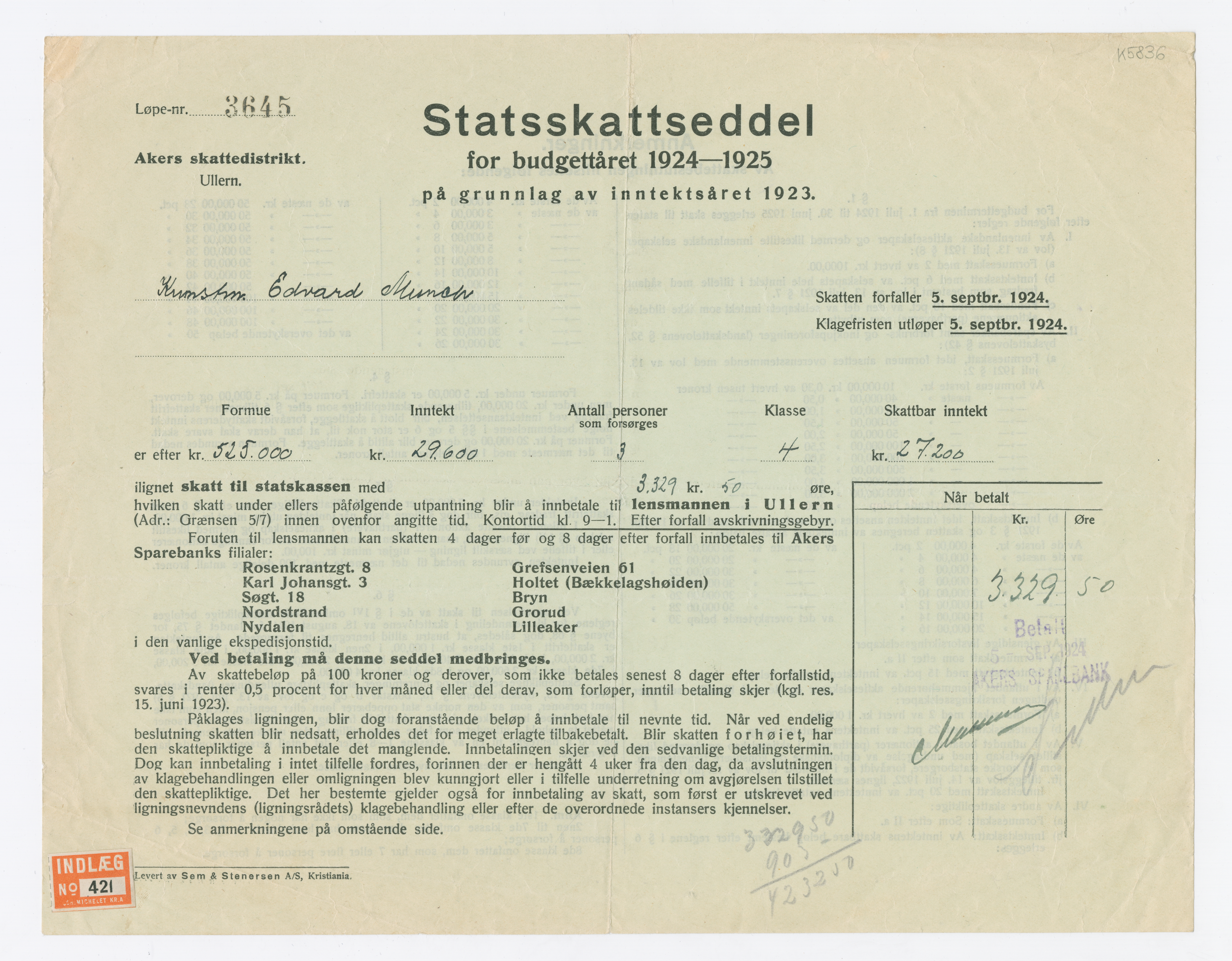 MM K 5836, Munchmuseet. Datert 1924–1925. Brev fra Akers skattedistrikt.