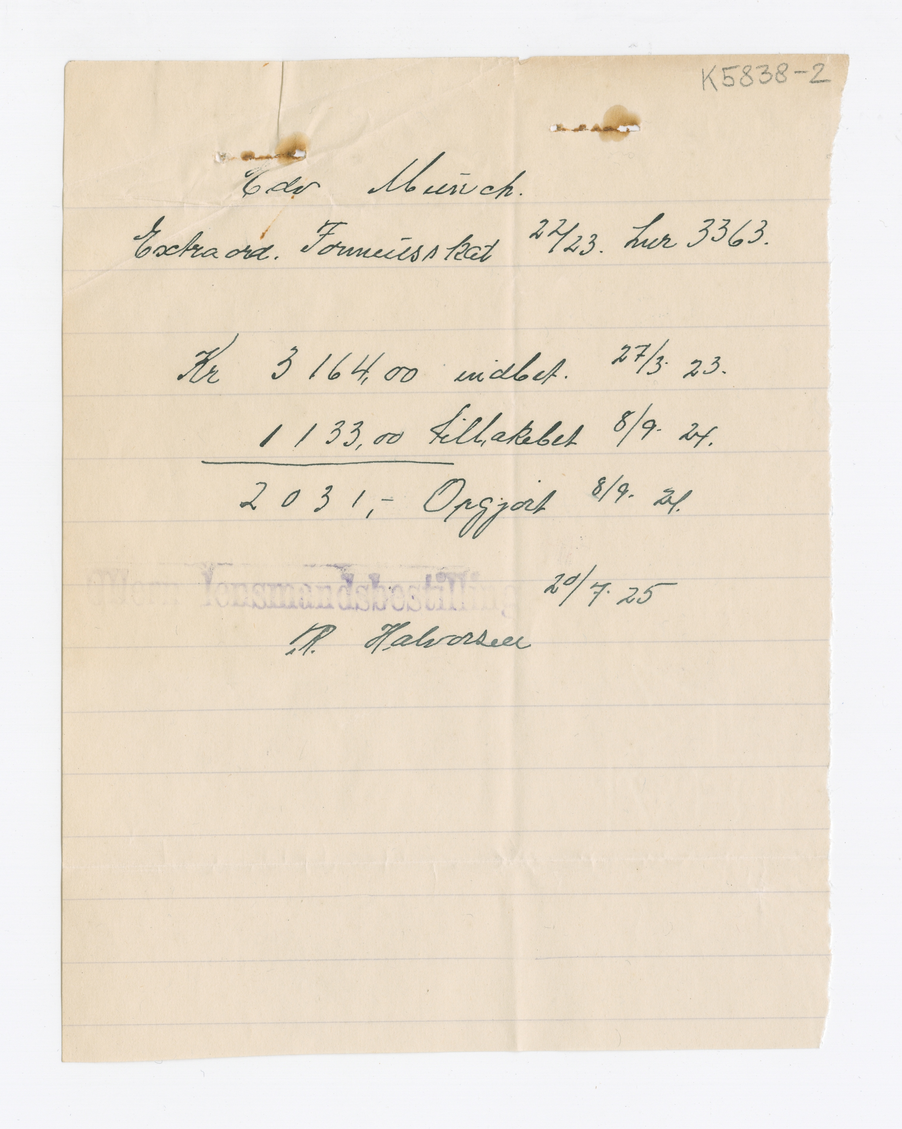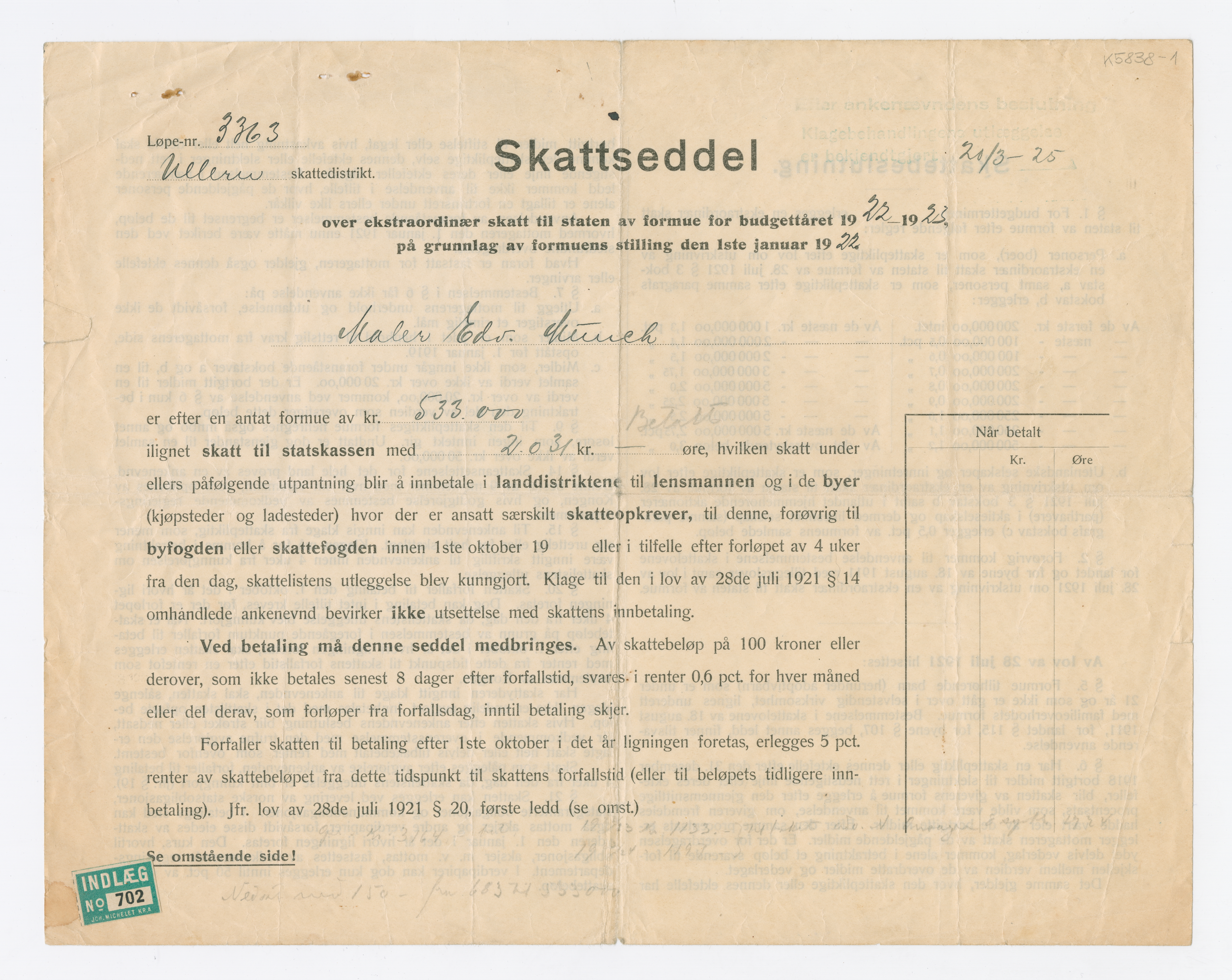 MM K 5838, Munchmuseet. Datert 1922–1923. Brev fra Akers skattedistrikt.
