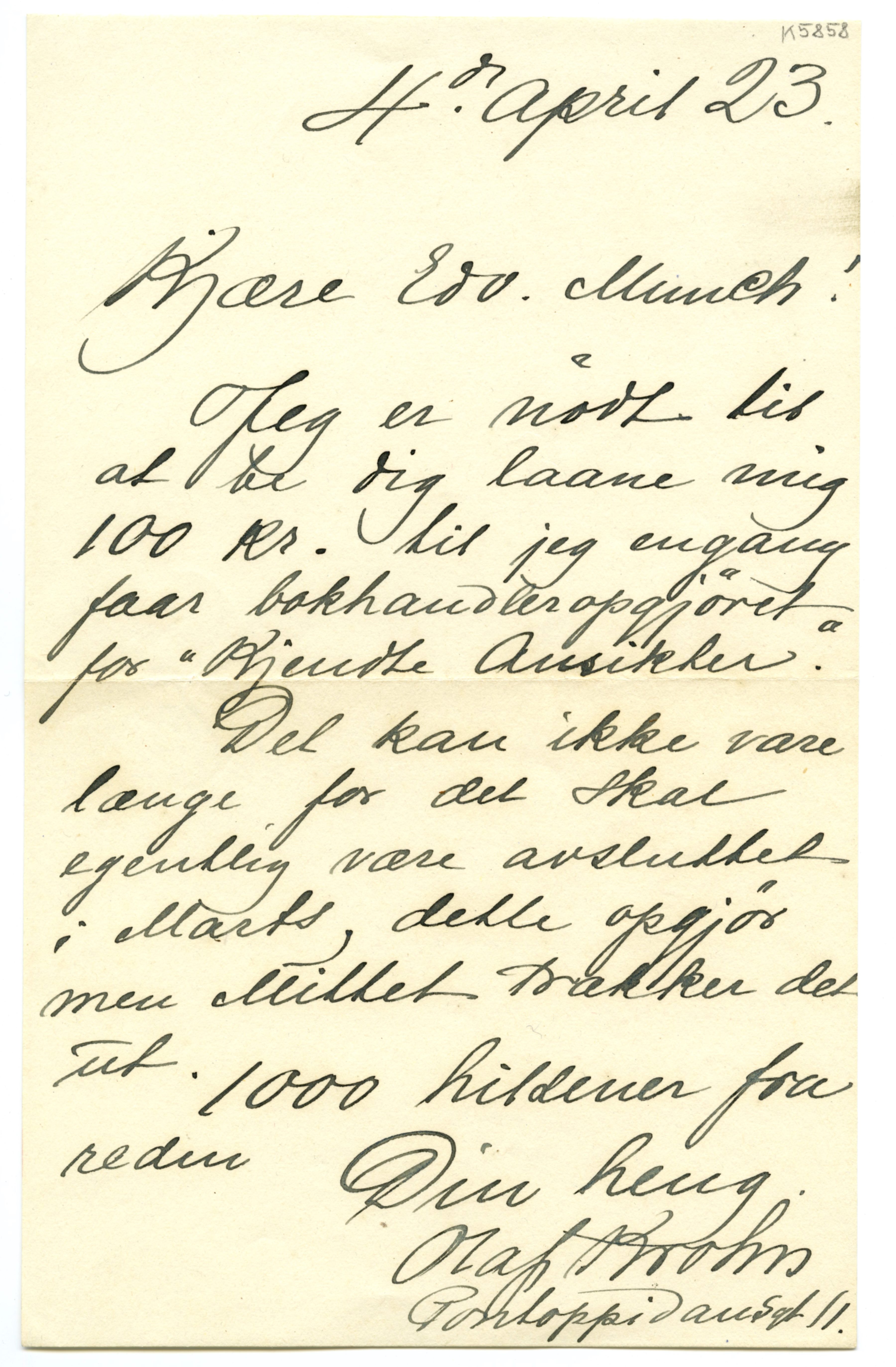 MM K 5858, Munchmuseet. Datert 04.04.1923. Brev fra Olaf Krohn.