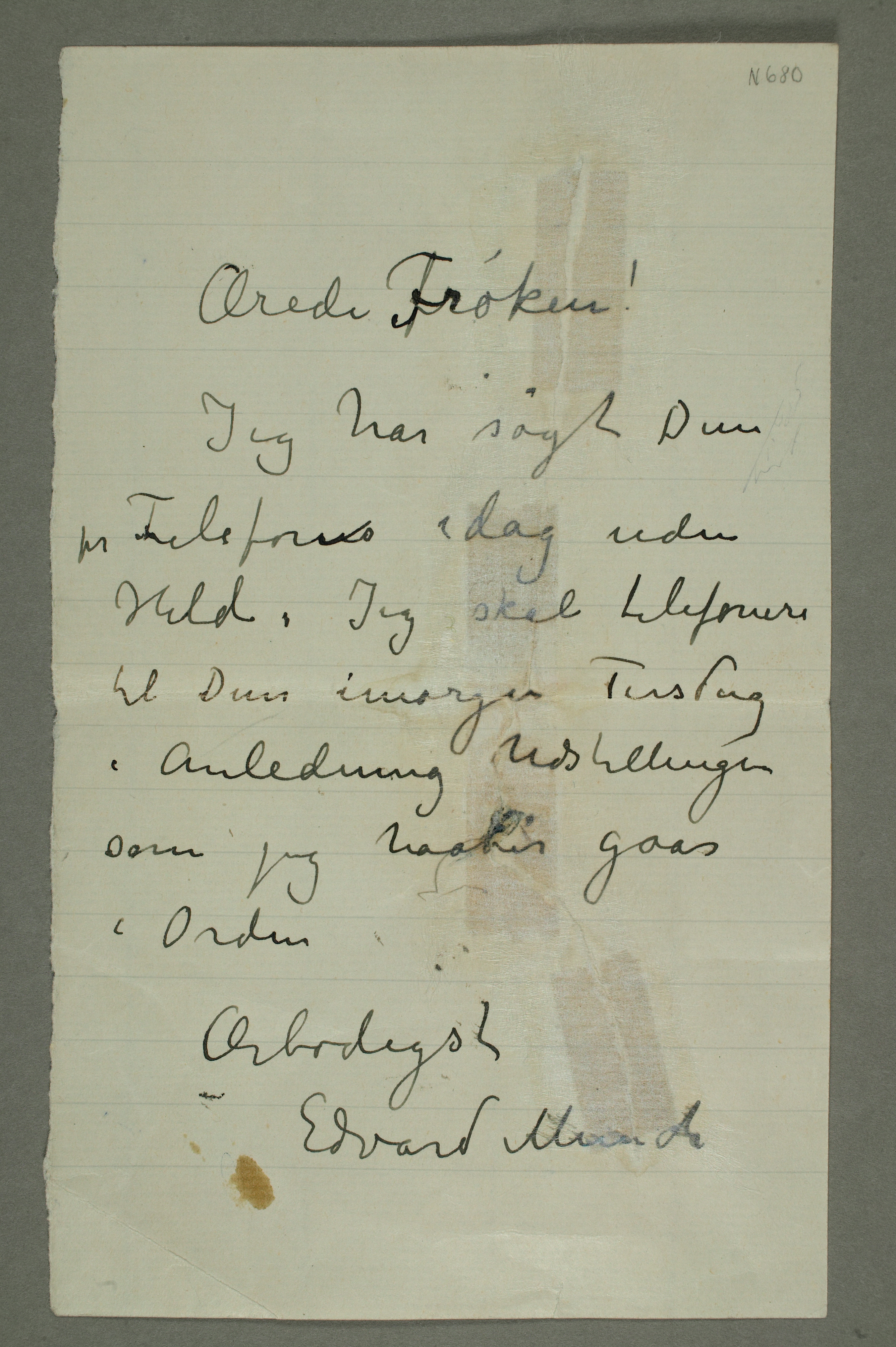 MM N 680, Munchmuseet. Ikke datert. Brevutkast til Uidentifisert kvinne.