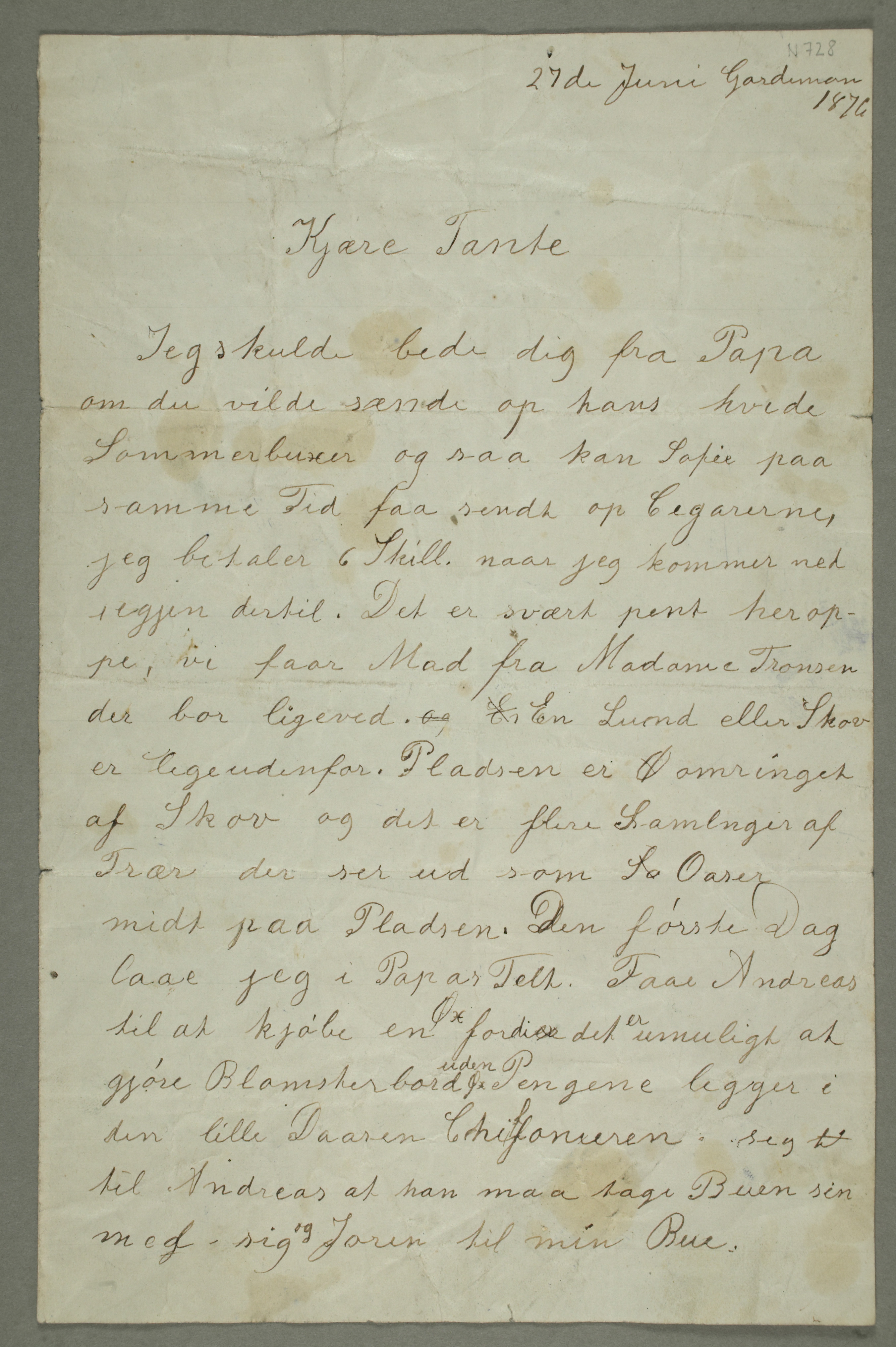MM N 728, Munchmuseet. Datert 27.6.1876. Brev til Karen Bjølstad