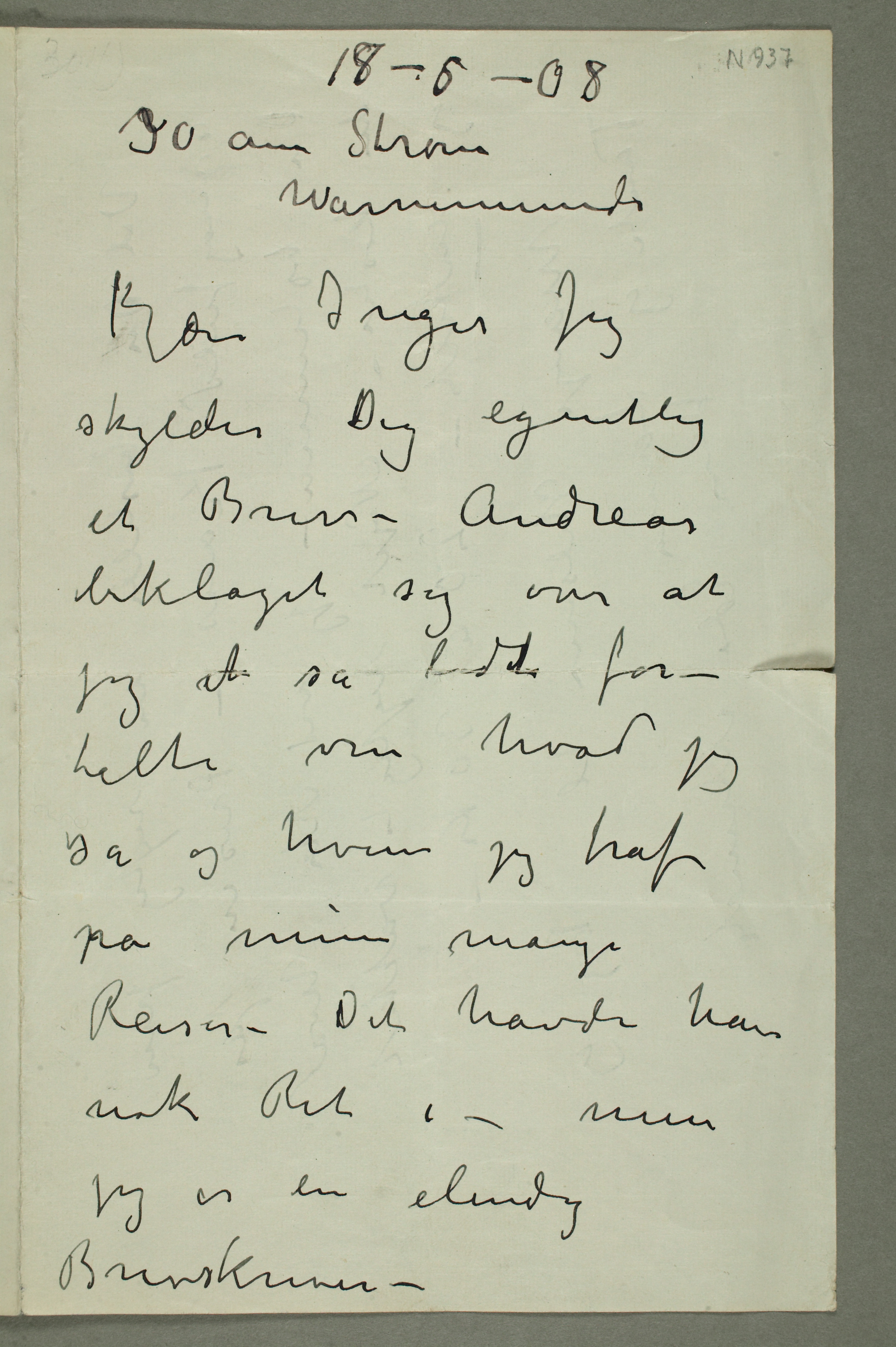 MM N 937, Munchmuseet. Datert 18.5.1908. Brev til Inger Munch