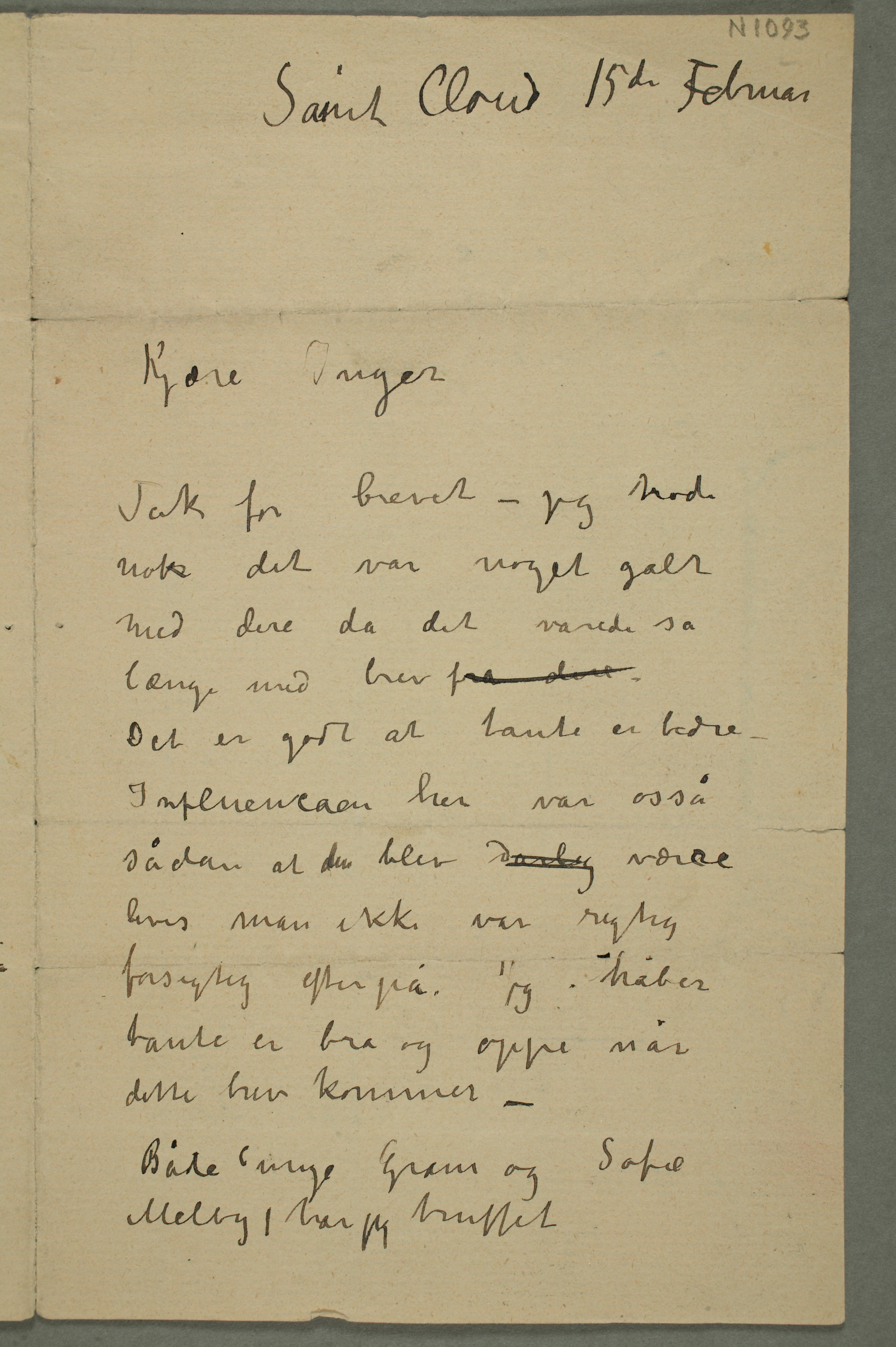 MM N 1093, Munchmuseet. Datert 15.2.1890. Brev til Inger Munch