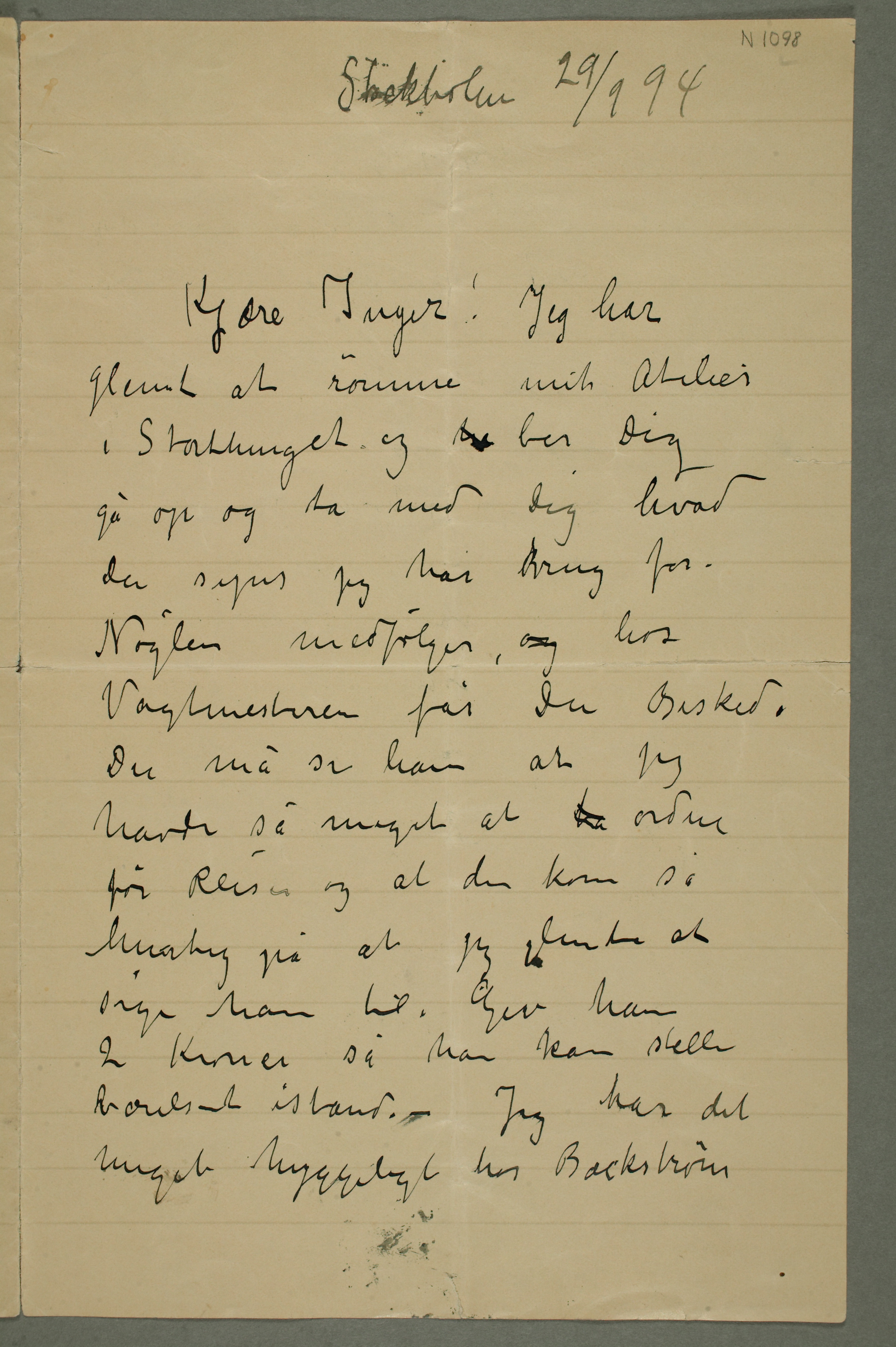 MM N 1098, Munchmuseet. Datert 29.9.1894. Brev til Inger Munch