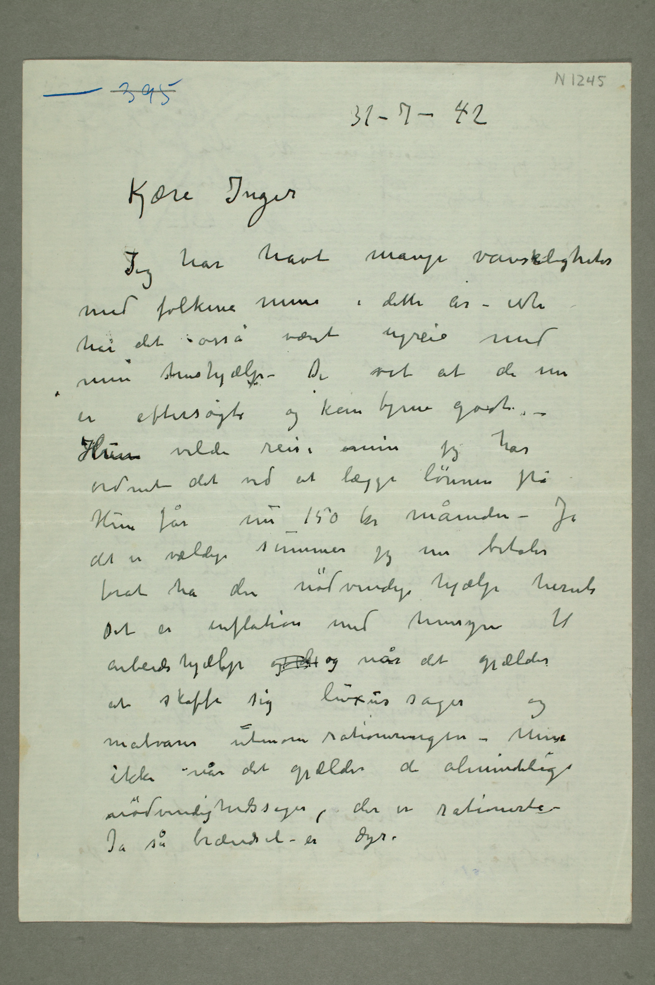 MM N 1245, Munchmuseet. Datert 31.7.1942. Brev til Inger Munch
