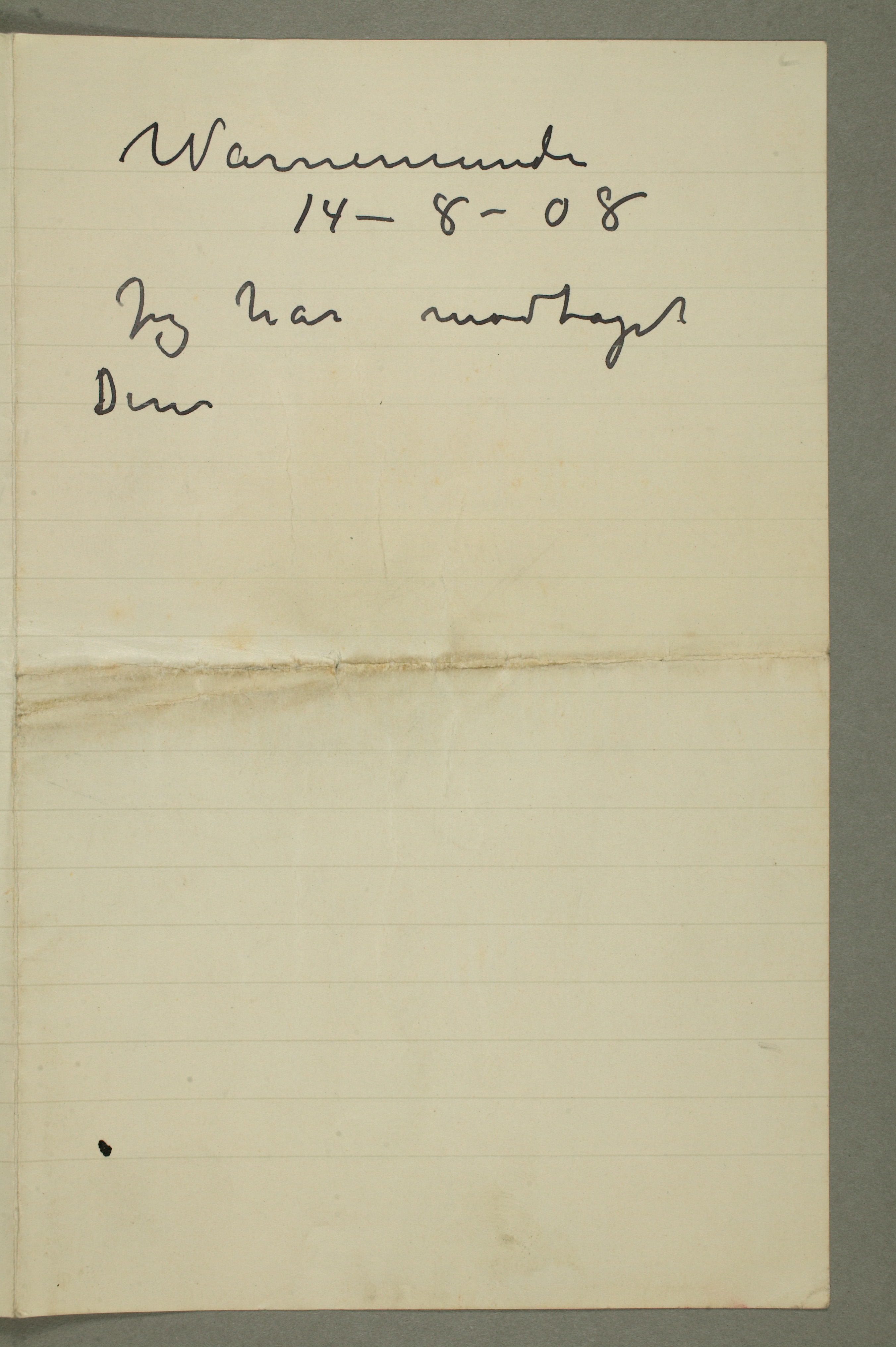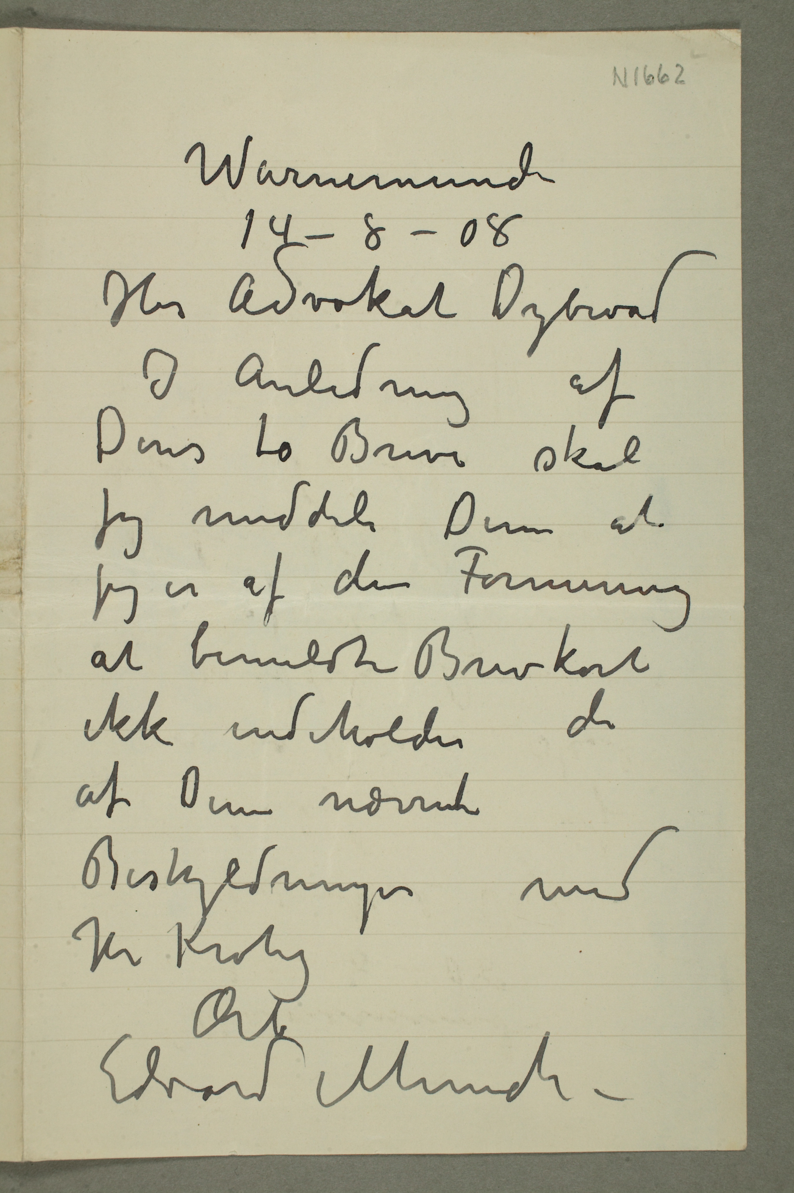 MM N 1662, Munchmuseet. Datert 14.8.1908. Brevutkast til Vilhelm Dybwad.