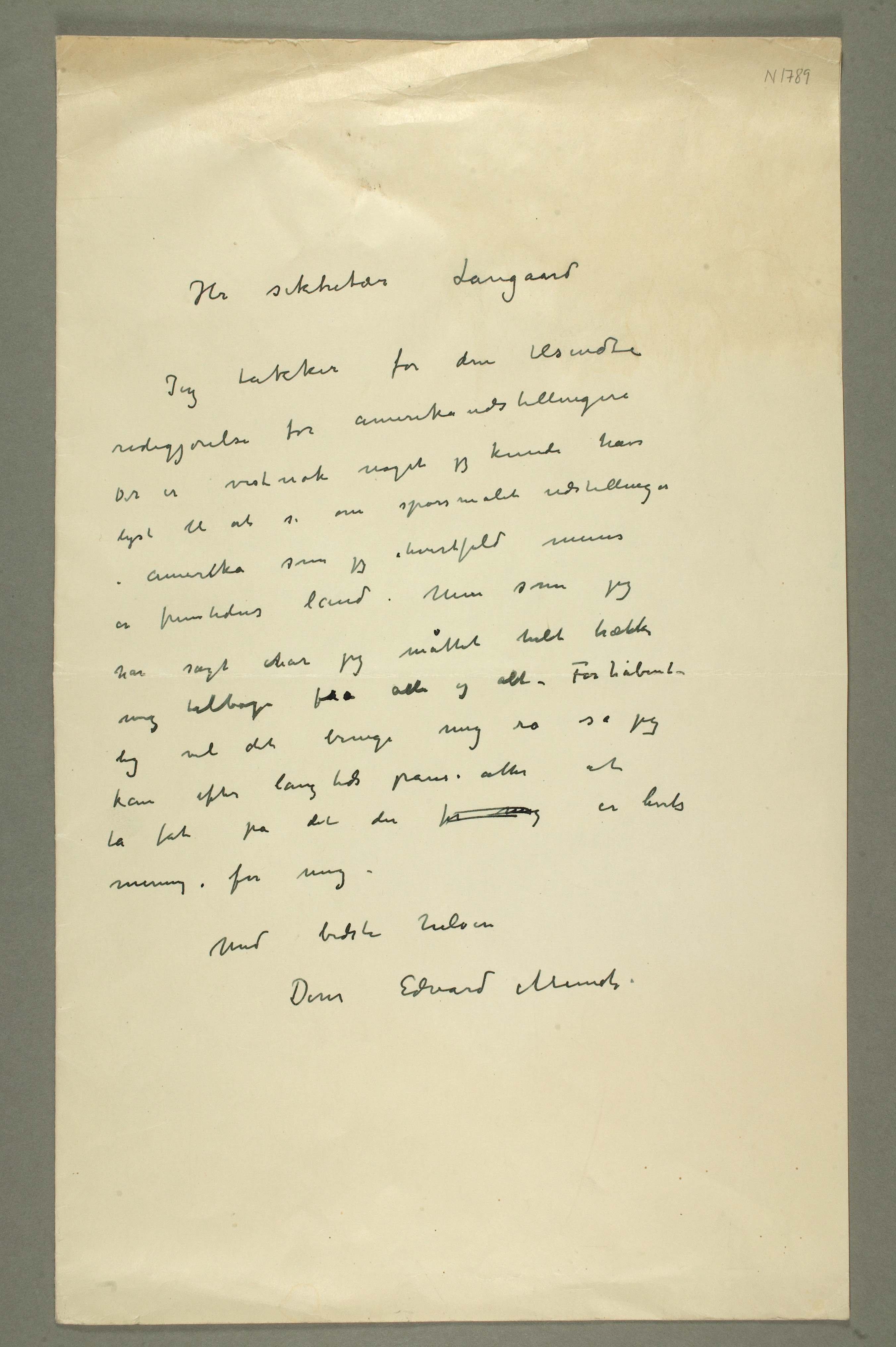 MM N 1789, Munchmuseet. Datert 1934. Brevutkast til Johan Langaard.