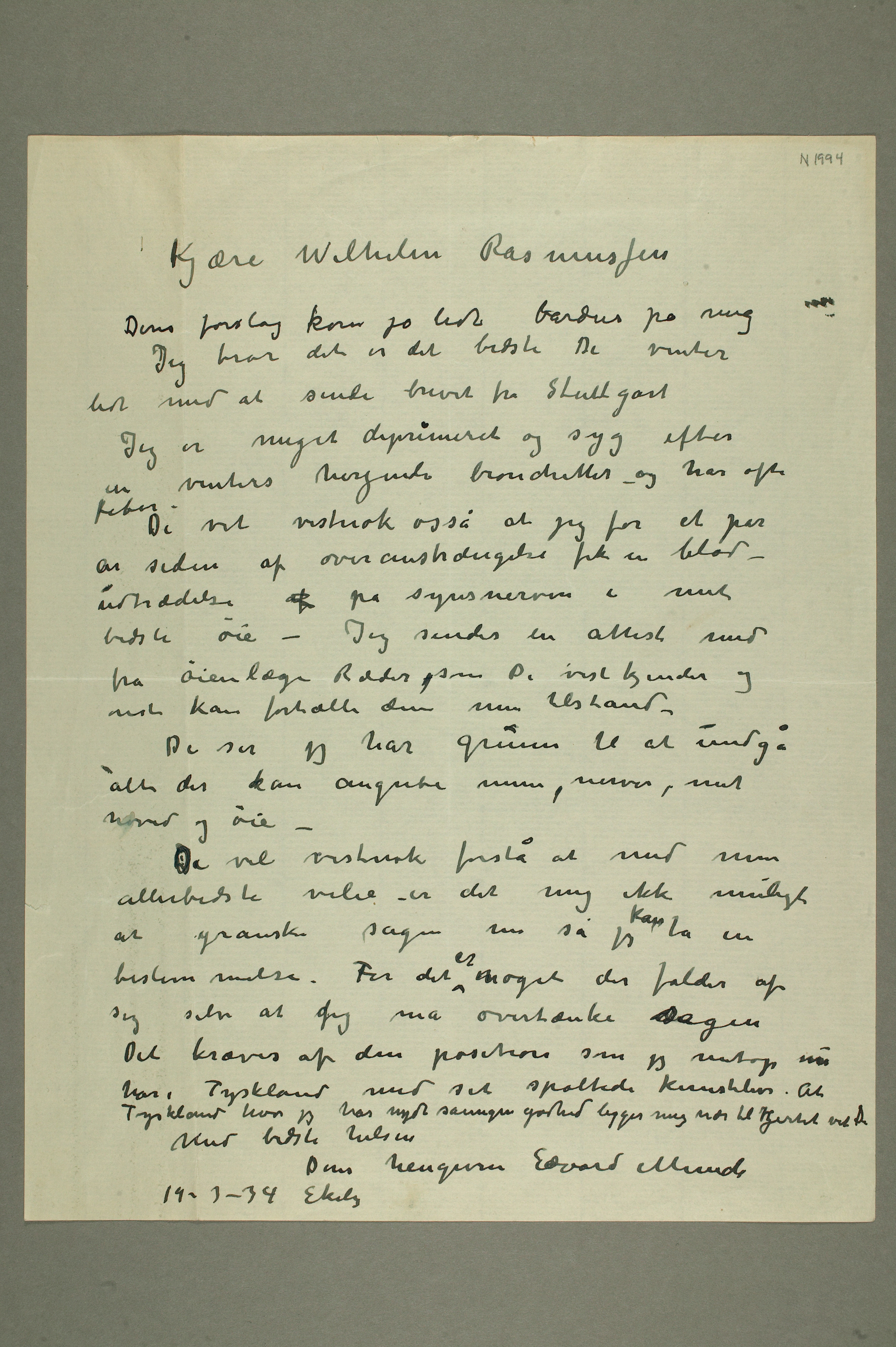 MM N 1994, Munchmuseet. Datert 14.3.1934. Brevutkast til Wilhelm Rasmussen.