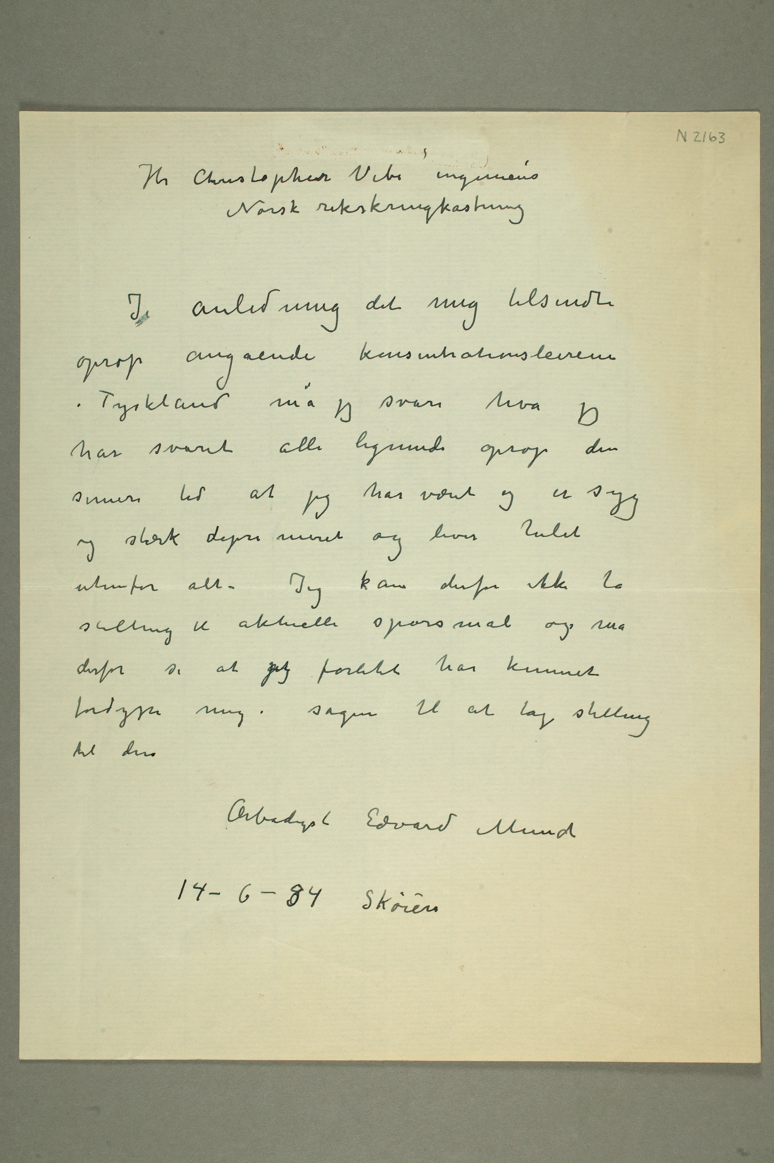 MM N 2163, Munchmuseet. Datert 14.6.1934. Brevutkast til Christopher Vibe.