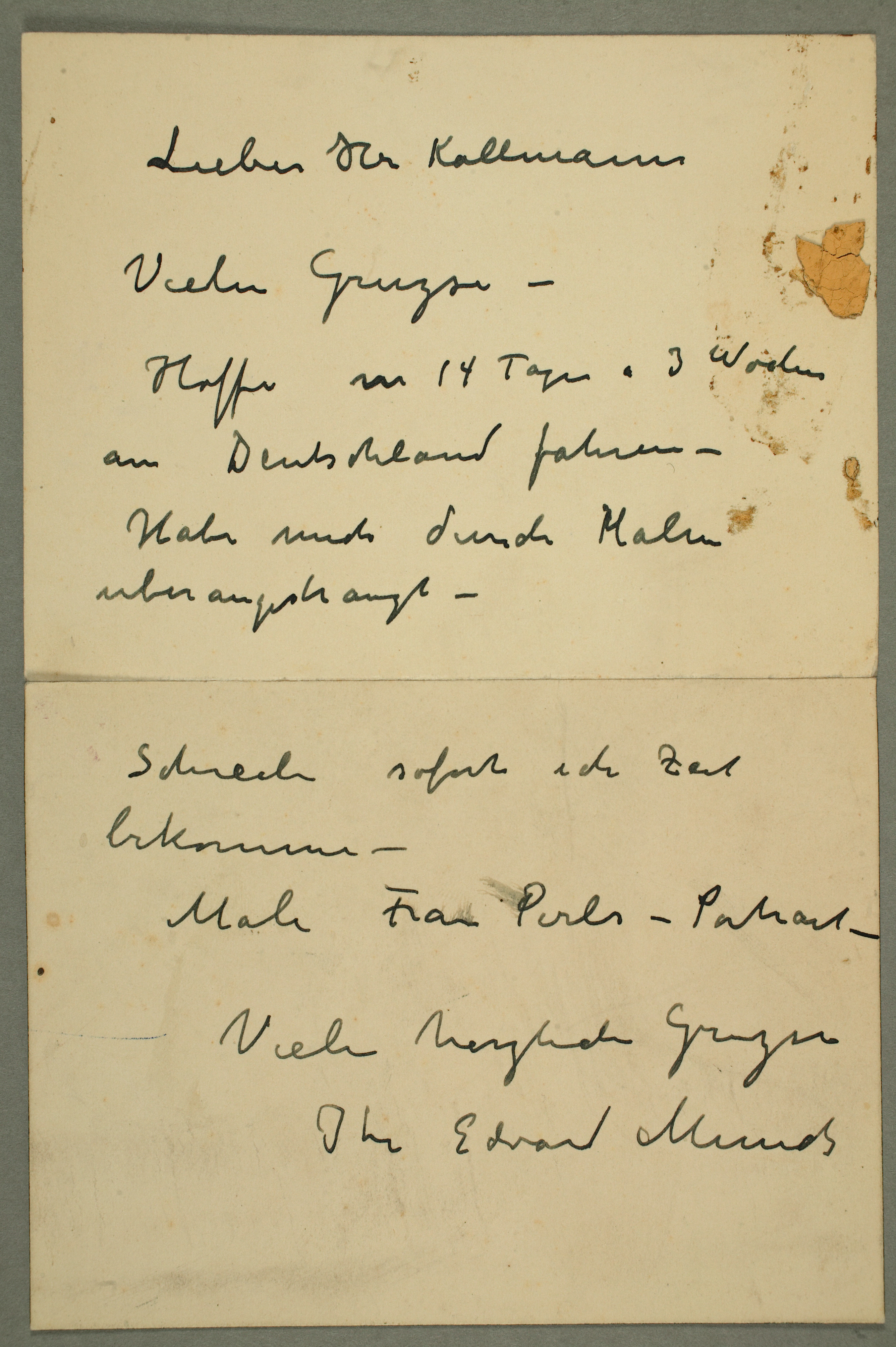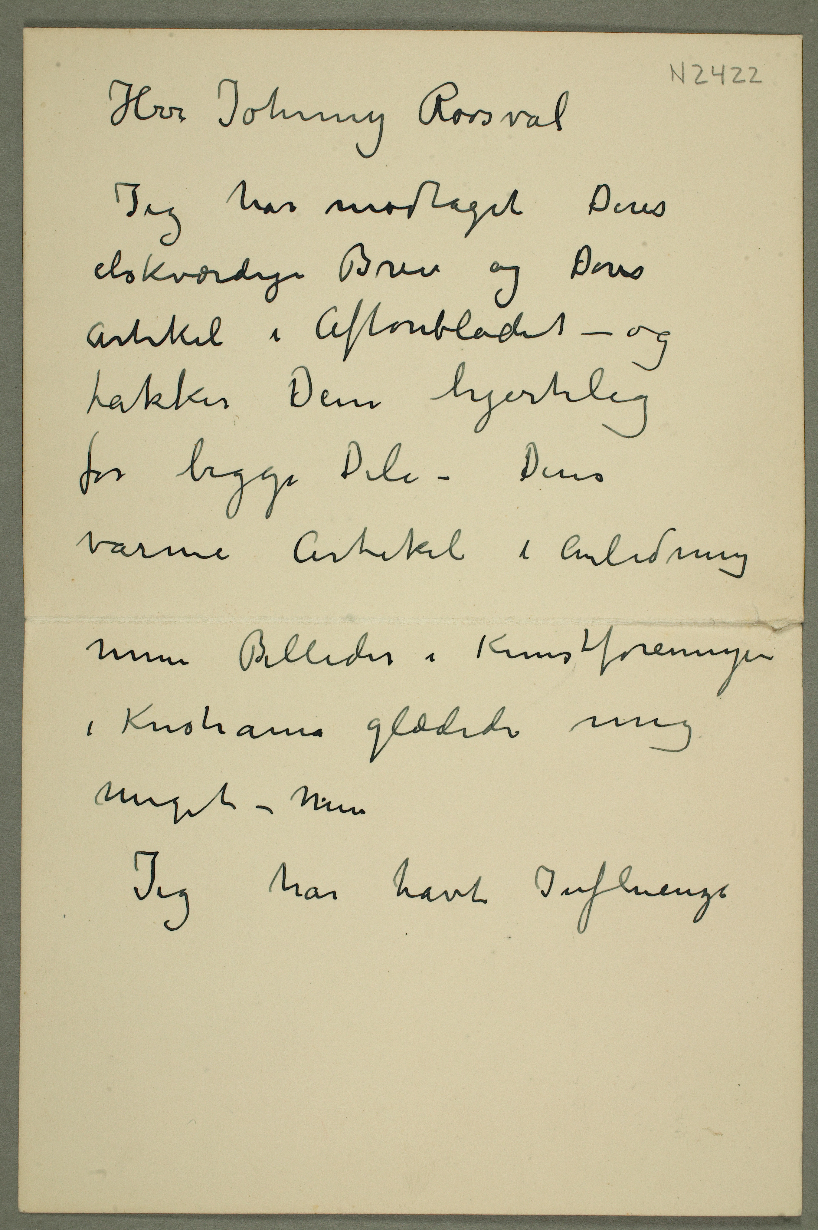MM N 2422, Munchmuseet. Ikke datert. Brevutkast til Albert Kollmann, Johnny Roosval.