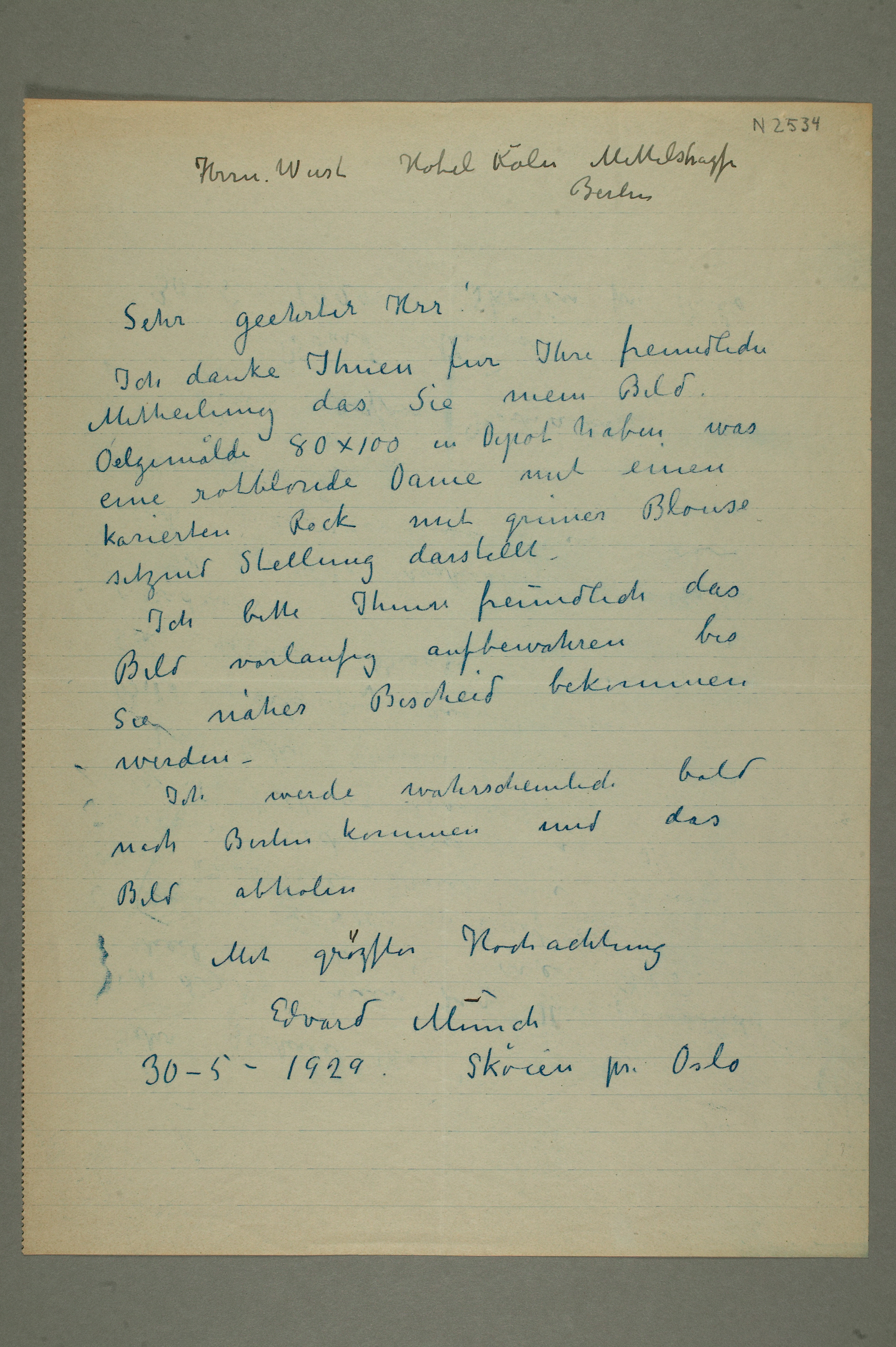 MM N 2534, Munchmuseet. Datert 30.5.1929. Brevutkast til Th. Wust.