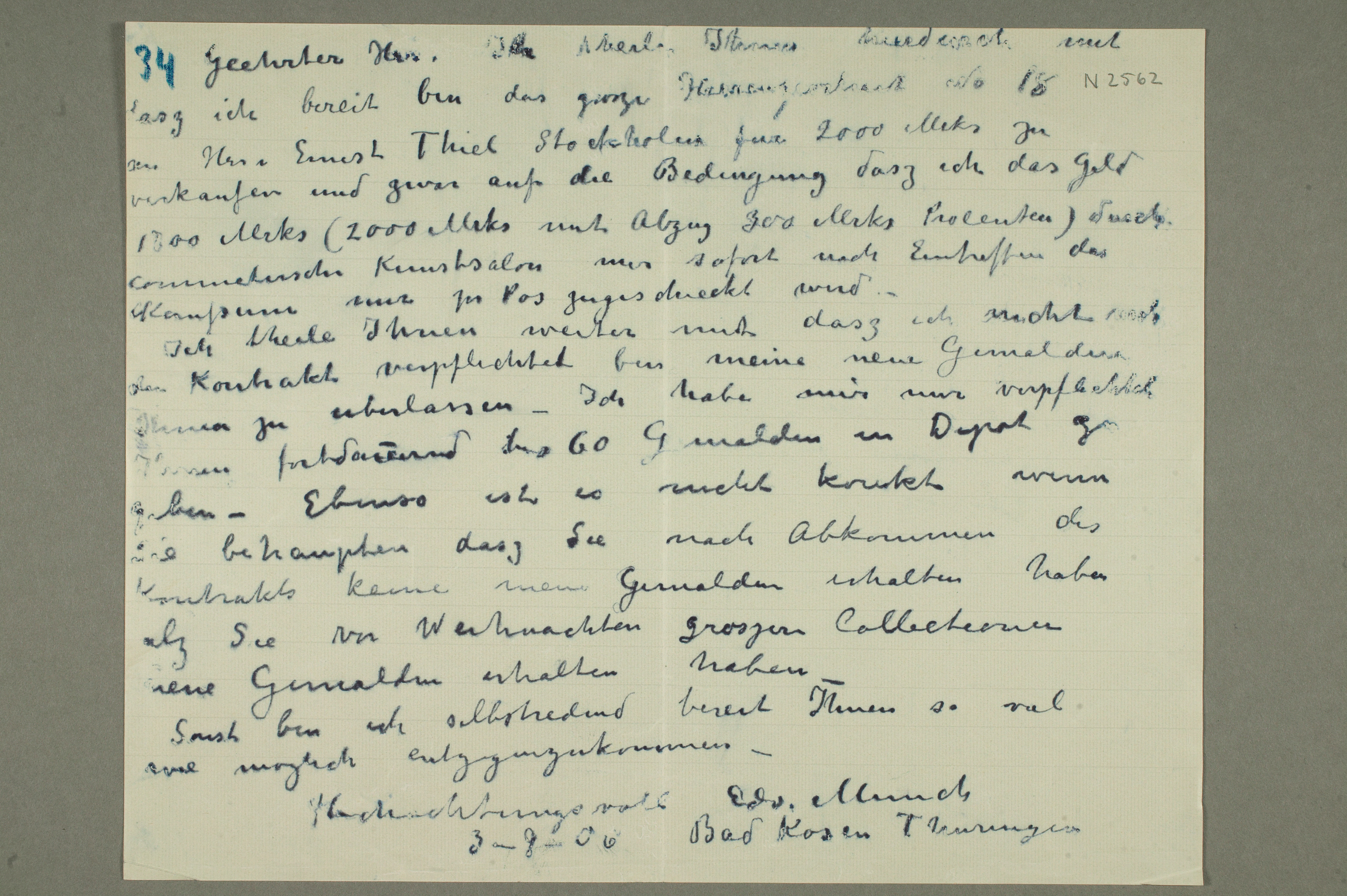 MM N 2562, Munchmuseet. Datert 3.9.1906. Brevutkast til Uidentifisert mann.