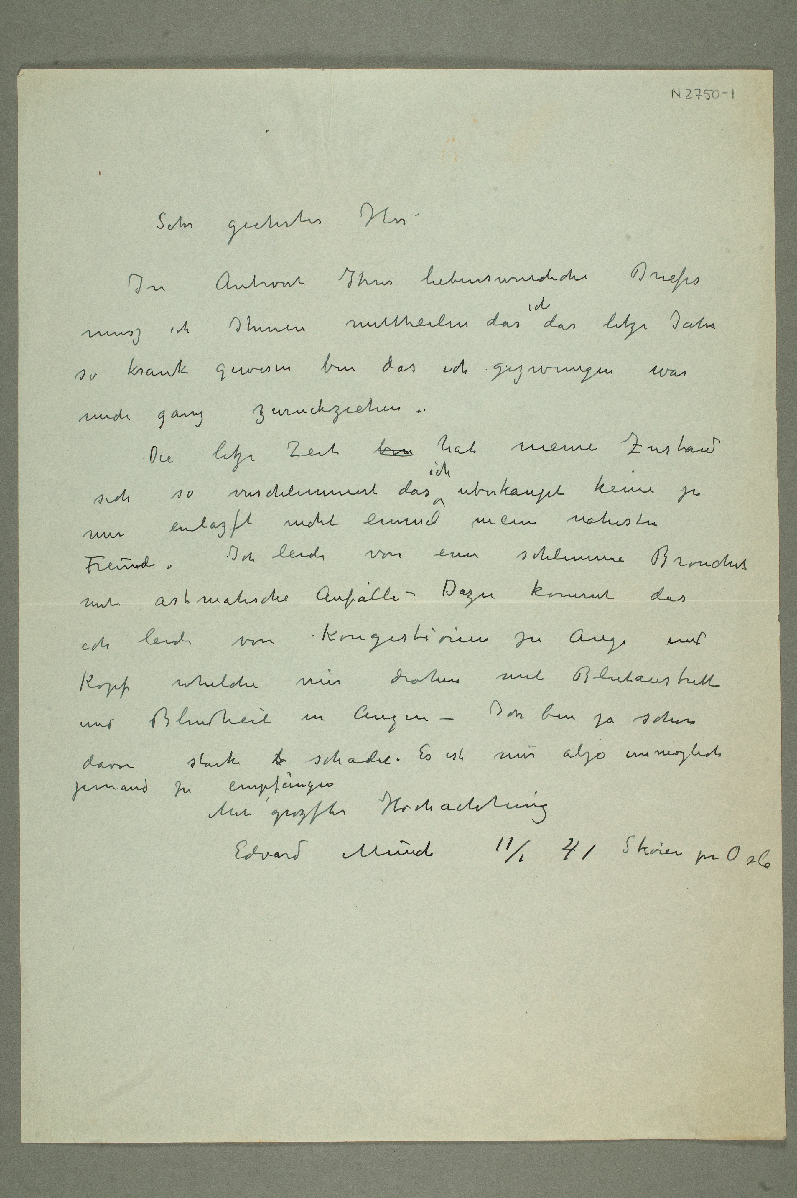 MM N 2750, Munchmuseet. Datert 11.1.1941. Brevutkast til Gustav Deppe.