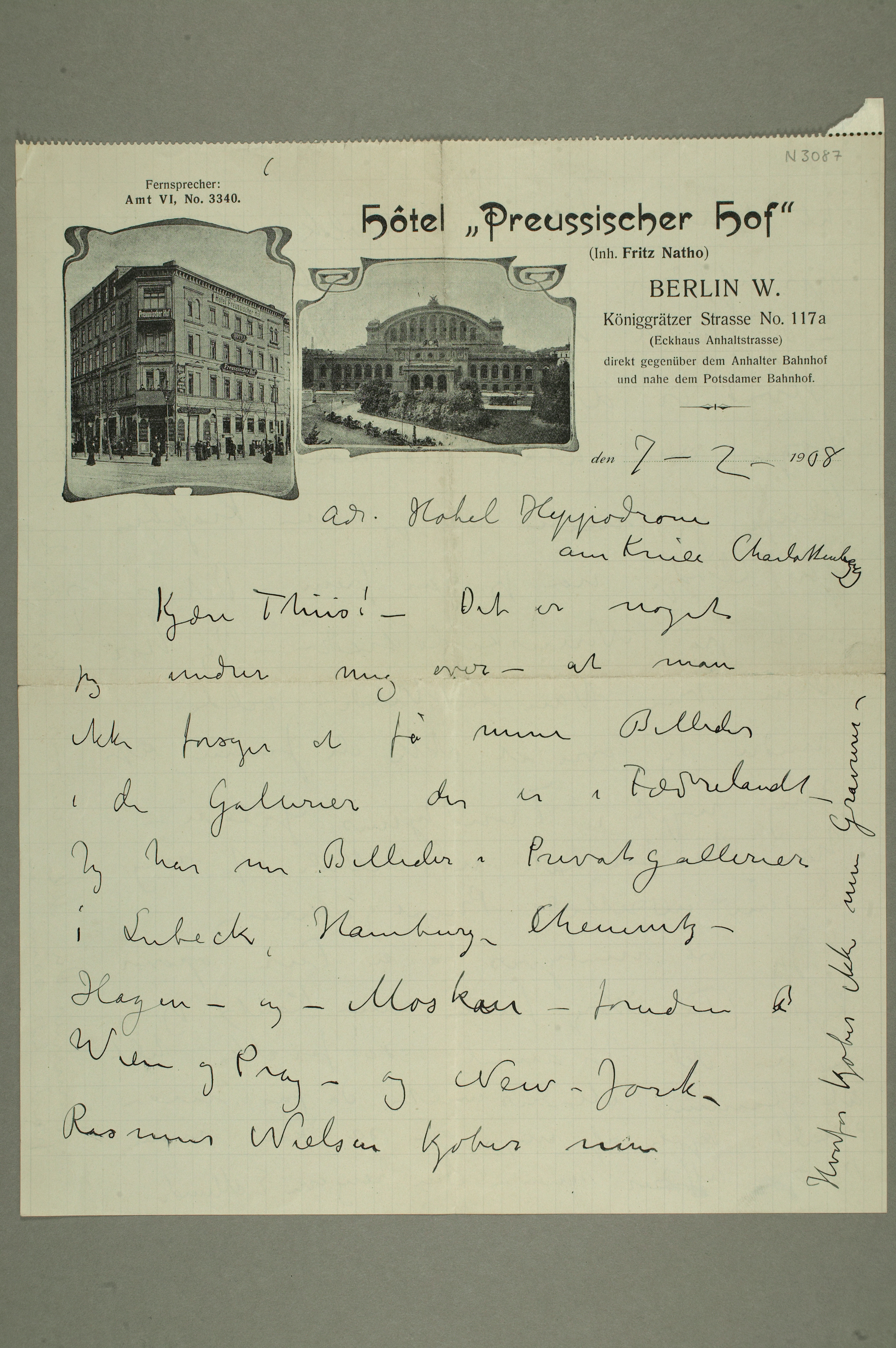 MM N 3087, Munchmuseet. Datert 7.2.1908. Brev til Jens Thiis