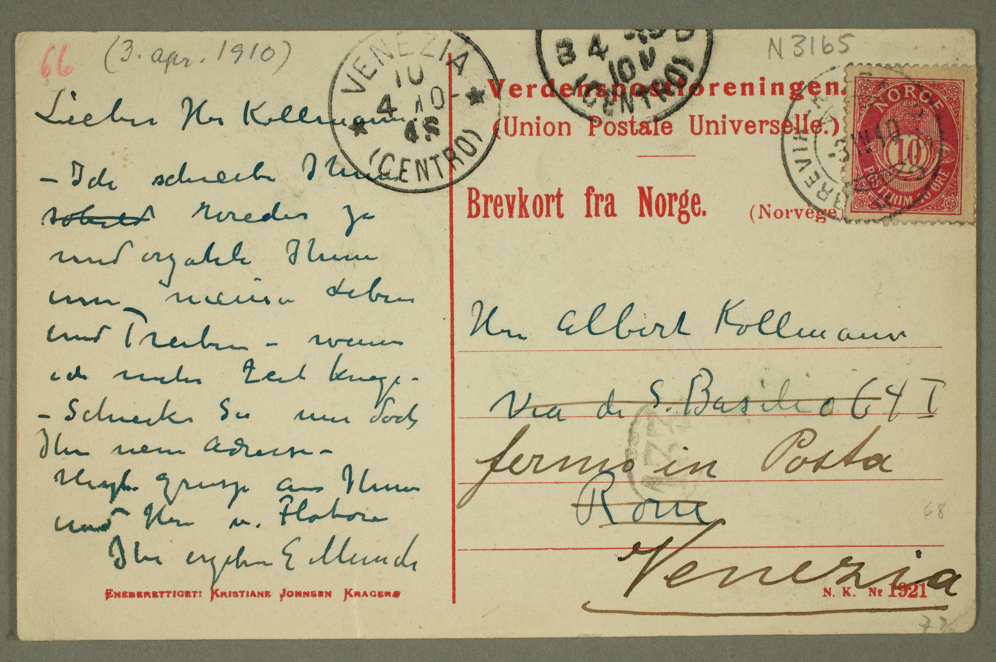 MM N 3165, Munchmuseet. Datert 3.4.1910. Brev til Albert Kollmann