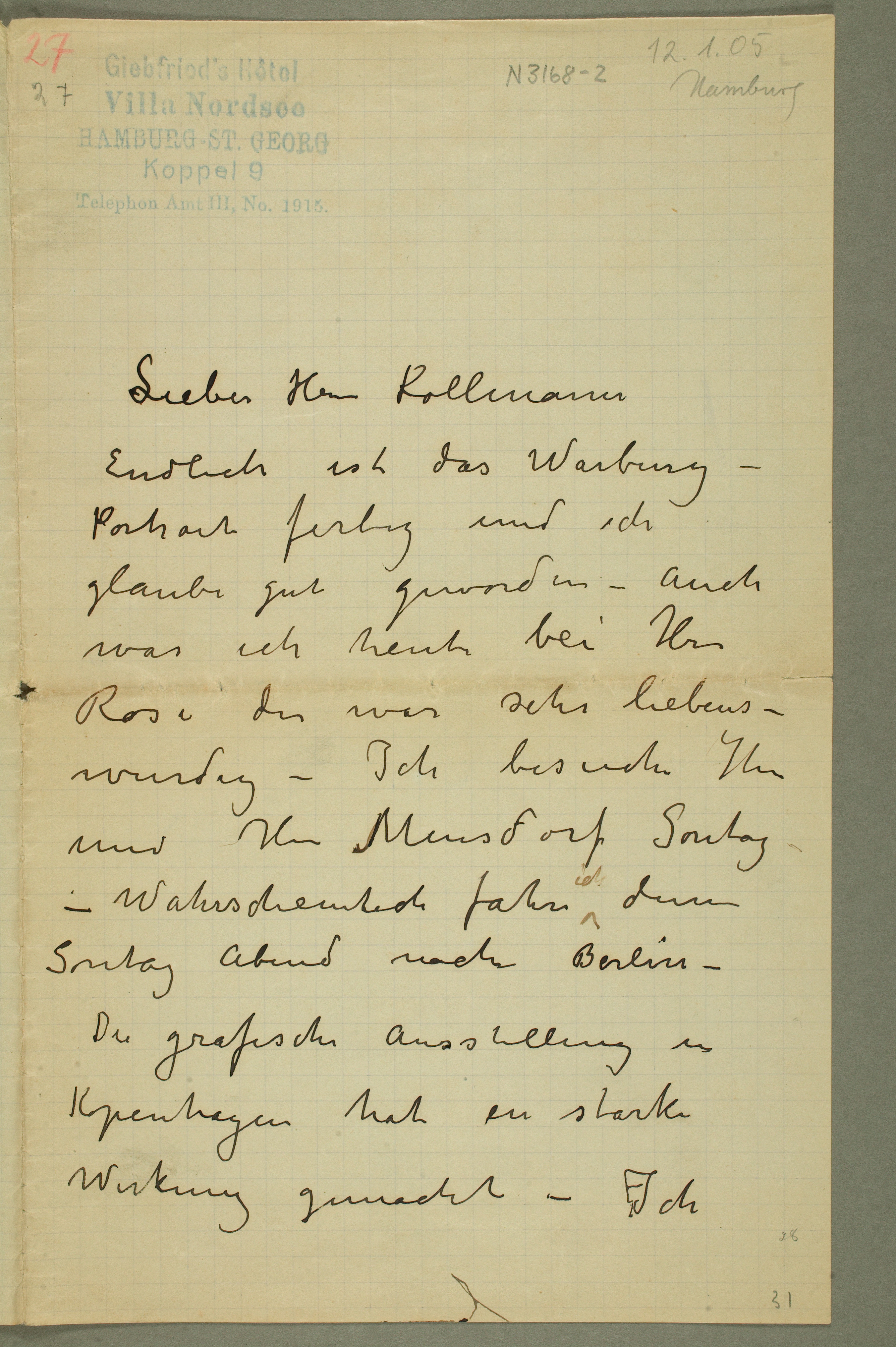 MM N 3168, Munchmuseet. Datert 12.1.1905. Brev til Albert Kollmann