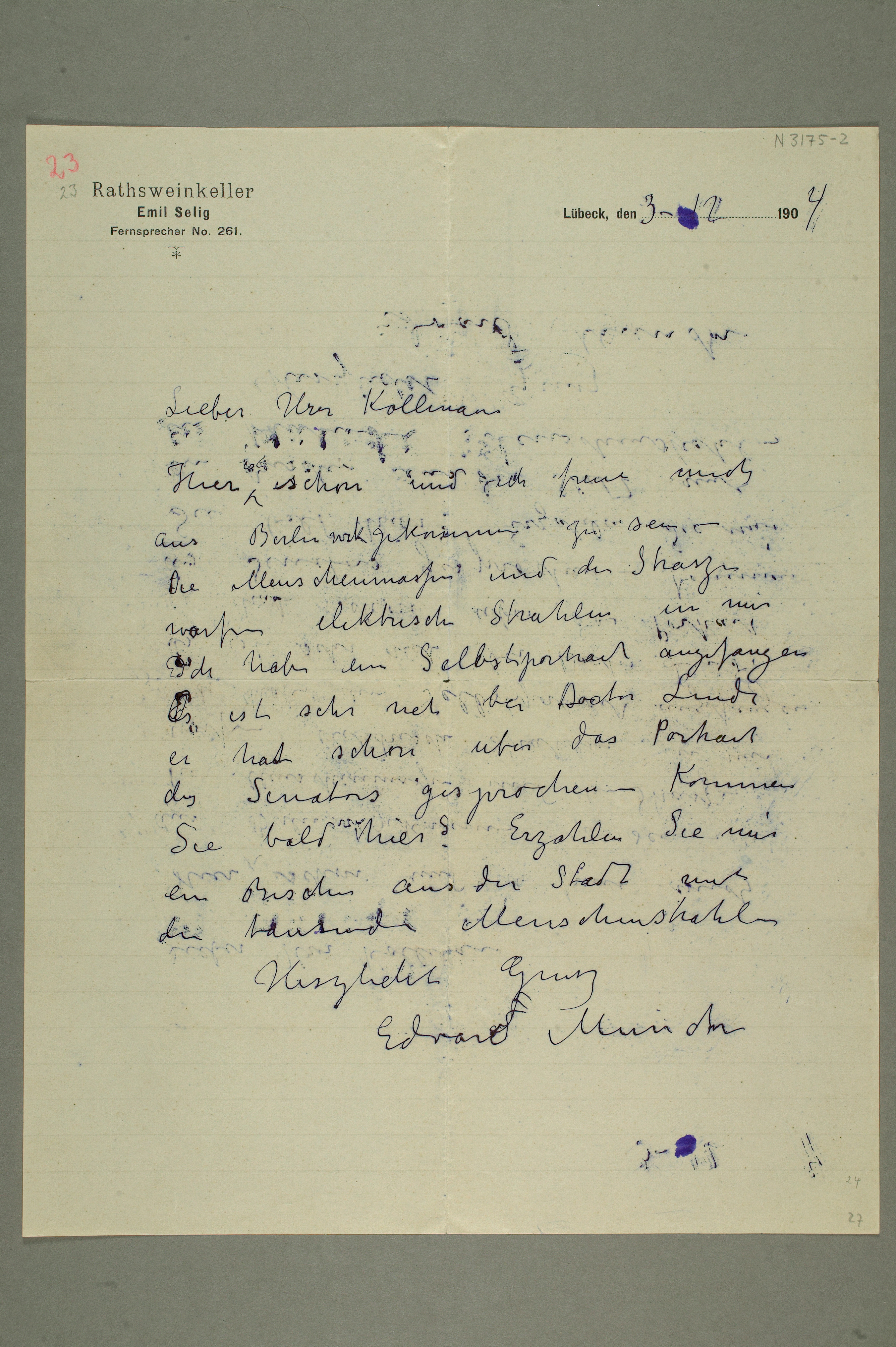 MM N 3175, Munchmuseet. Datert 9.12.1904. Brev til Albert Kollmann