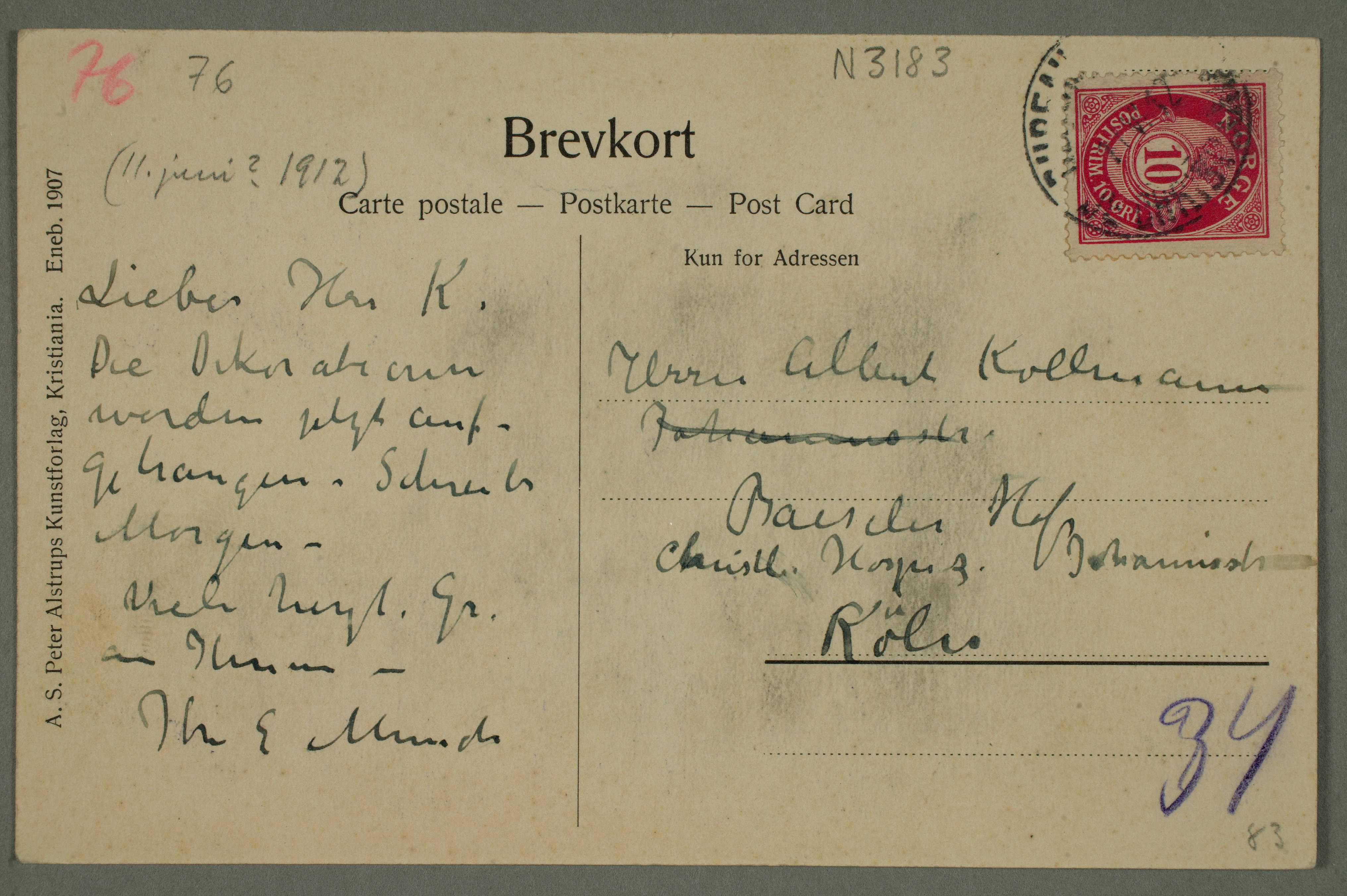 MM N 3183, Munchmuseet. Datert 11.6.1912. Brev til Albert Kollmann