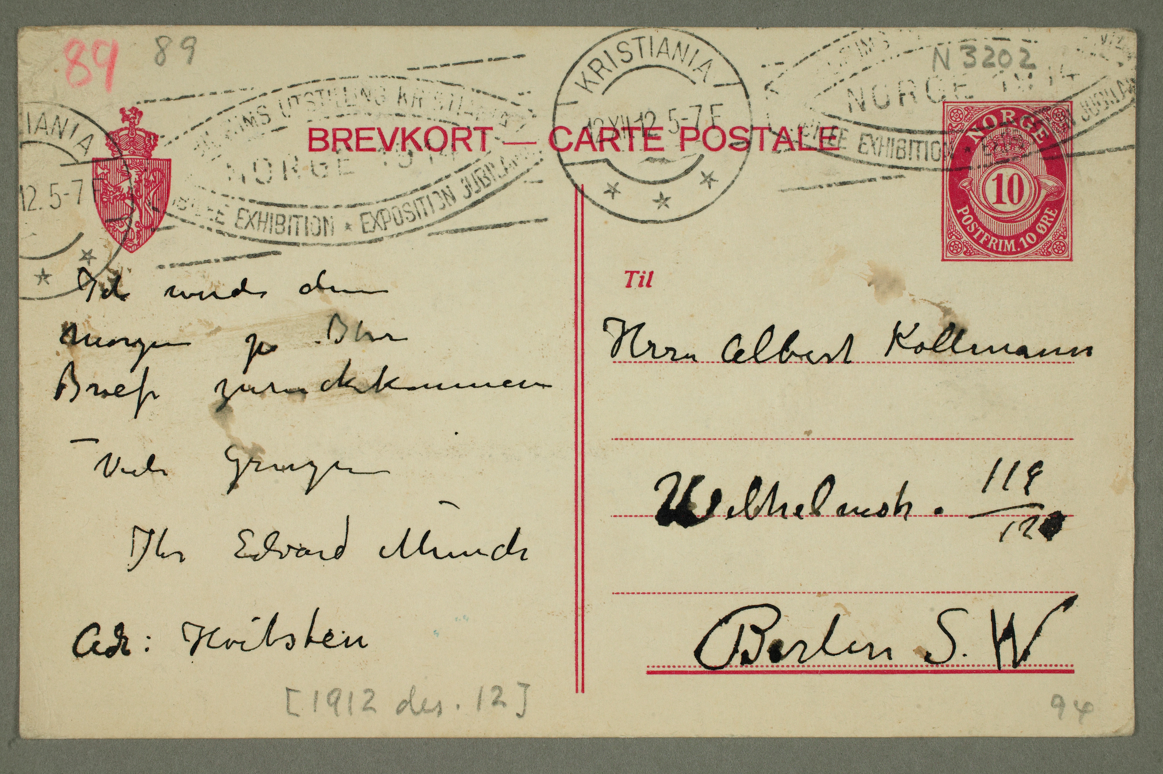 MM N 3202, Munchmuseet. Datert 12.12.1912. Brev til Albert Kollmann