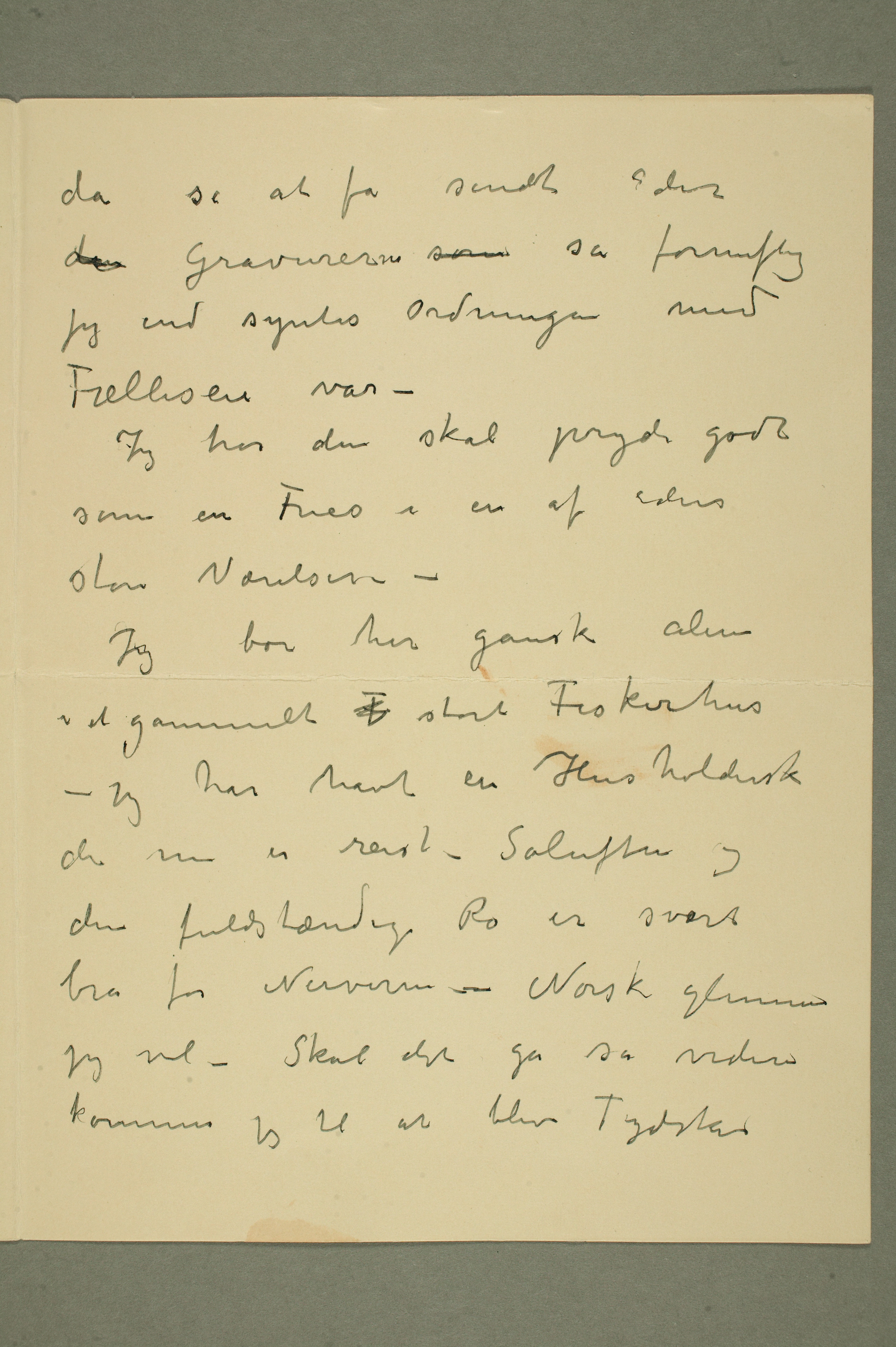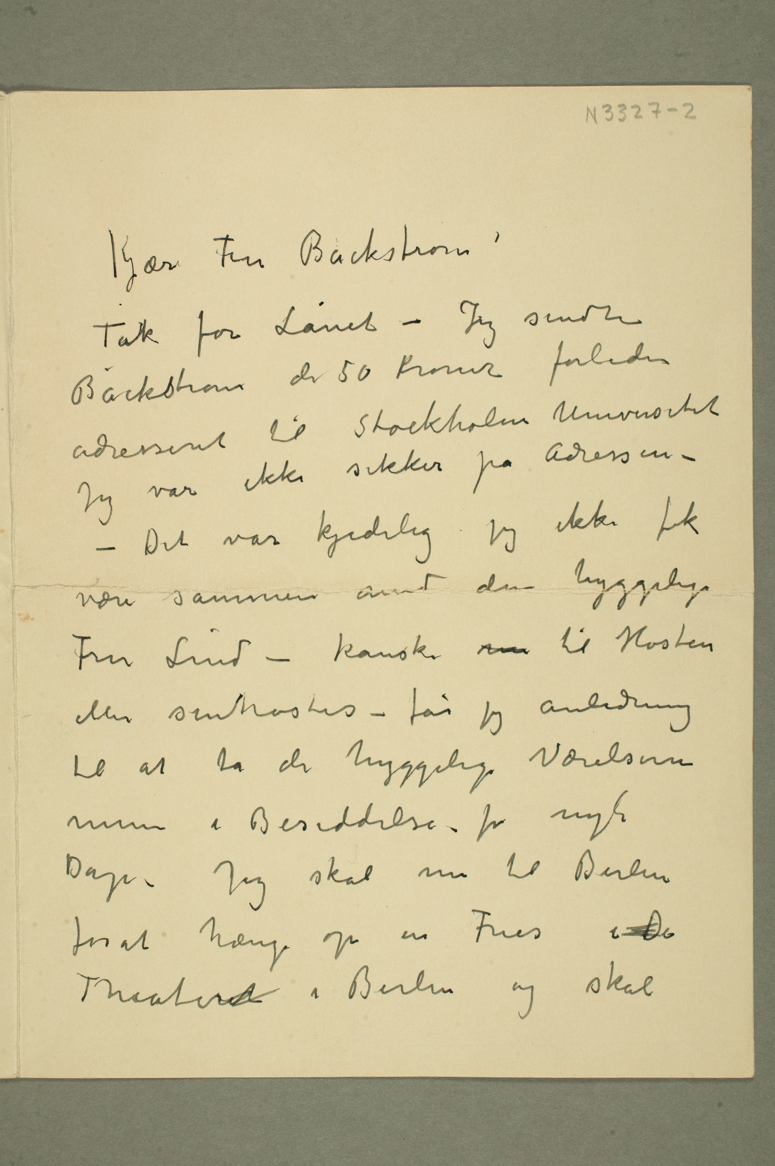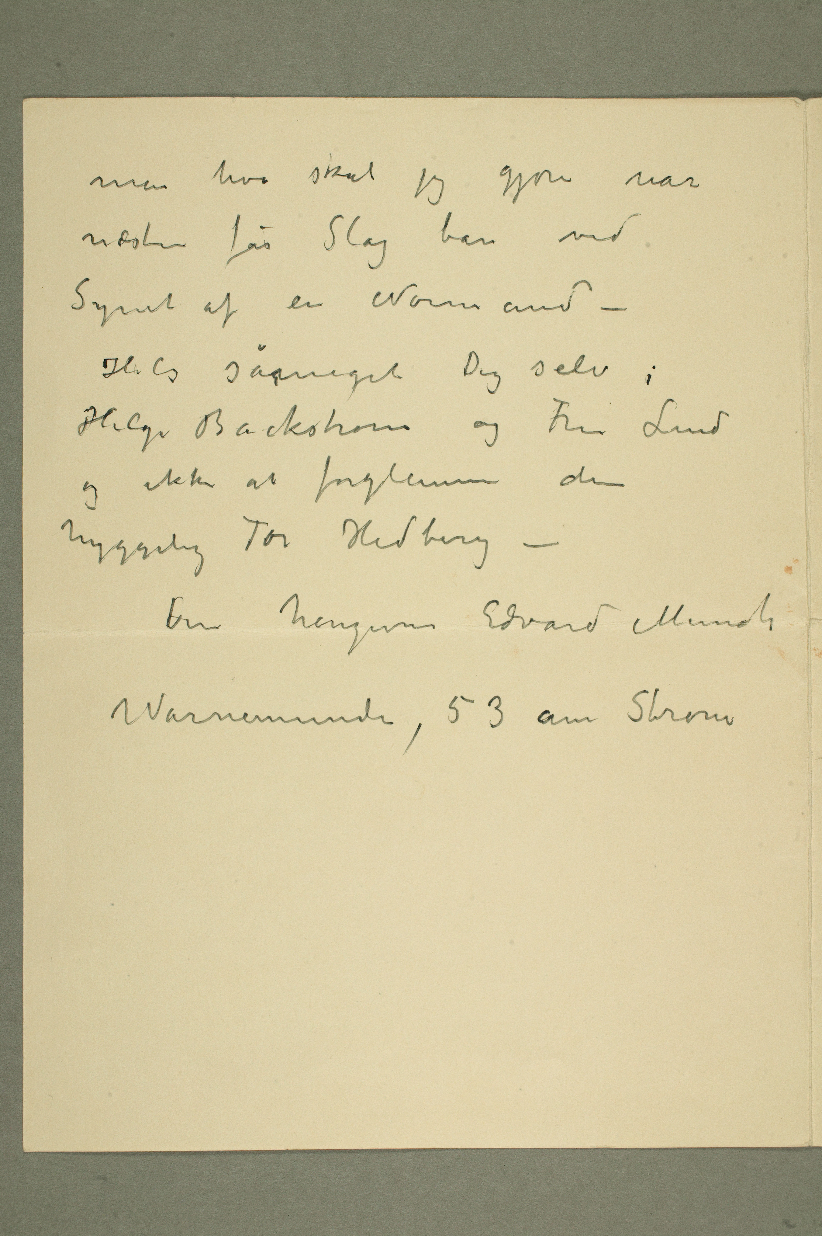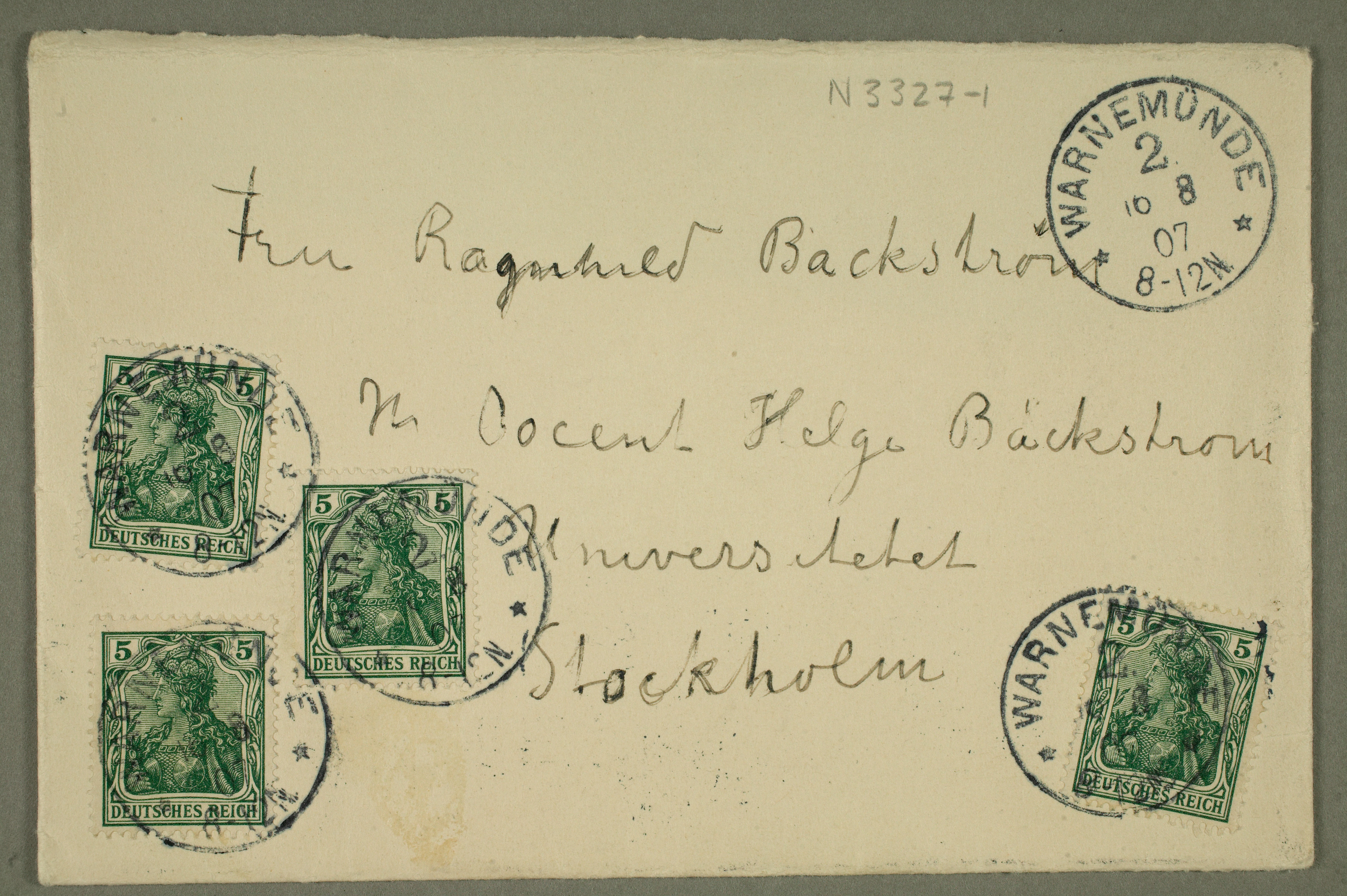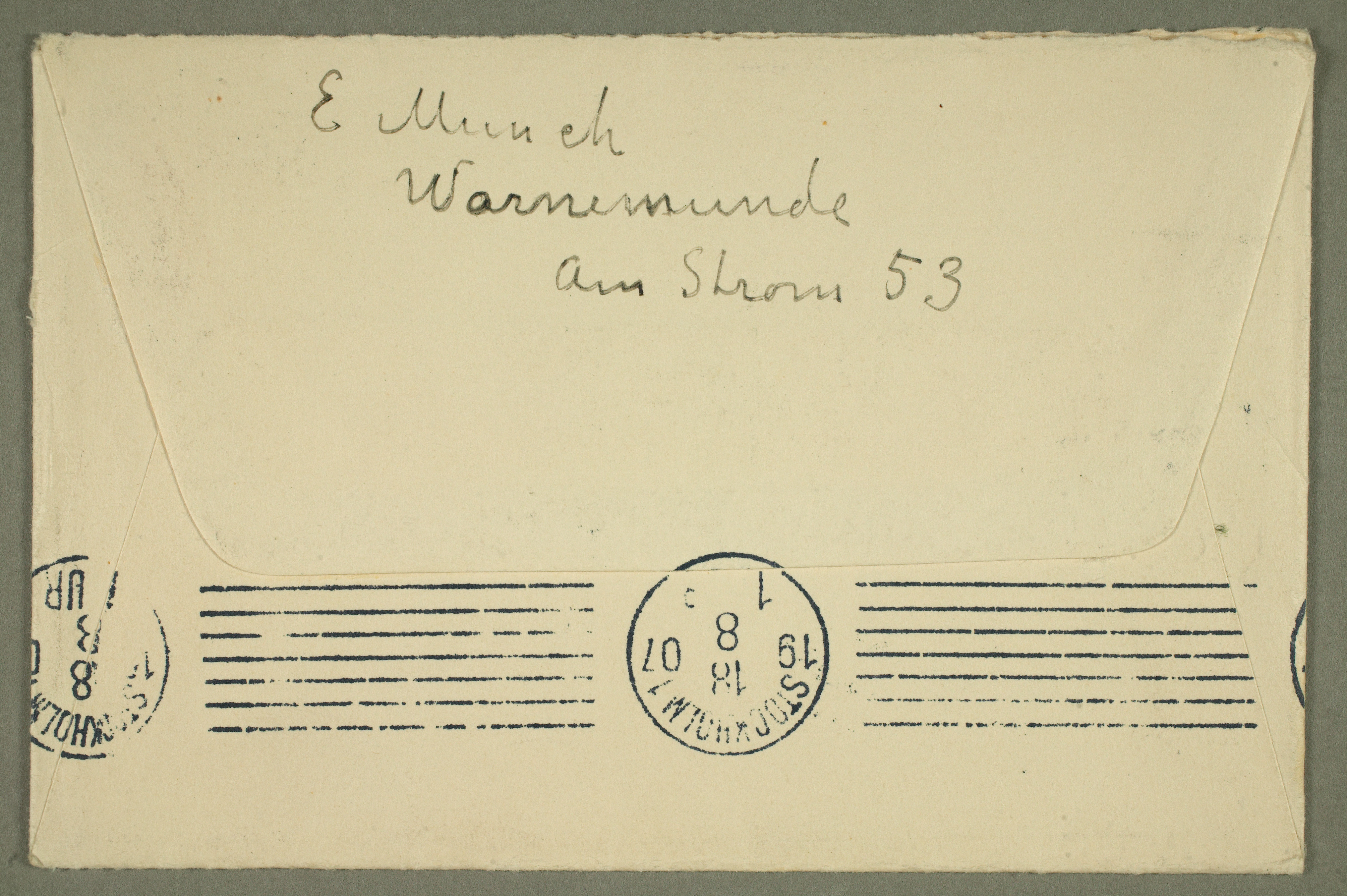 MM N 3327, Munchmuseet. Datert 16.8.1907. Brev til Helge Bäckström, Ragnhild Bäckström