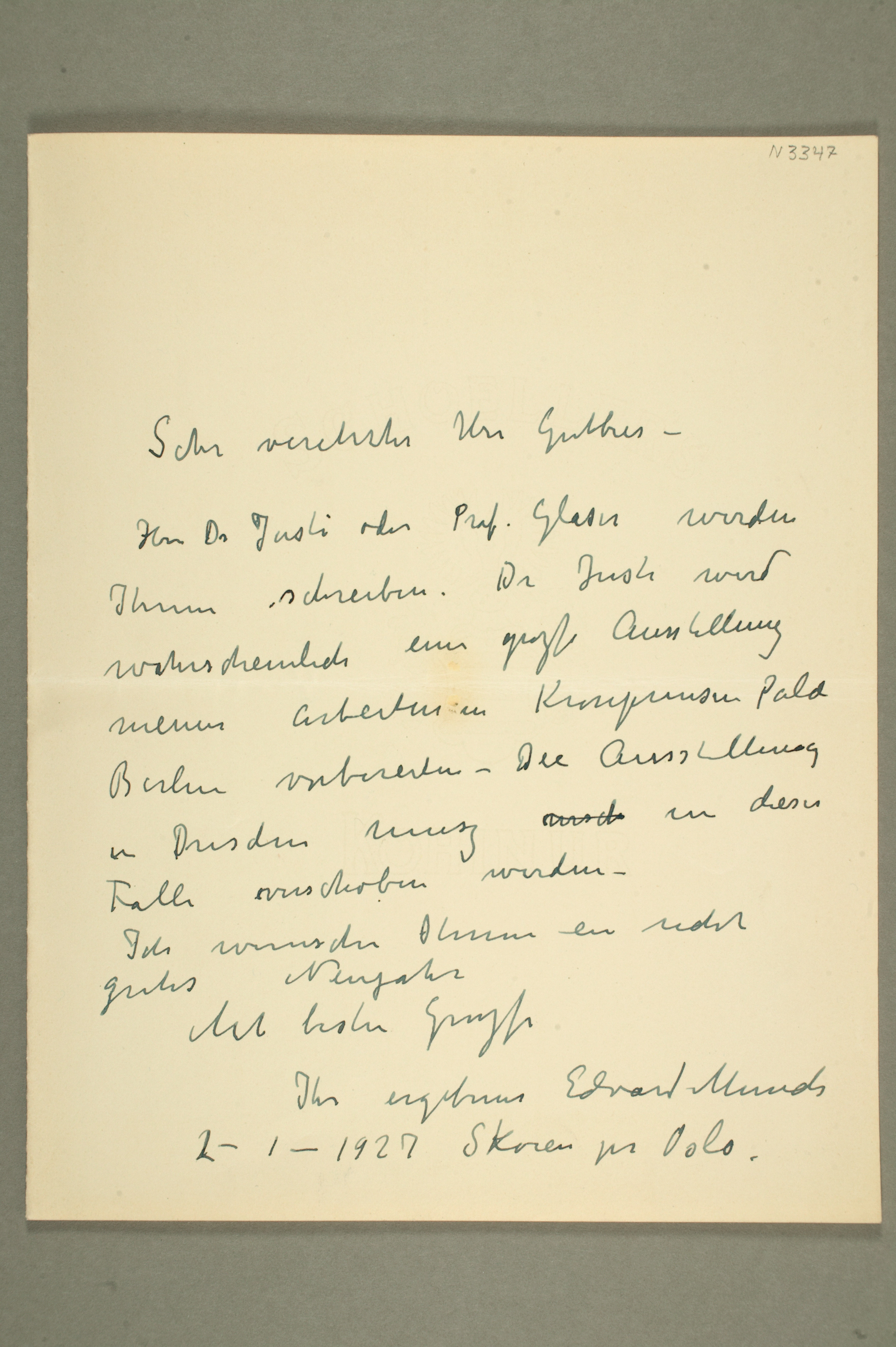MM N 3347, Munchmuseet. Datert 2.1.1927. Brevutkast til Ludwig Wilhelm Gutbier, Galerie Ernst Arnold.