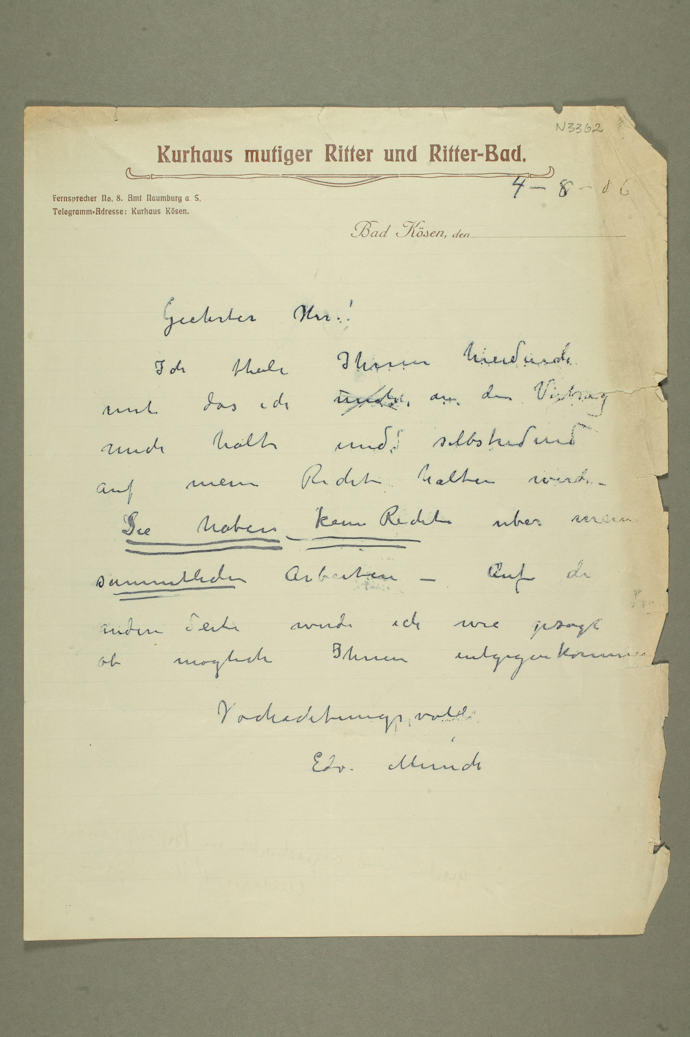 MM N 3362, Munchmuseet. Datert 4.8.1906. Brevutkast til Commeter'sche Kunsthandlung.