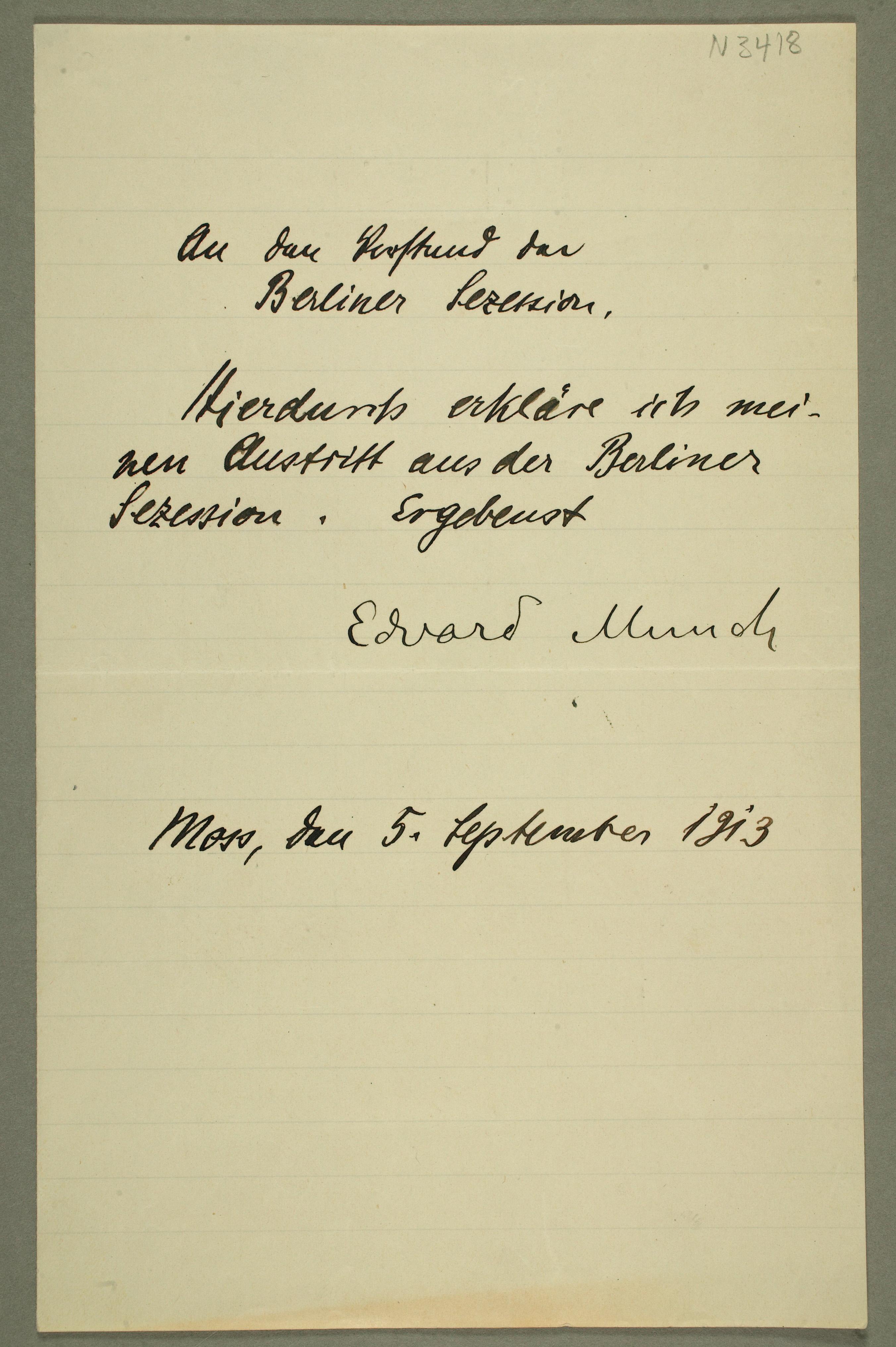 MM N 3418, Munchmuseet. Datert 5.9.1913. Brevutkast til Berliner Secession.