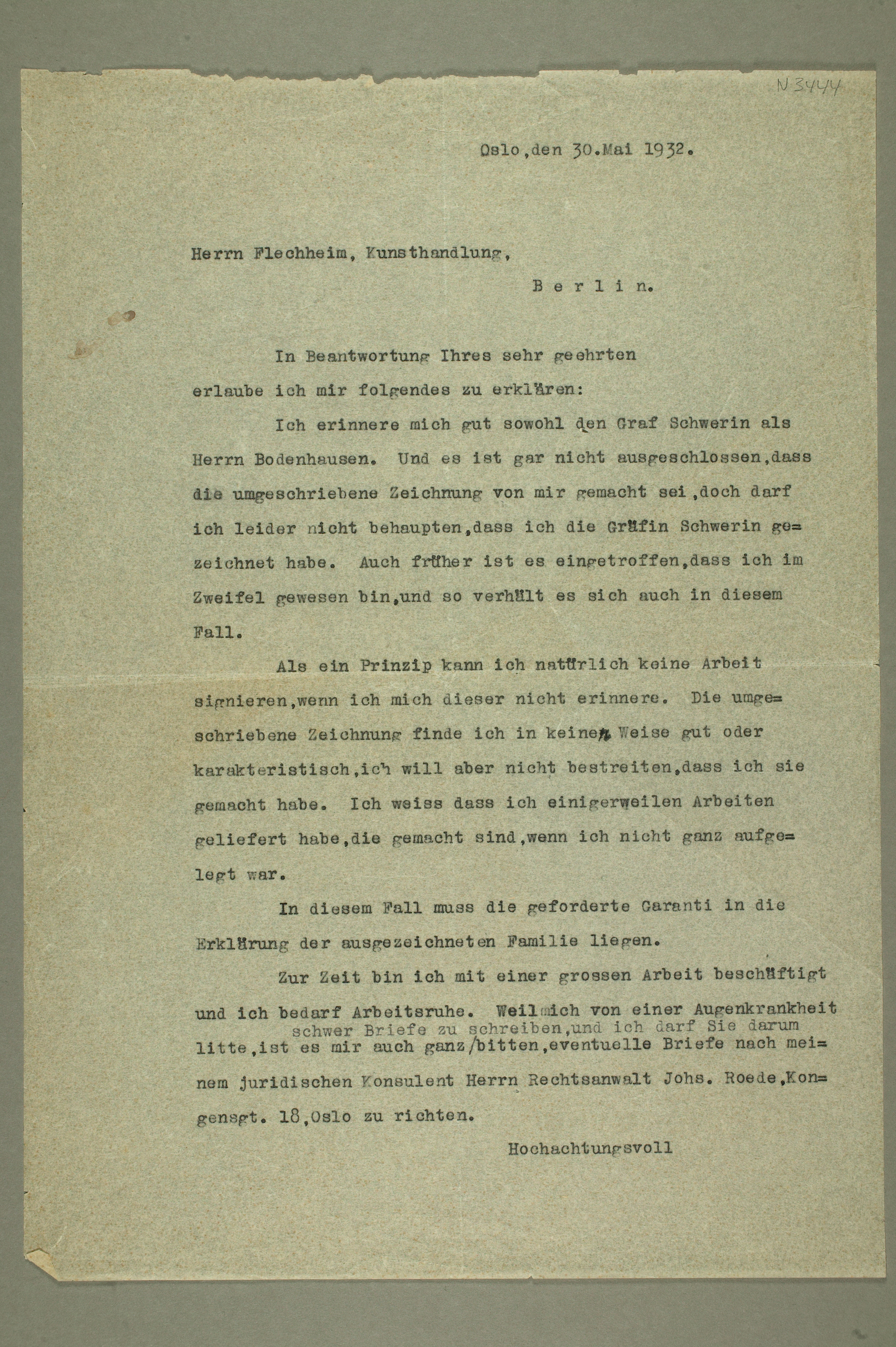 MM N 3444, Munchmuseet. Datert 30.5.1932. Brevutkast til Alfred Flechtheim.