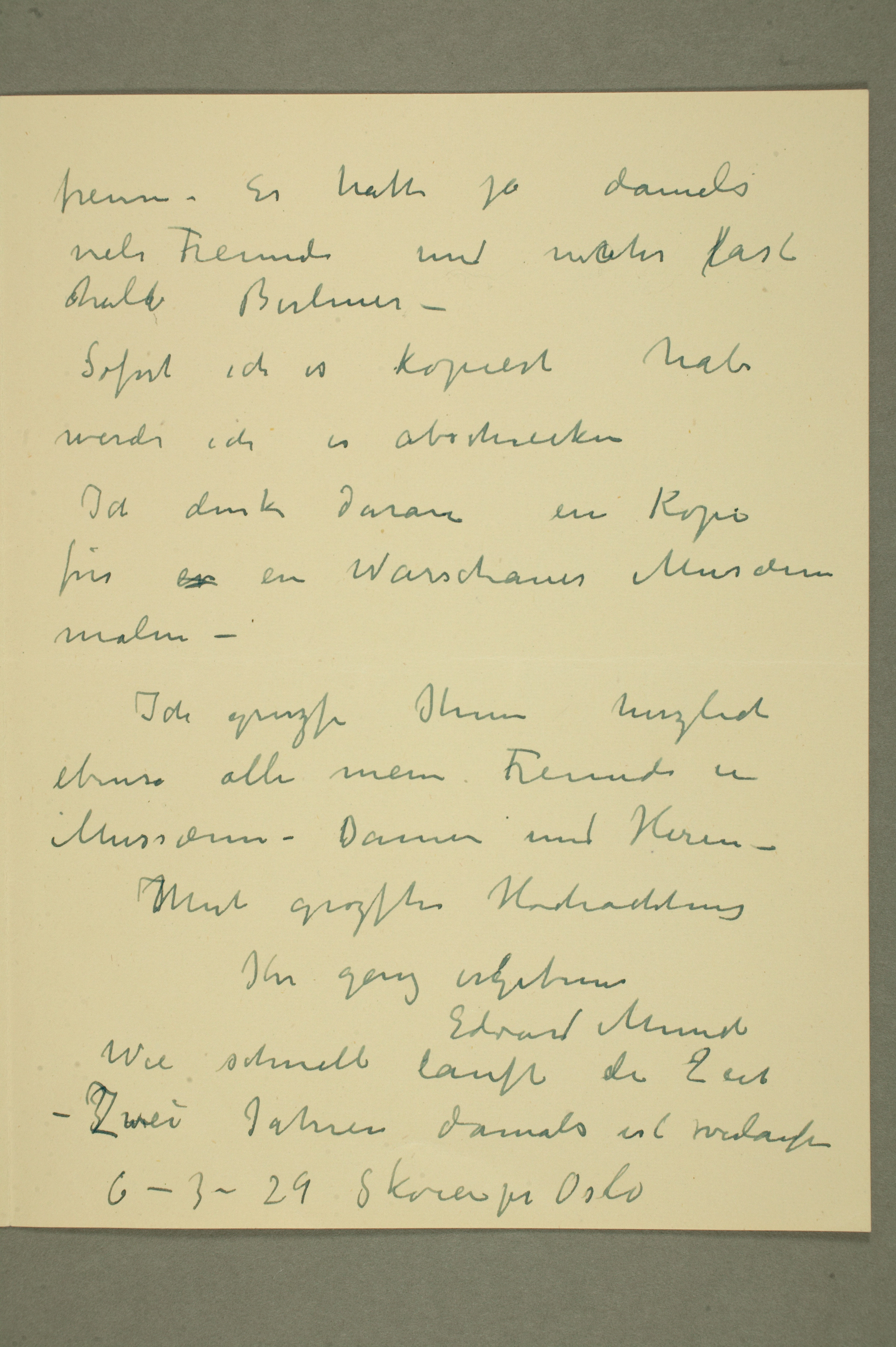 MM N 3446, Munchmuseet. Datert 6.3.1929. Brevutkast til Ludwig Justi, Nationalgalerie (Staatliche Museen zu Berlin).