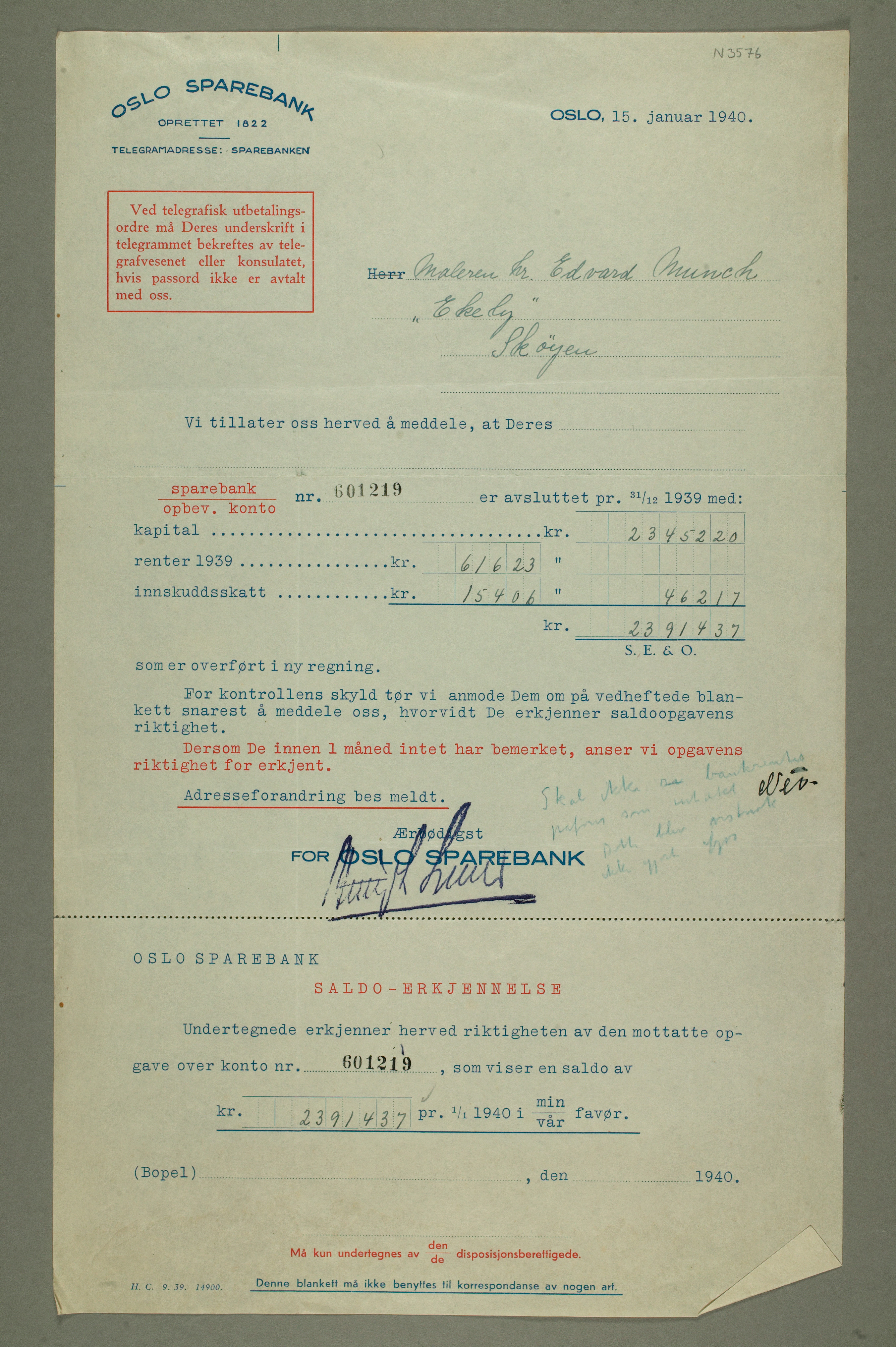 Filologisk kommentar: Munchs påskrift på brev fra Oslo Sparebank