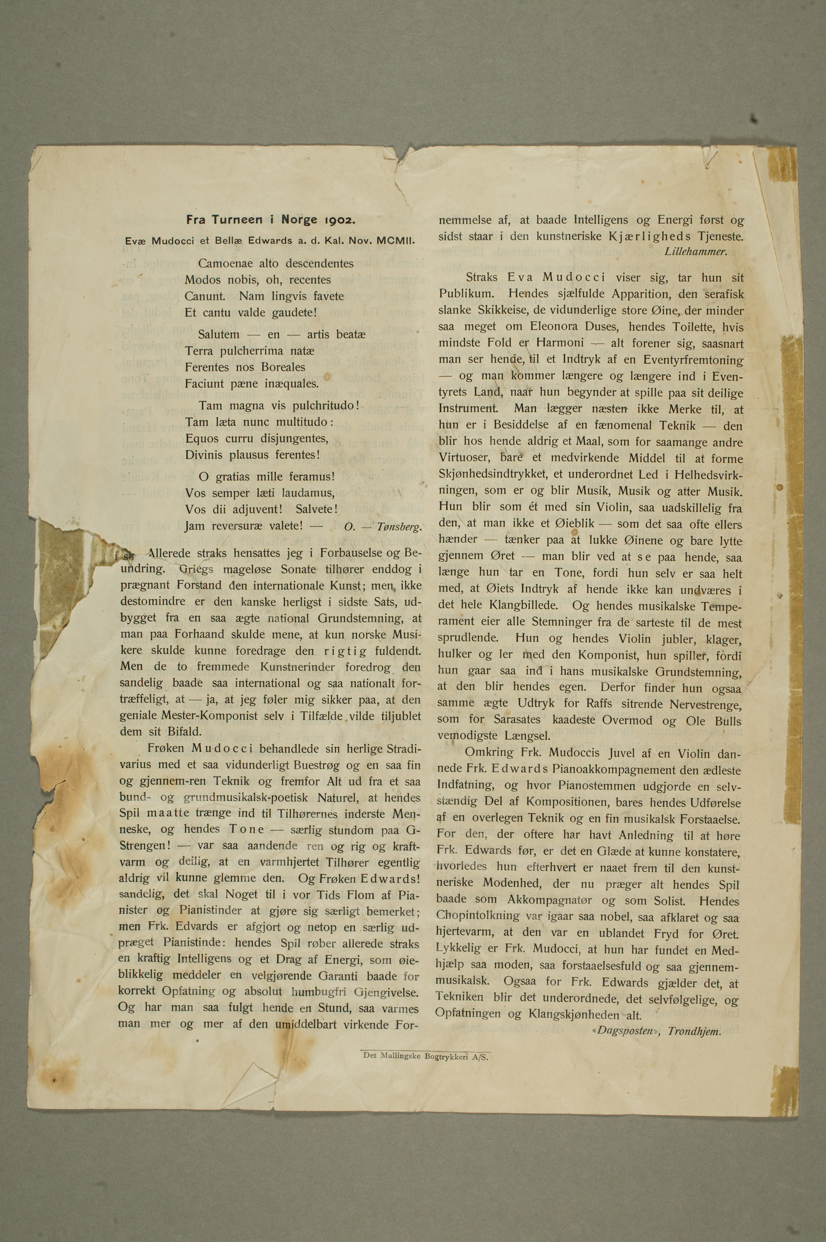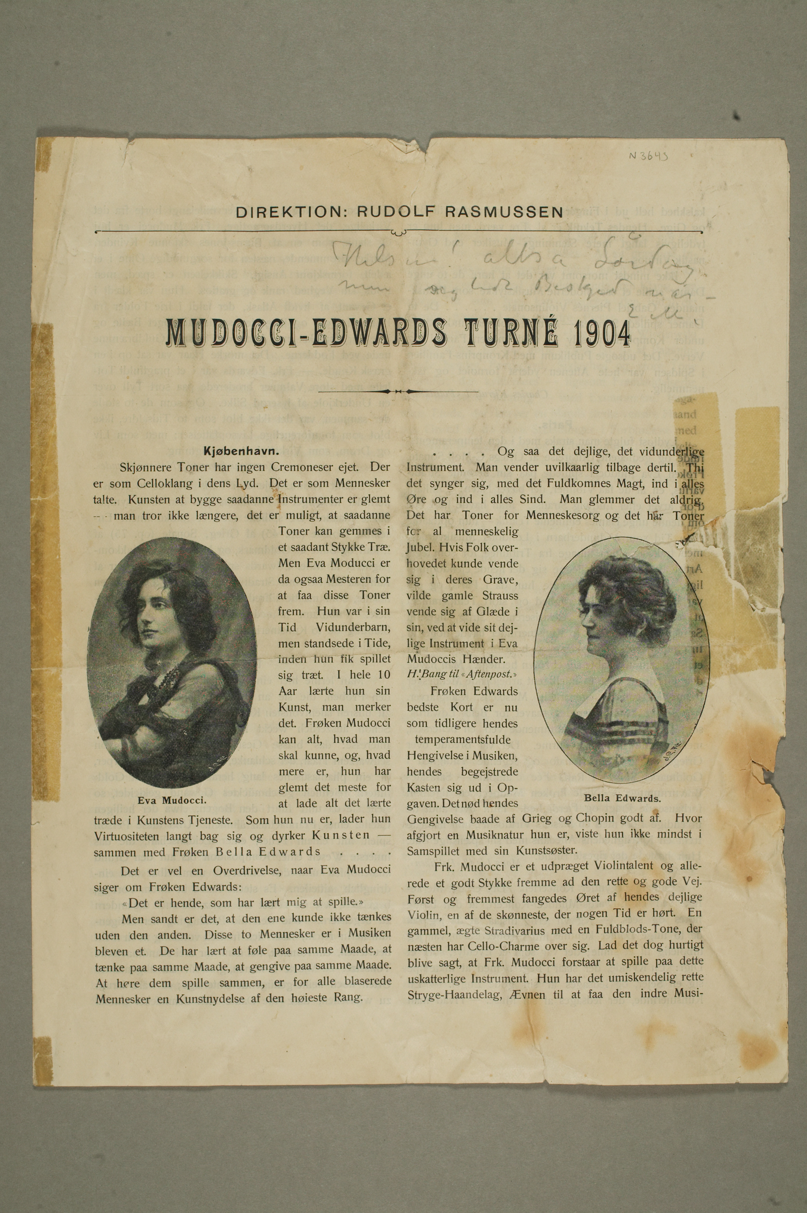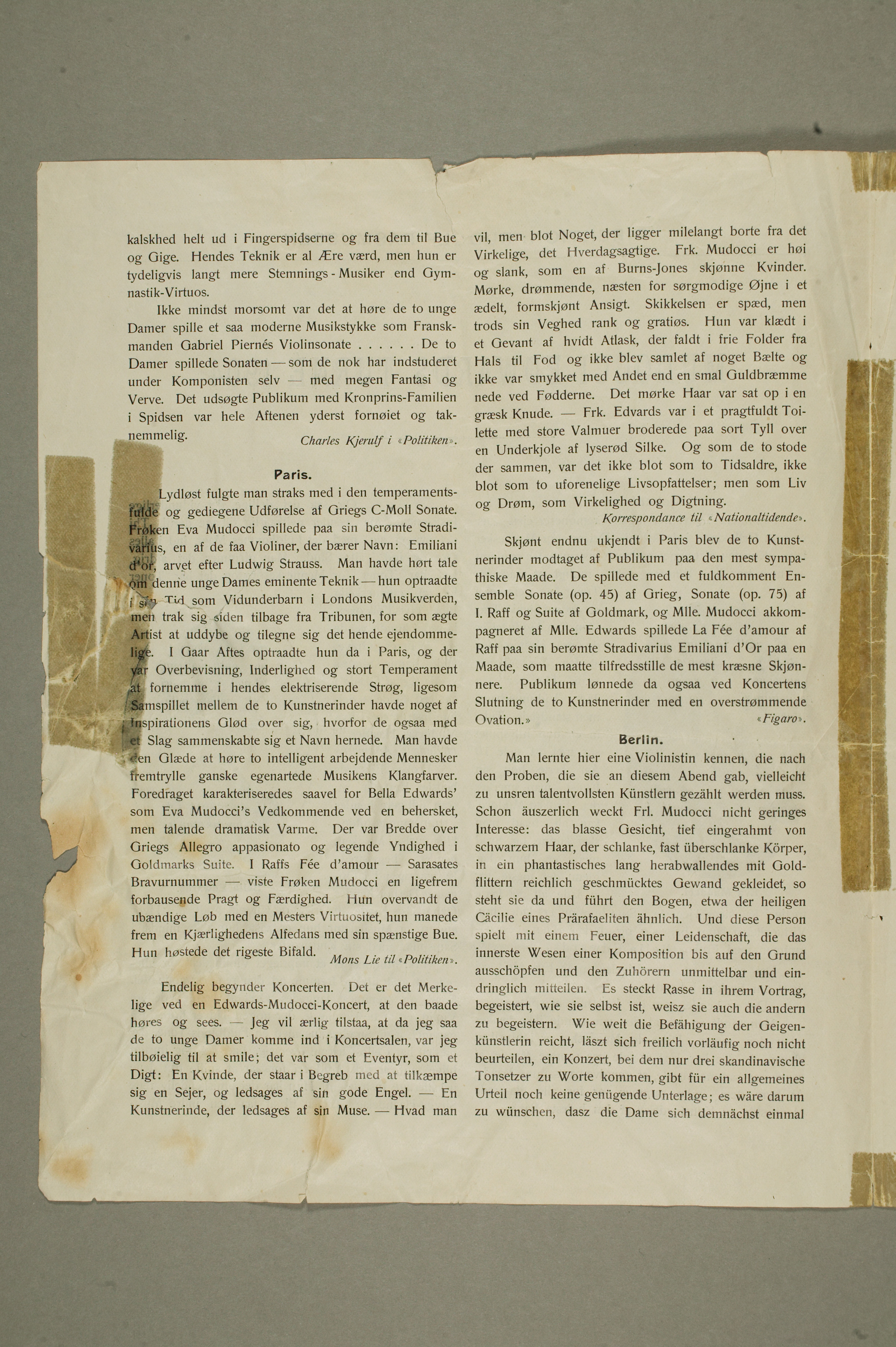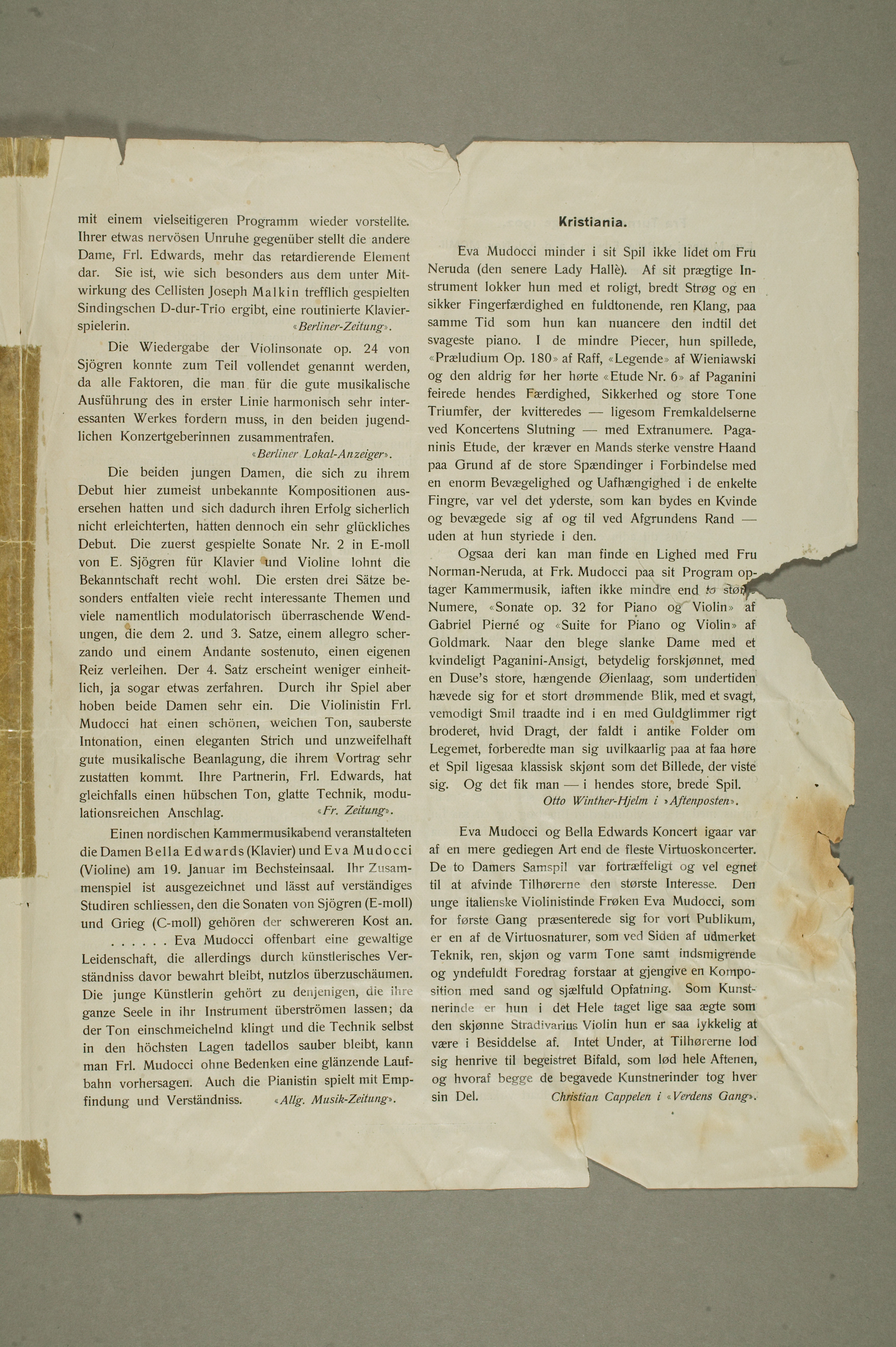 Filologisk kommentar: Brevutkast på avisutklipp med overskriften: «Mudocci-Edwards turné 1904».